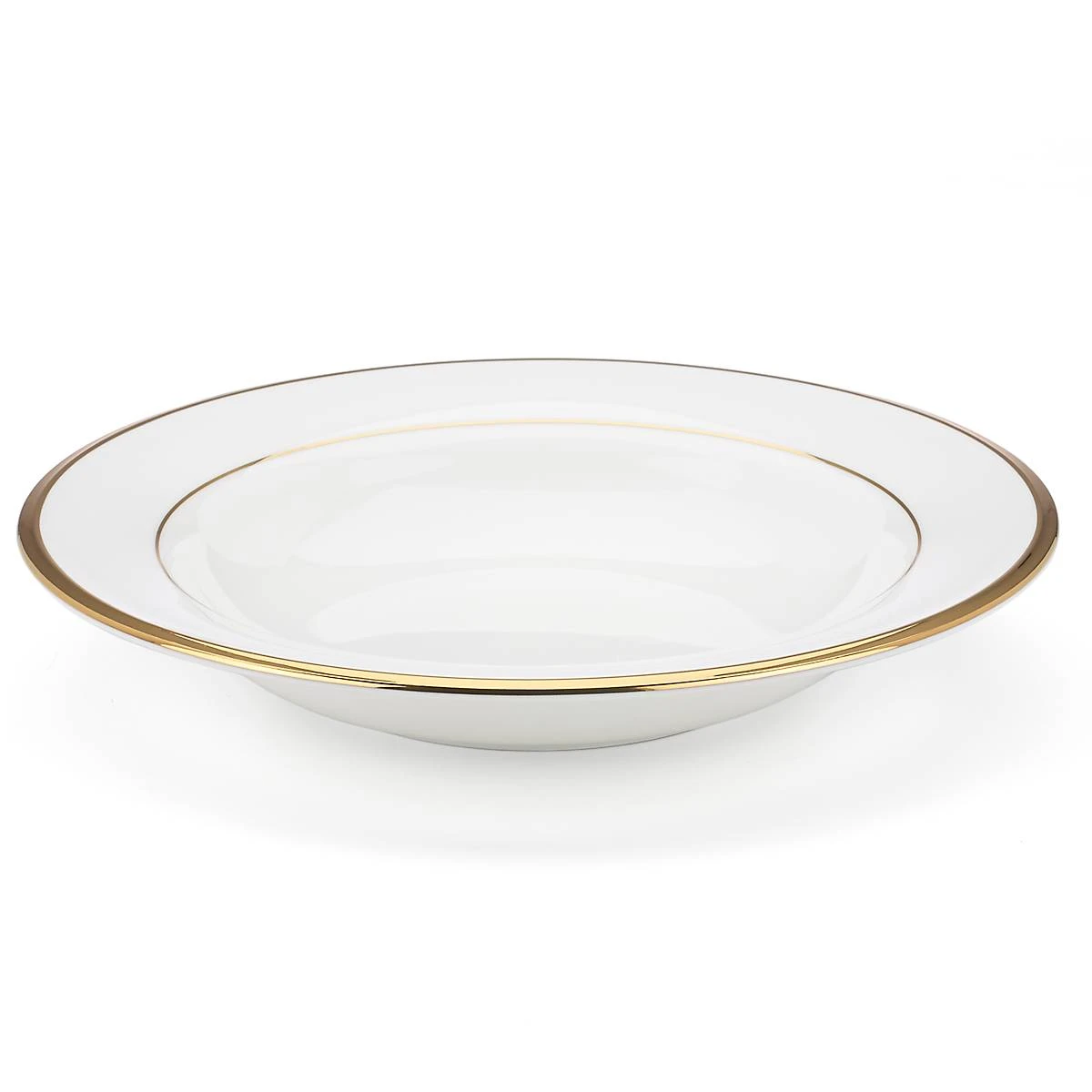 This rimmed pasta and soup bowl is made of durable white bone china, and trimmed with lavish 24-karat gold accents that shimmer under the light of candles for a sophisticated addition to the table. This item is dishwasher-safe, for added convenience.
