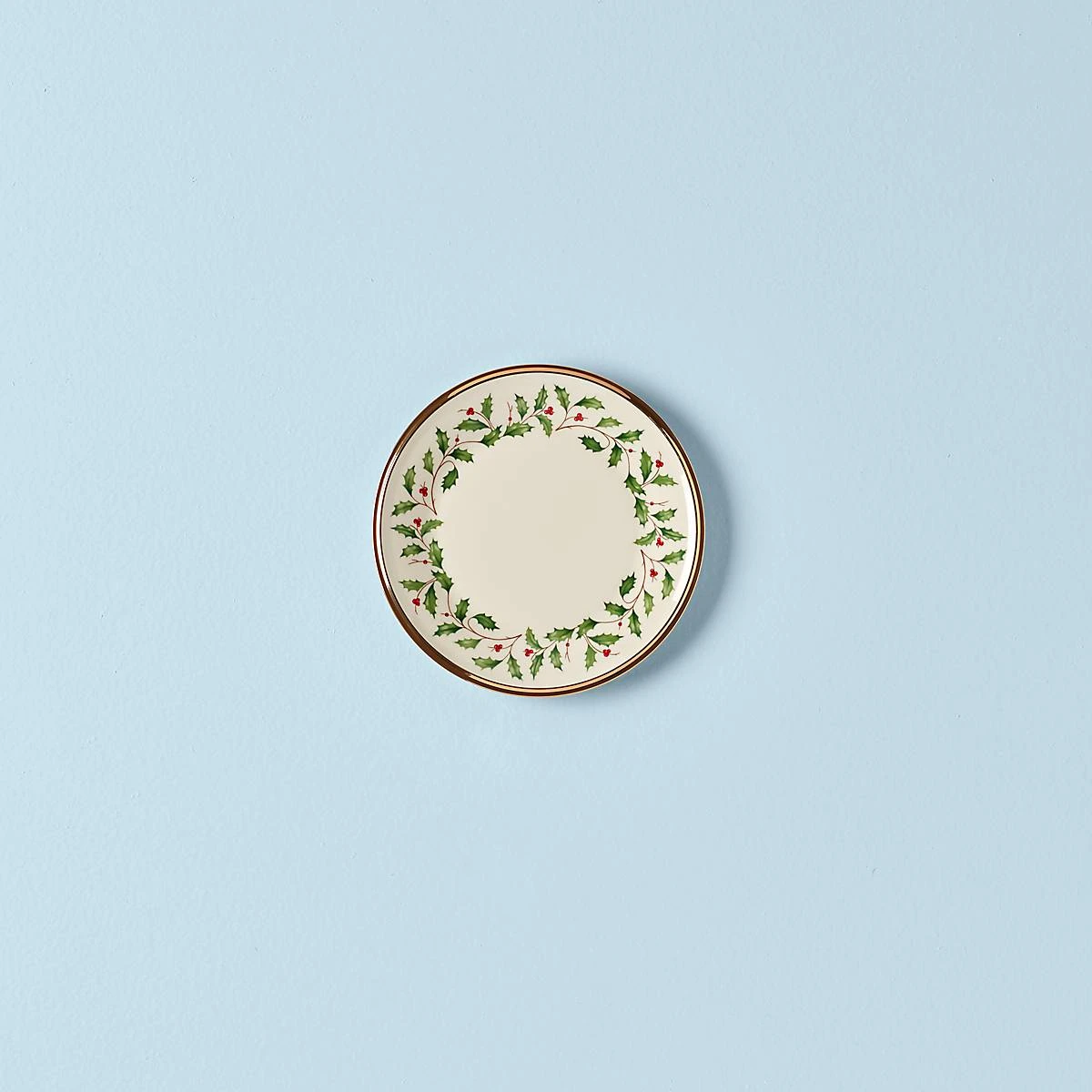 Part of the time-honored Lenox Holiday Dinnerware Collection, our holly and berry motif adorns the surface of this Holiday Bread Plate. Crafted from porcelain with a rich, 24-karat gold trim for an opulent, holiday-themed tableware addition.