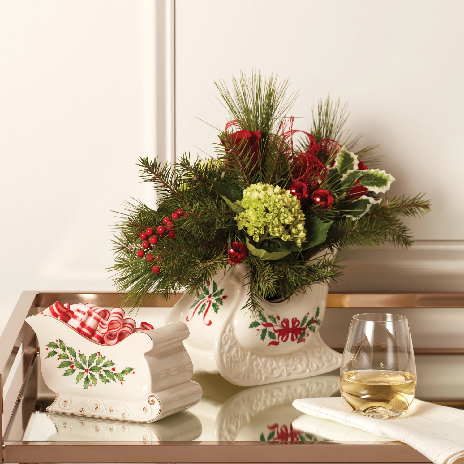 New from our bestselling Holiday collection, this unique bowl comes in the shape of Santa’s sleigh and features our signature holly motif along the sides. Accented in 24k gold, this treasured centerpiece steals the show on your dining room table.
