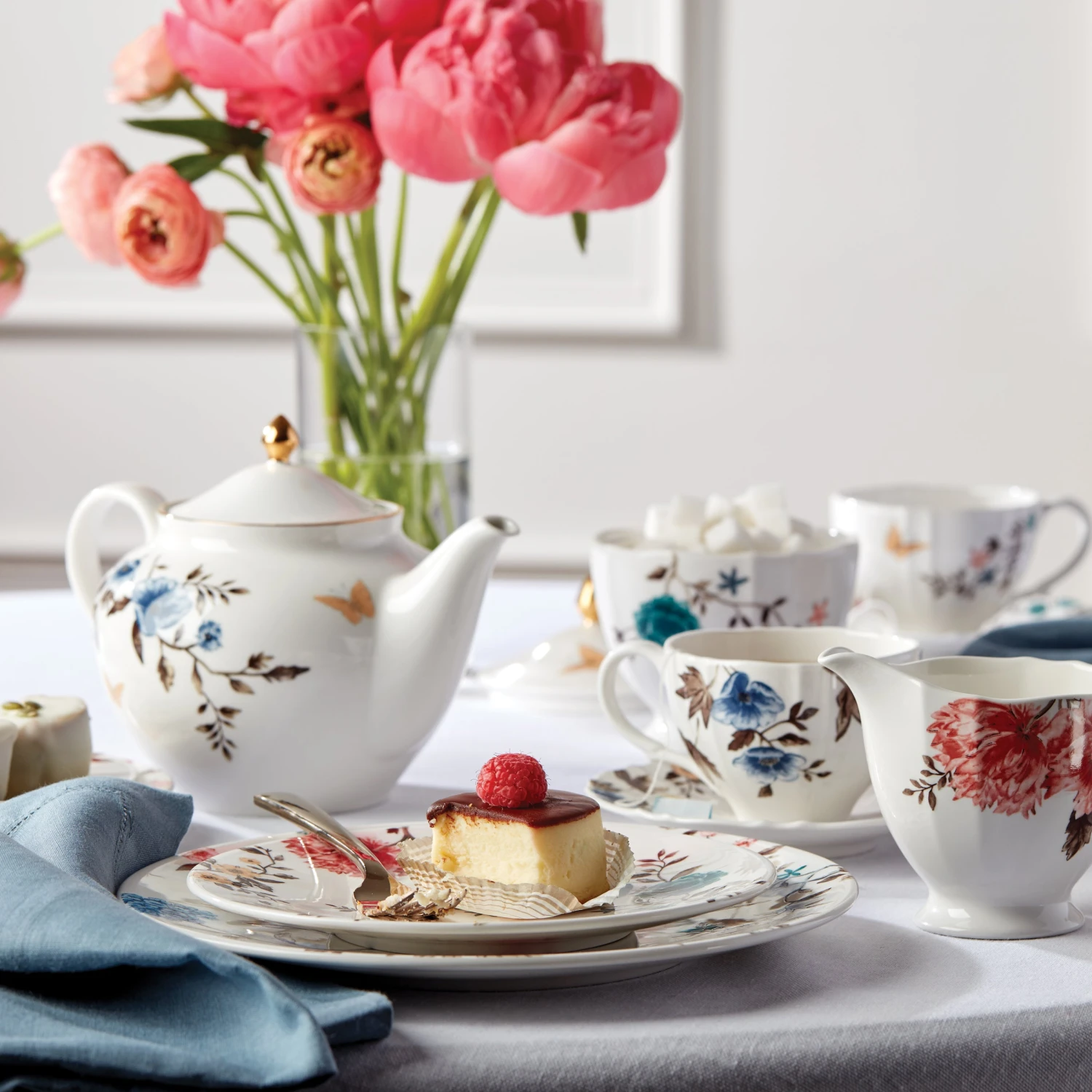 The Sprig & Vine teapot is the perfect way to enjoy your favorite tea. Inspired by the beauty of vintage textiles, this collection brings the bright botanicals and butterflies of a lush English garden to your home. A sliver of metallic adds a gleaming touch to give this floral teapot its golden finish.
