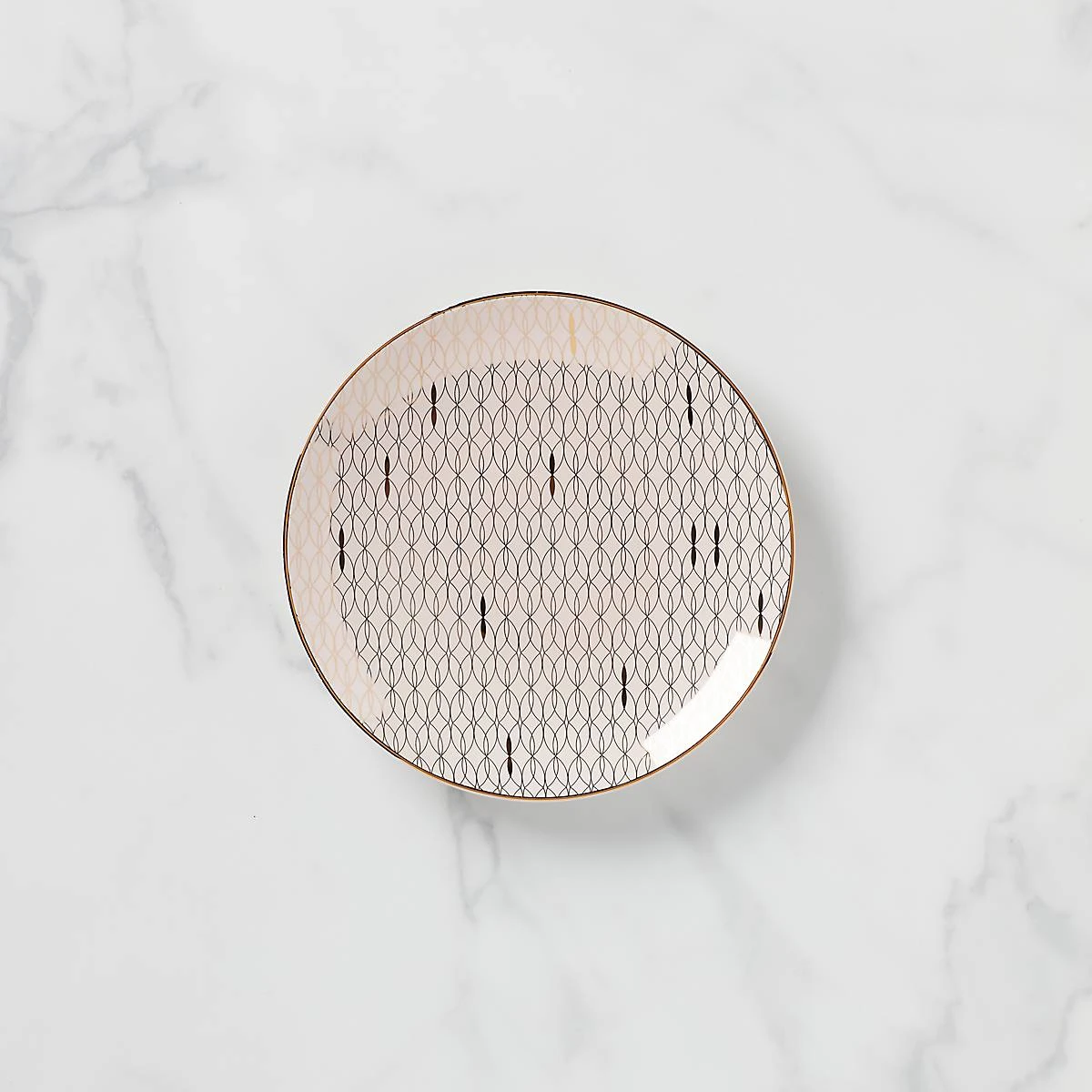 This salad plate, crafted of dishwasher-safe, durable ceramic porcelain, features a subtle geometric pattern across its coupe-shaped surface that glitters with bronze-colored accents. The border includes microwave-safe gold accents that evoke a gleaming piece of amber sea glass.