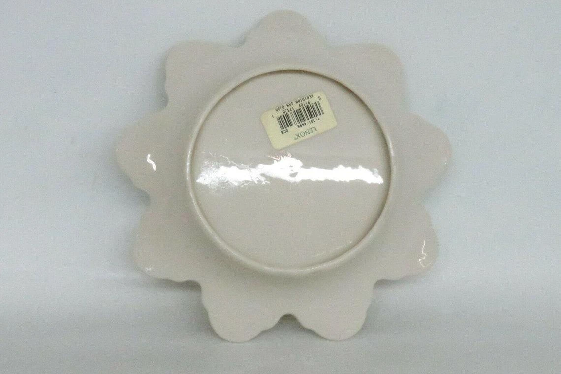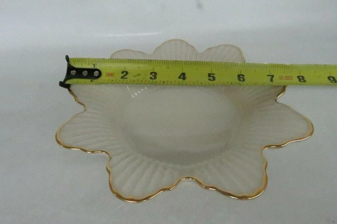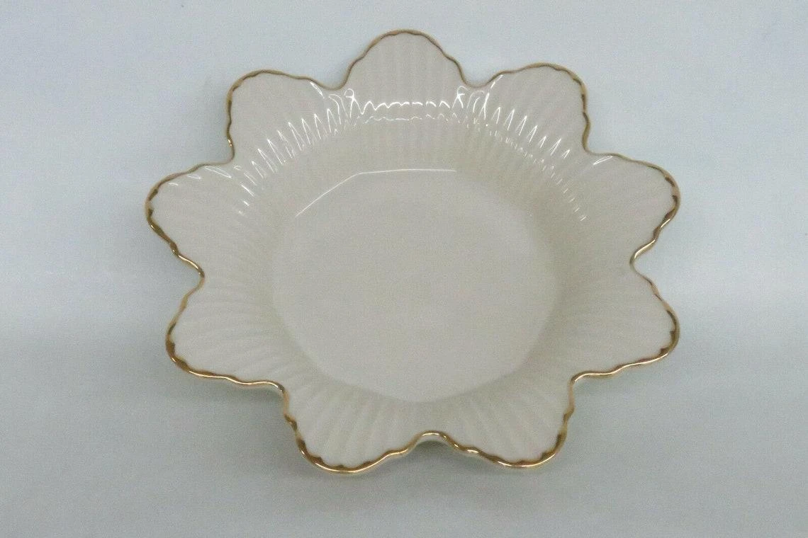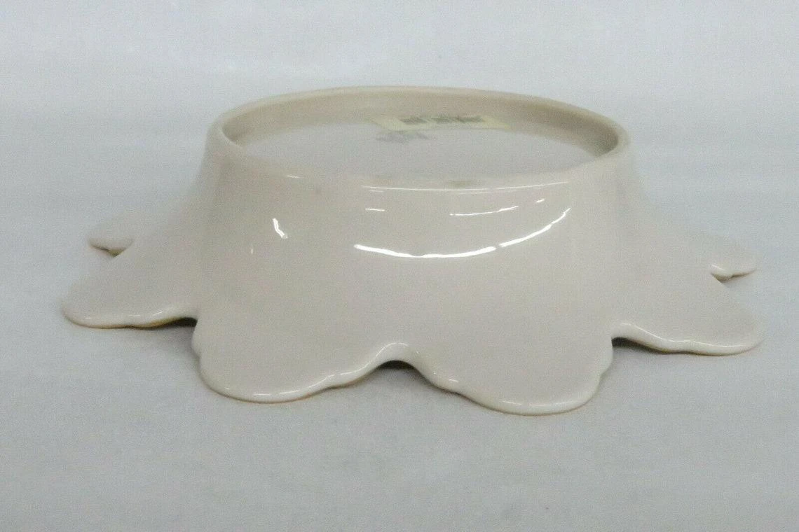This gorgeous candy dish is made of porcelain. This beautiful dish is stamped as being made in the USA by Lenox, see pictures. This piece also has a sticker marking the piece as being part of the Meridian collection, see pictures. This dish has great vintage design with a classic petal silhouette, a lovely ivory cream color to the porcelain, and a pretty gold color trim to the rim. Please see photos for size/scale, the height is approximately 1.5″ and the width is approximately 7.75″.