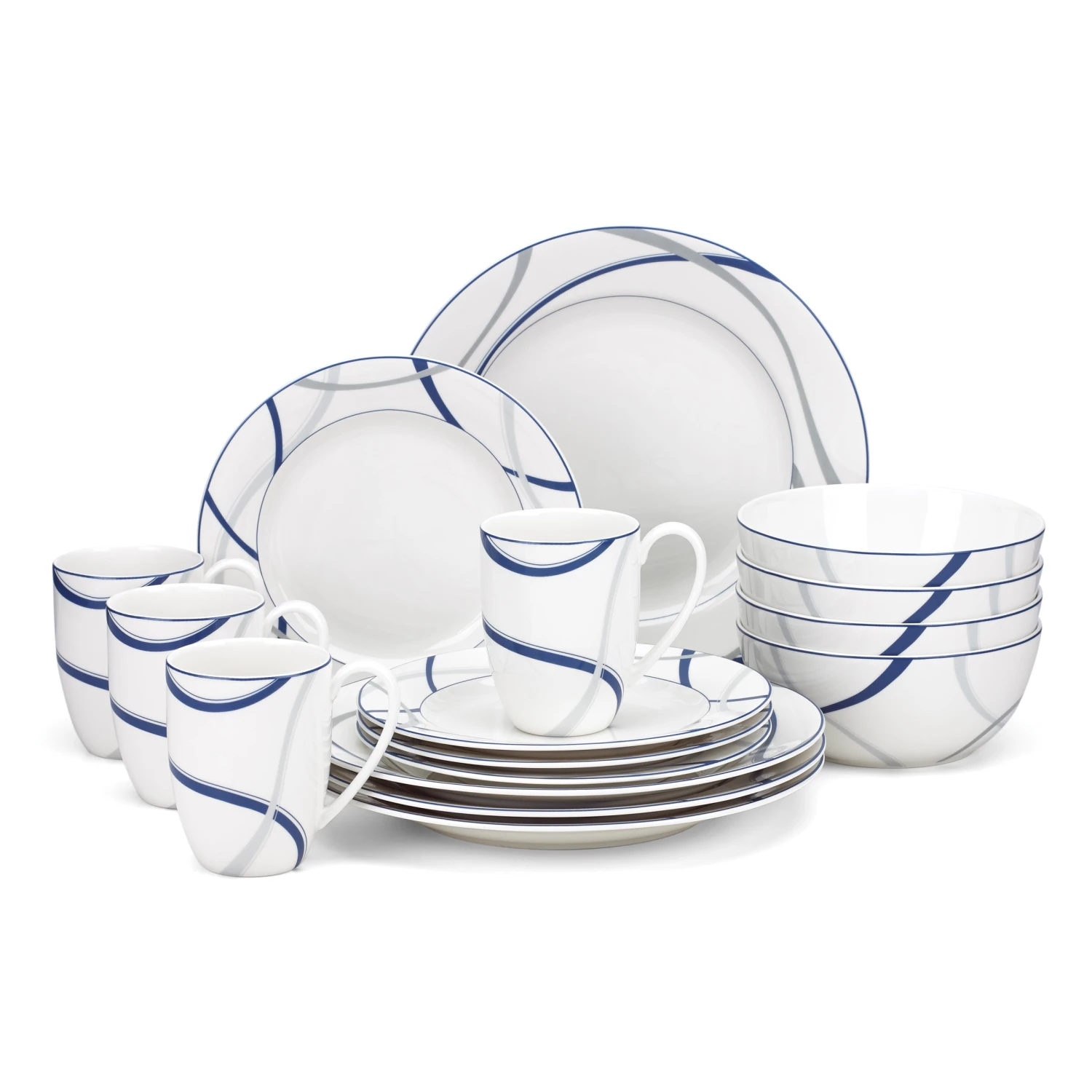The Vibe Blue 16-piece Dinnerware Set features a warm and modern motif of intersecting and swirling, blue and silver ribbons. This bright and durable ceramic porcelain dinnerware set is microwave and dishwasher-safe, for added convenience. Available only at Bed Bath & Beyond and Lenox.com.