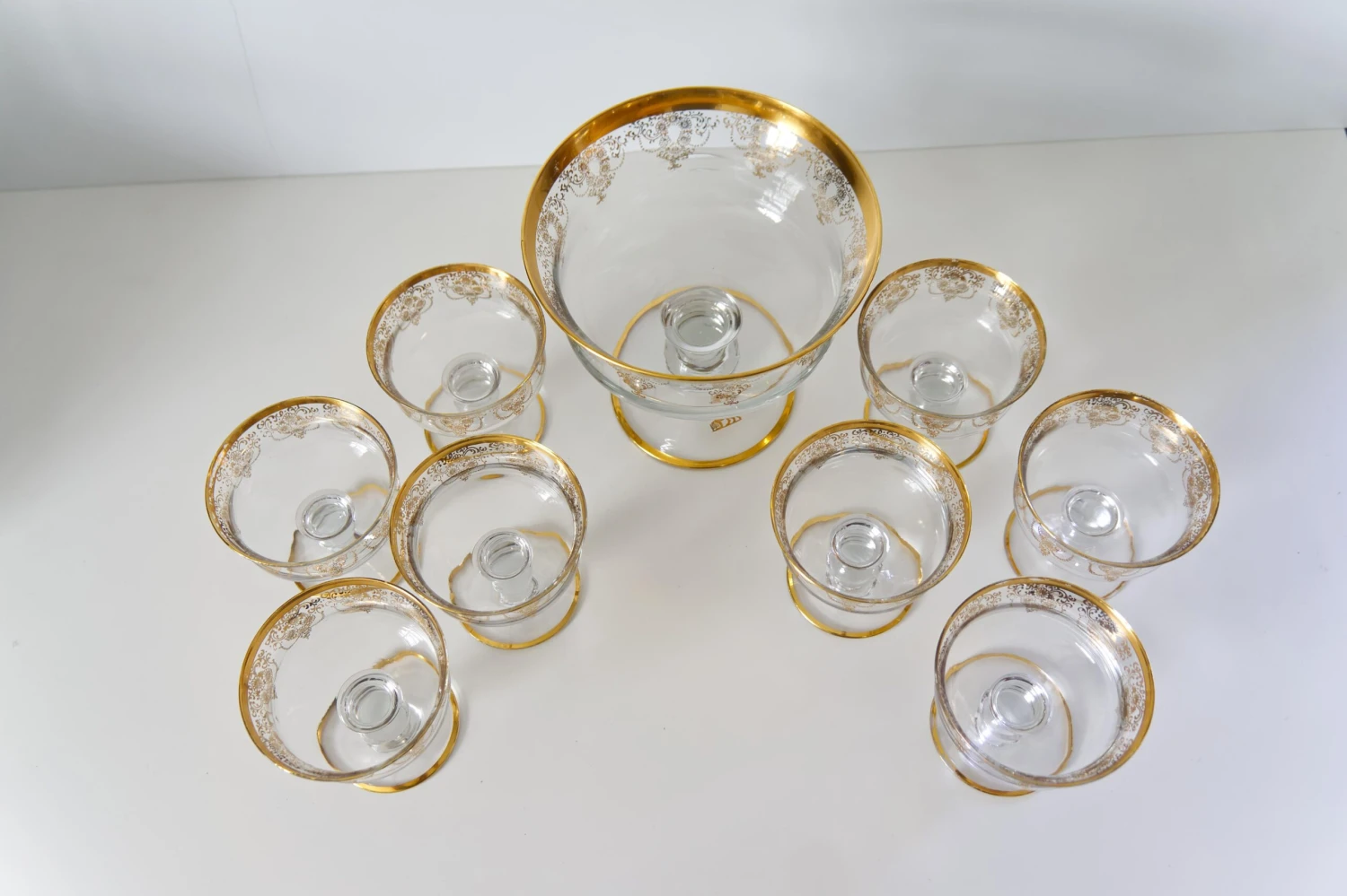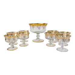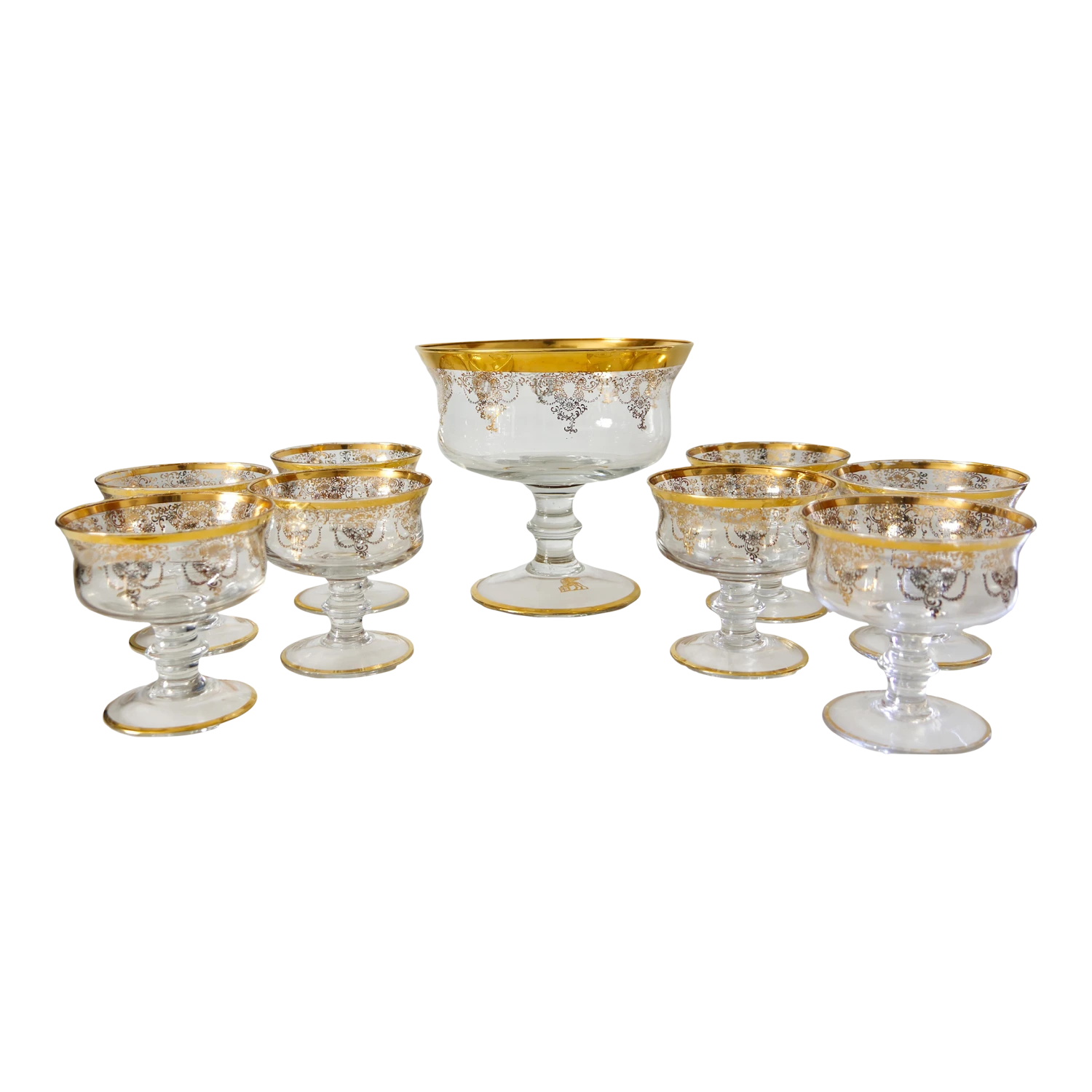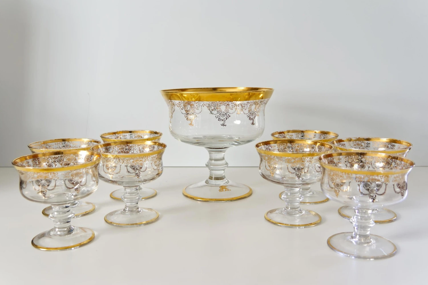This Venetian glass set of one compote serving bowl and eight footed cups, features a gold gilt rim and lace …