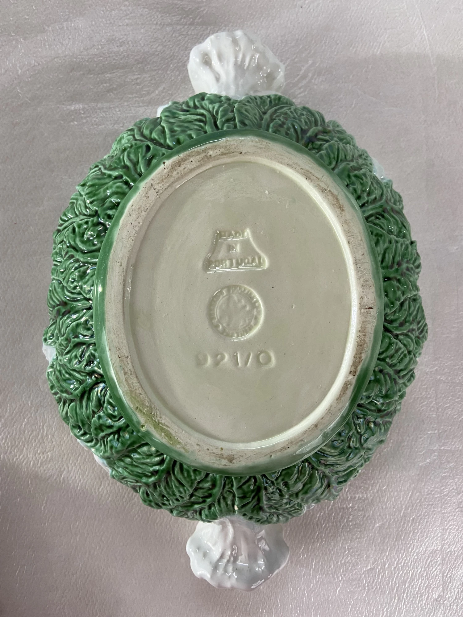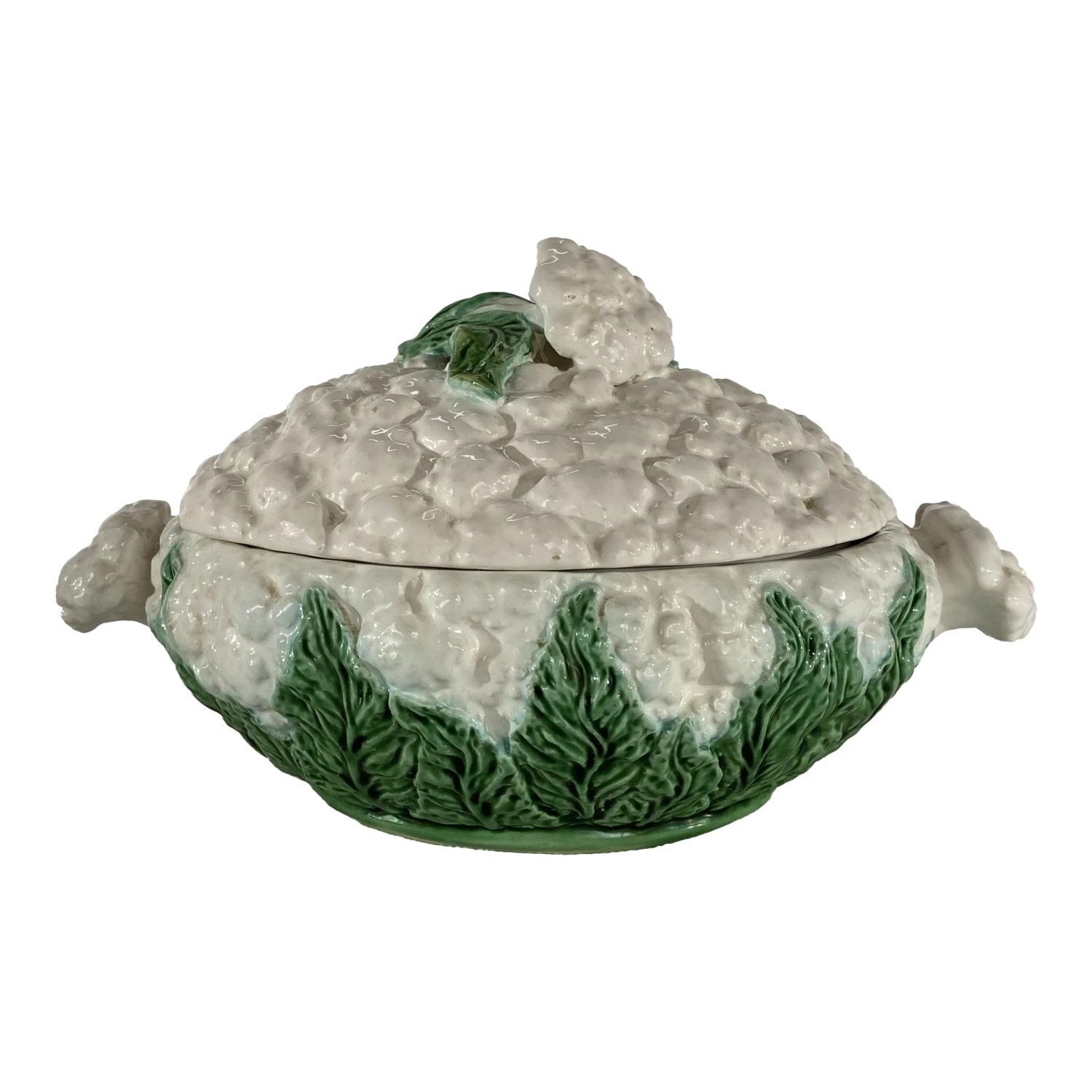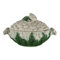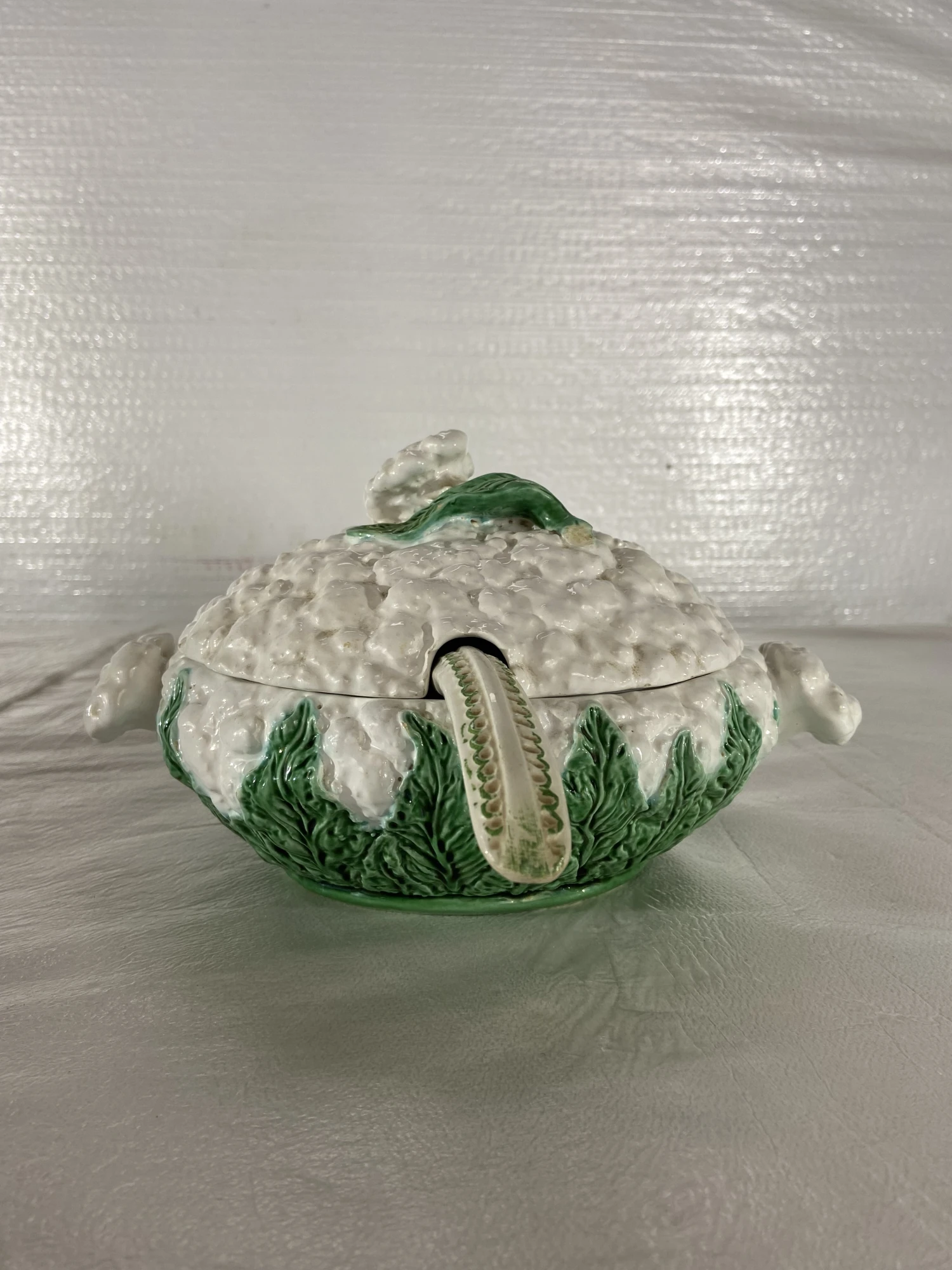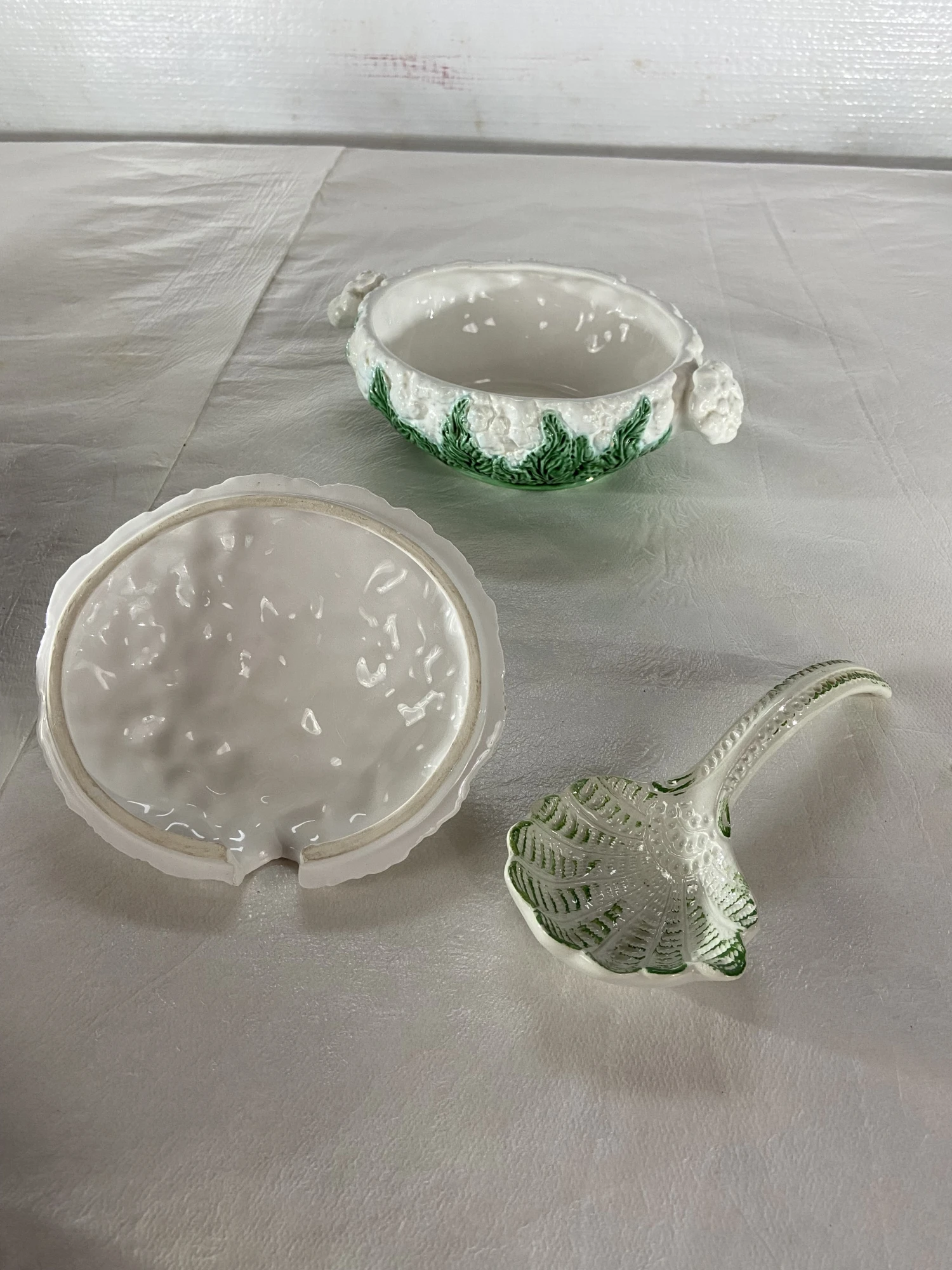 Vintage majolica style cauliflower vegetable shaped serving dish with lid and serving ladle. Features green and white glazed decoration.