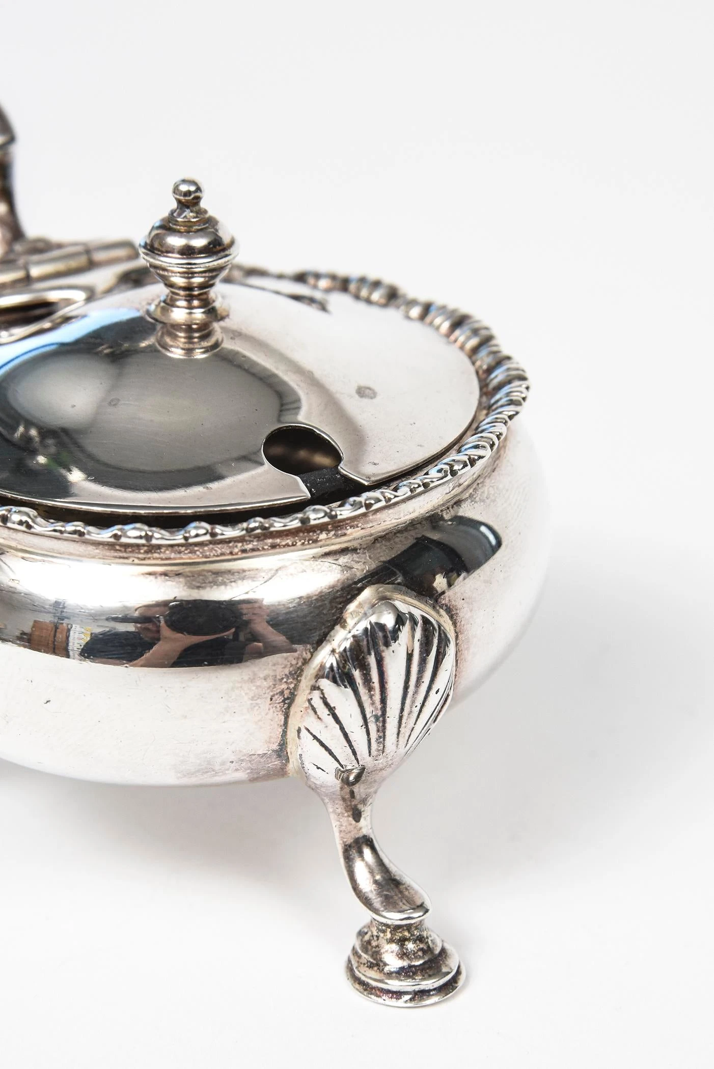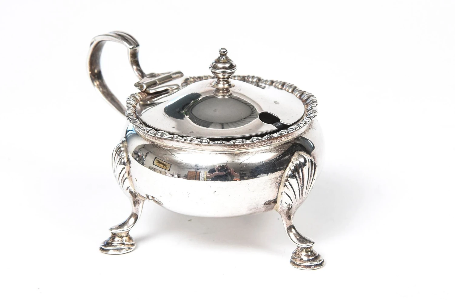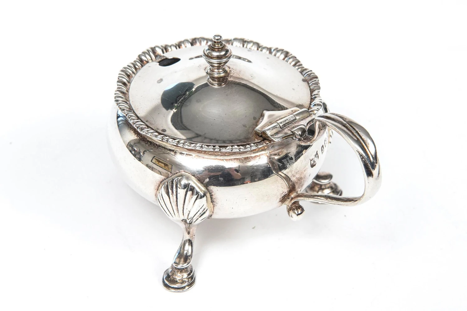 This beautiful ornate example of a mustard pot by famed Birmingham England silversmith Mappin and Webb was manufactured in 1929. The rim has a scolloped ribbon edge. It then bows out and sits on three ornate applied legs.