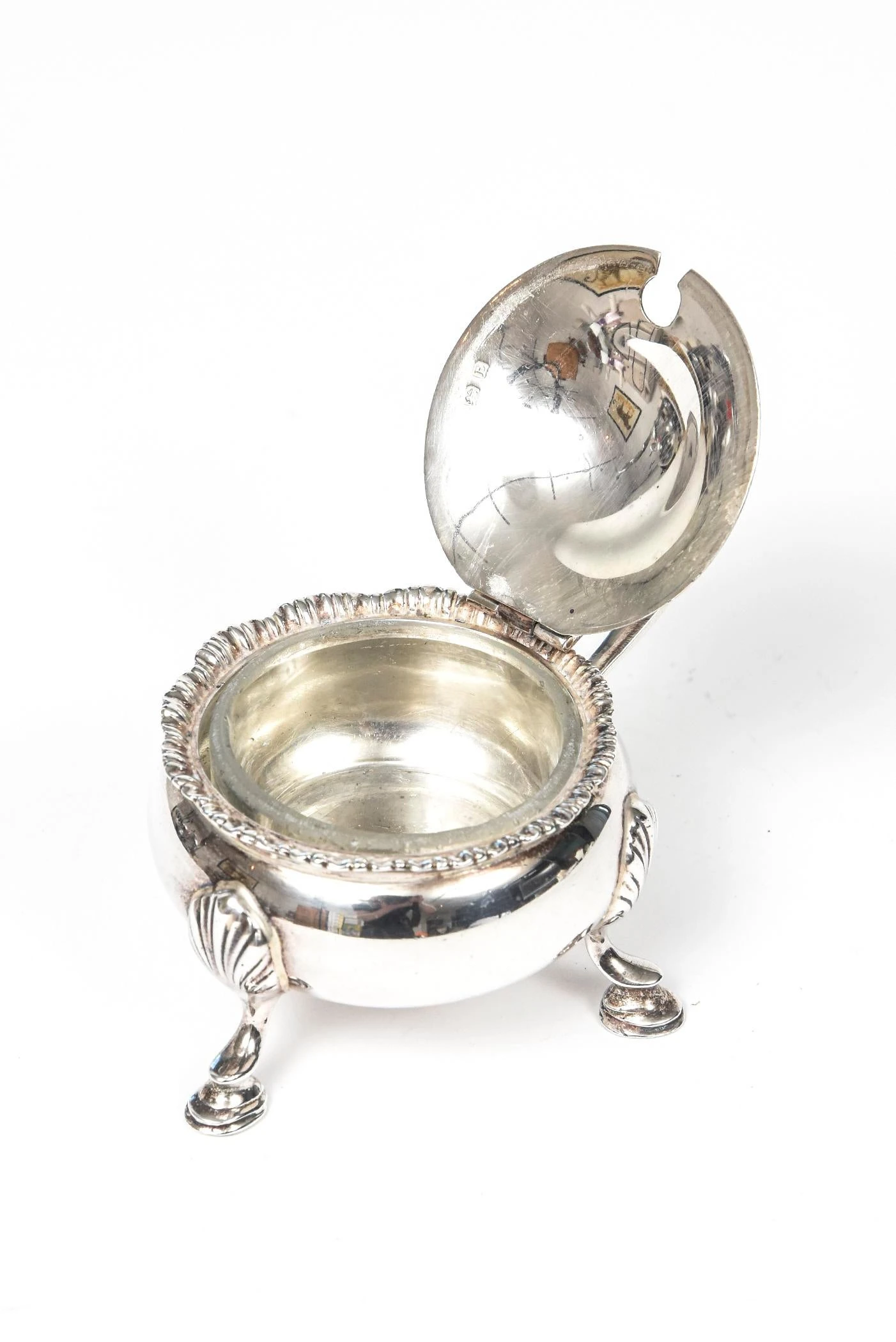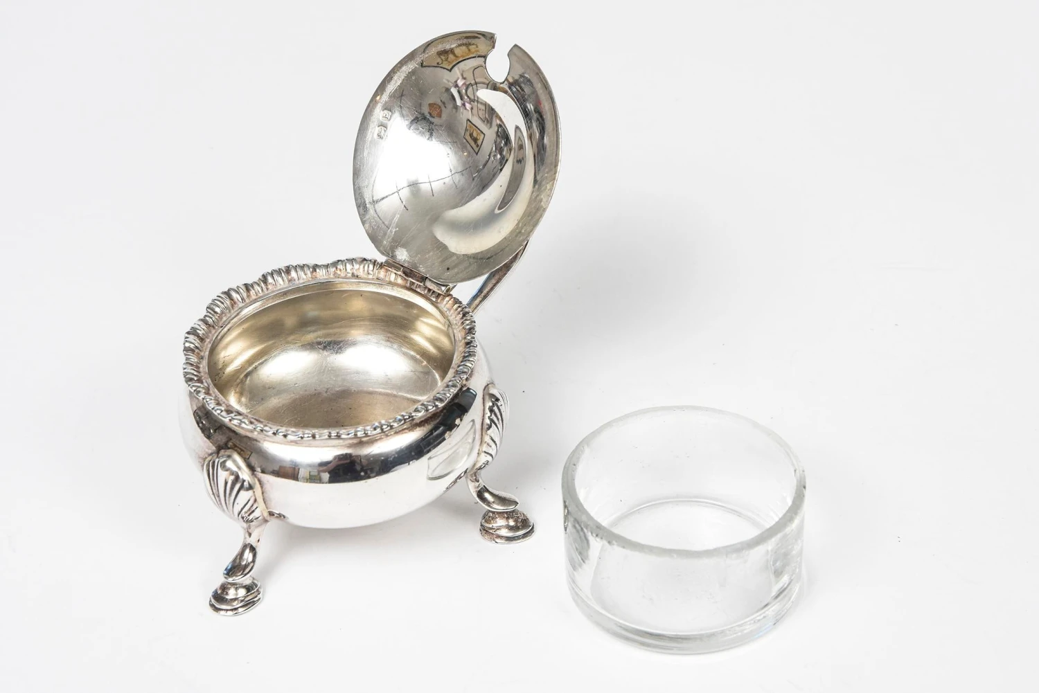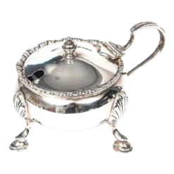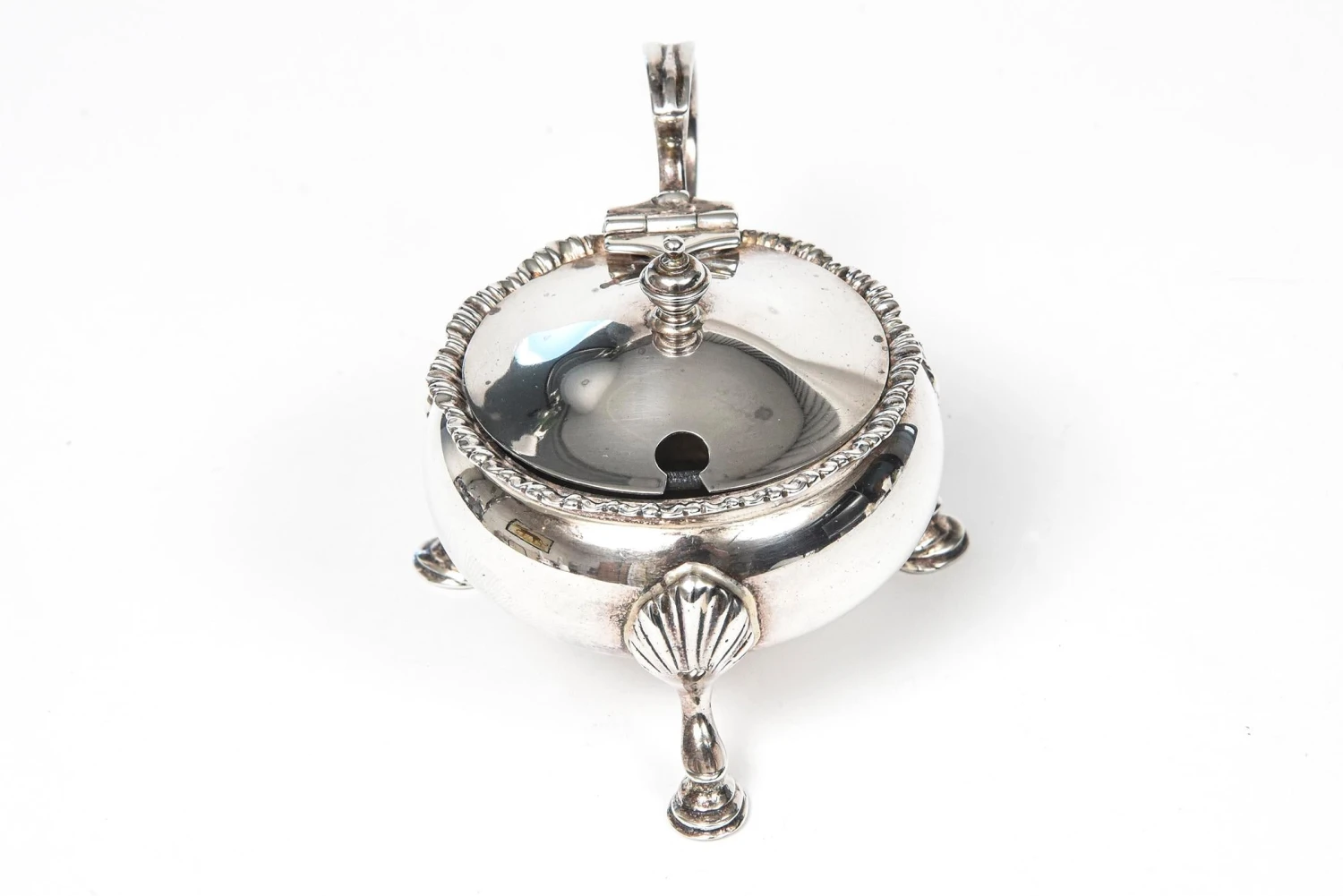 This beautiful ornate example of a mustard pot by famed Birmingham England silversmith Mappin and Webb was manufactured in 1929. The rim has a scolloped ribbon edge. It then bows out and sits on three ornate applied legs.