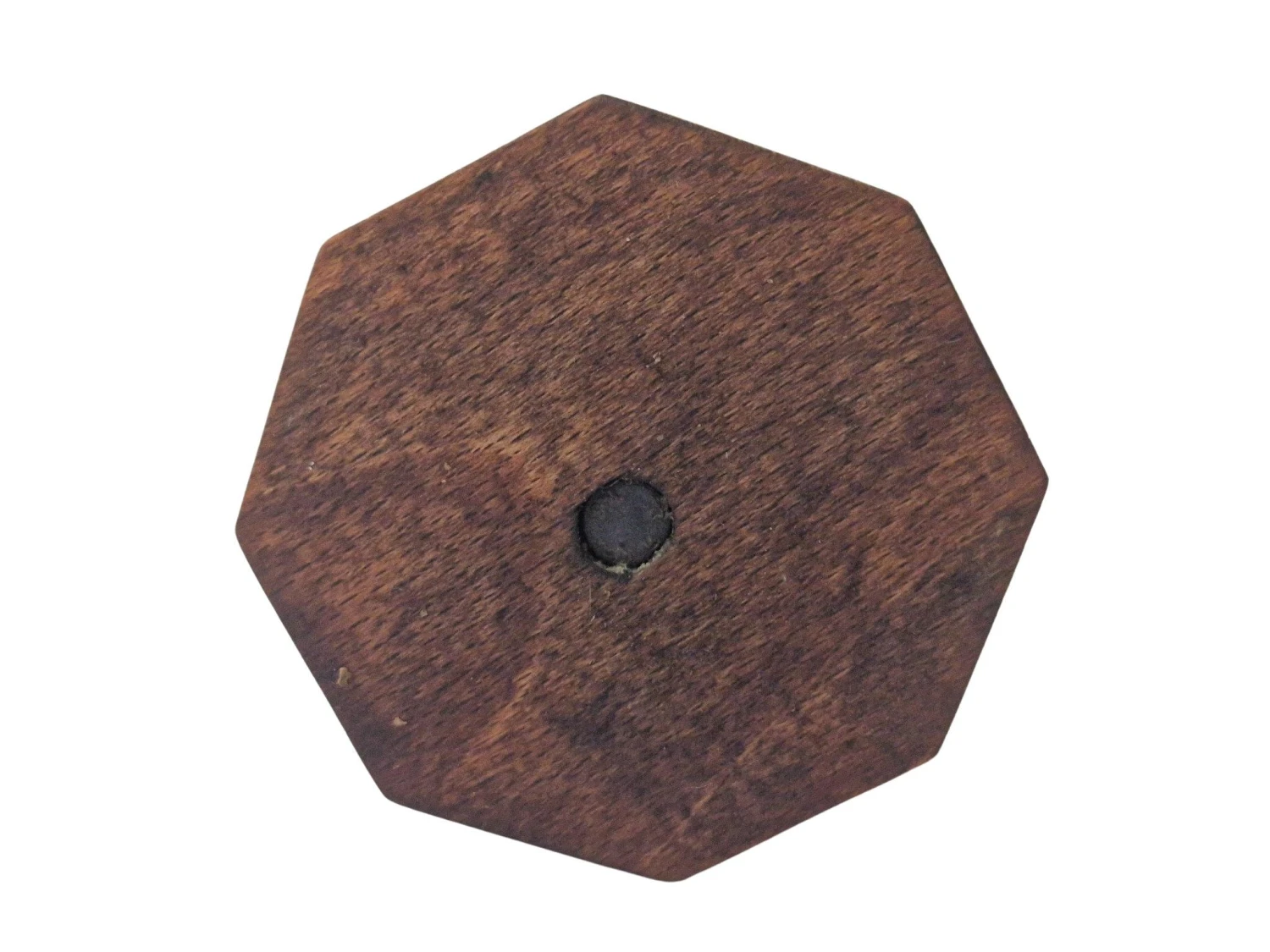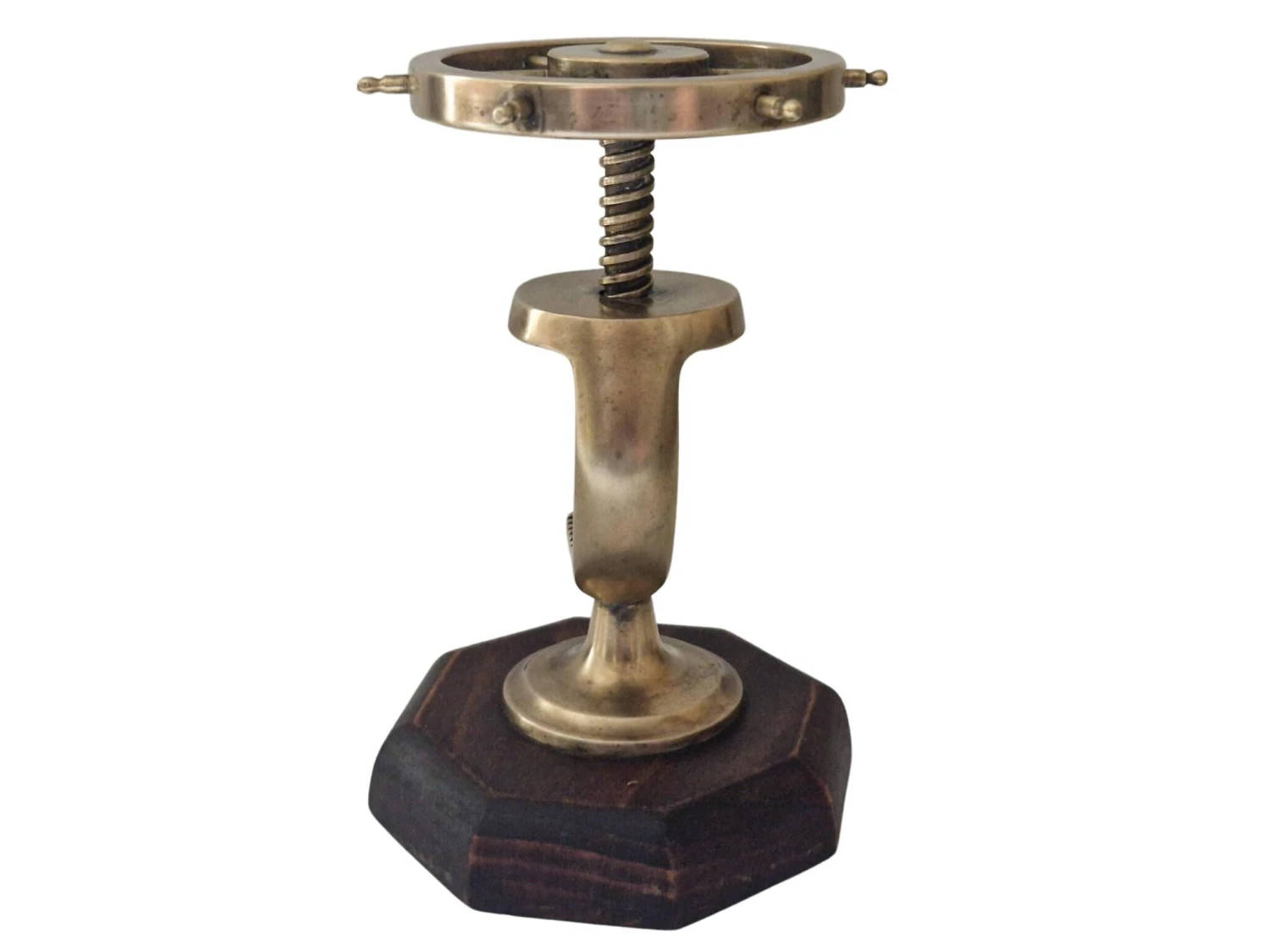 A brass nutcracker created in the form of a traditional ship’s wheel dating from the 1960s. It has been cast from brass and rests on an octagonal shape wooden base. The nautical ship’s wheel has a threaded bolt which cracks open nuts when the wheel is turned.