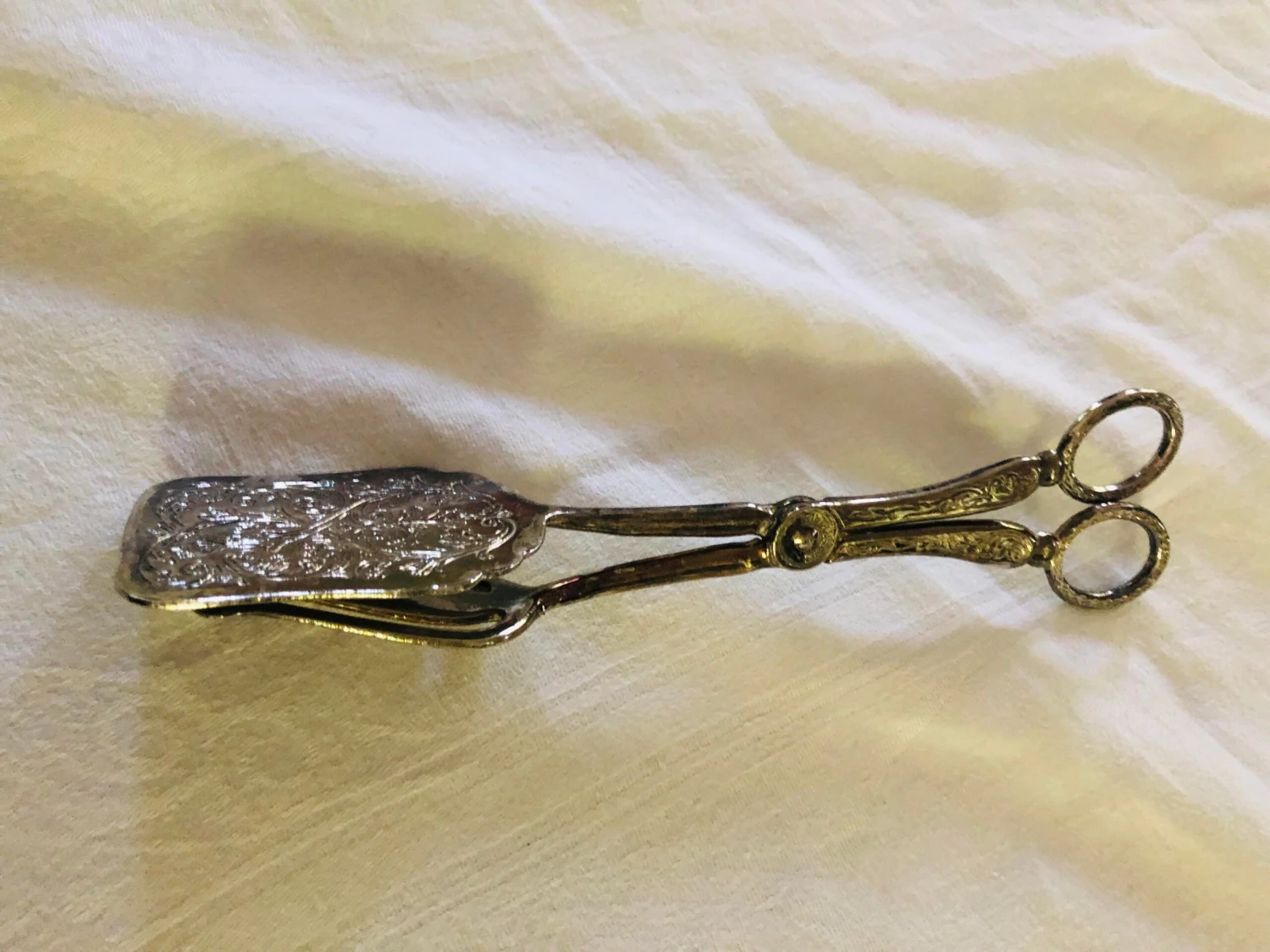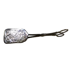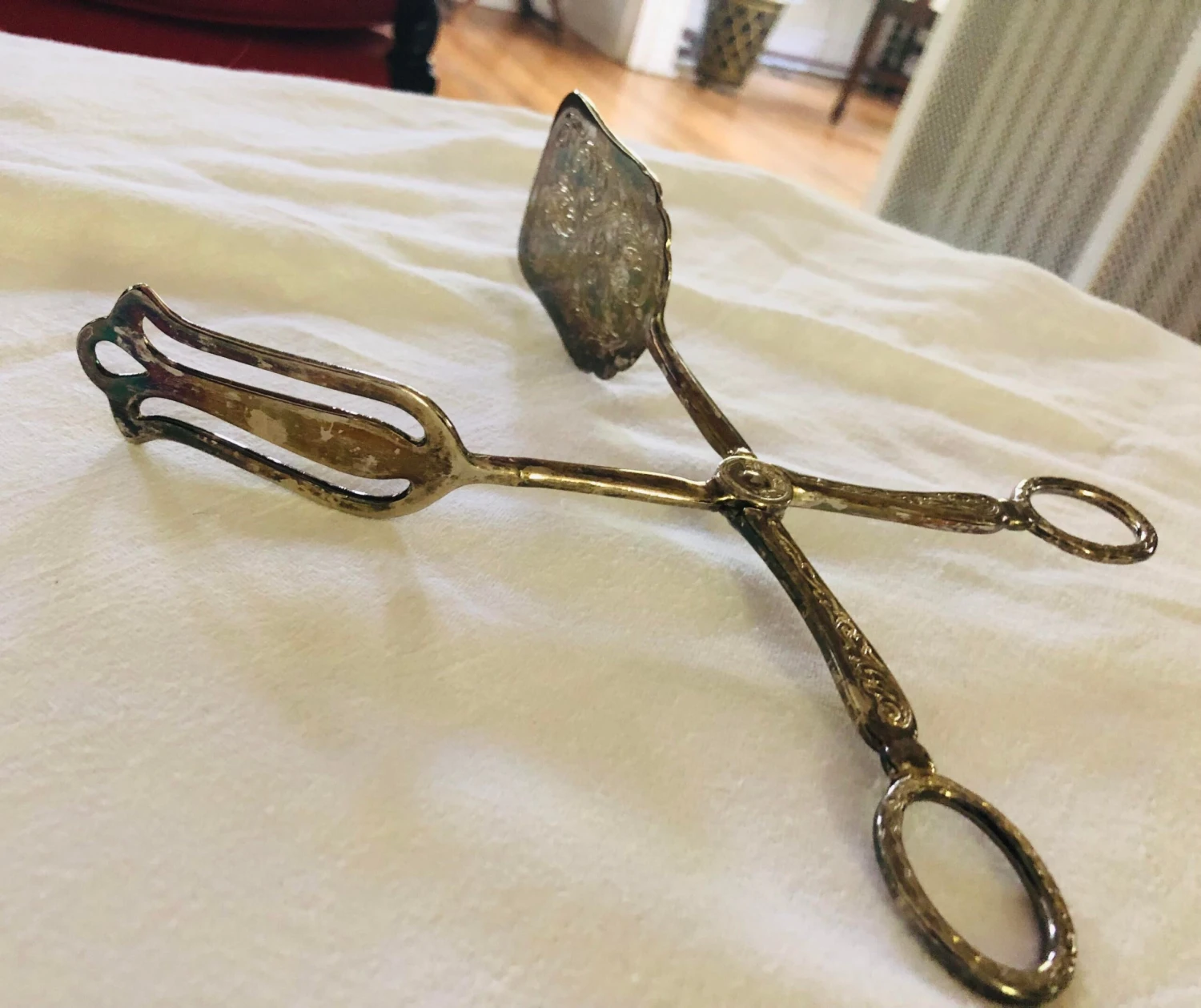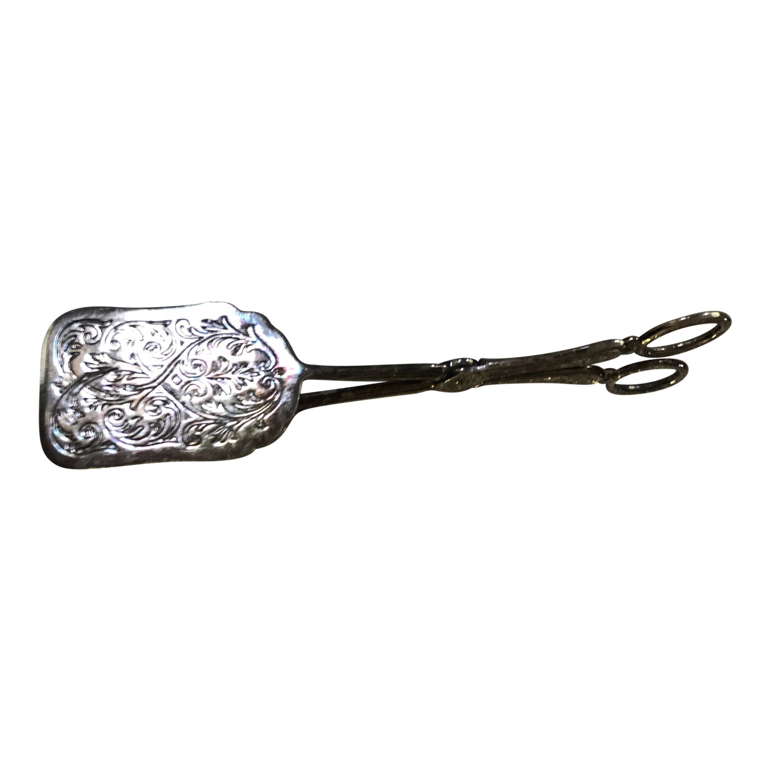 Beautiful Vintage Silver-plate Dessert tongs. Scroll design. Some patina. If you like shiny silver polish cleans right up