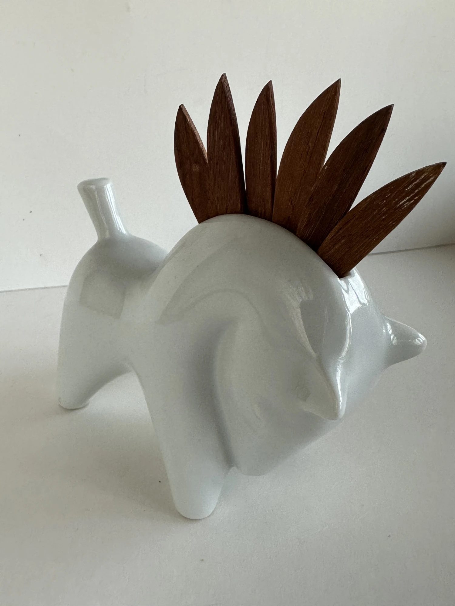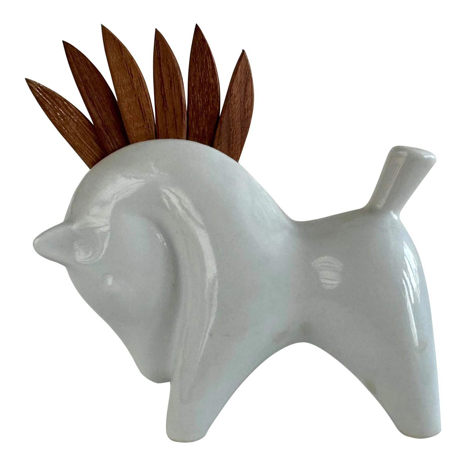 Vintage mid-century figural hors d’oeuvres or cocktail pick holder with the iconic form of a charging horse. From the Otagiri company, this horse’s mane is comprised of 6 sculpted teak picks.