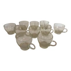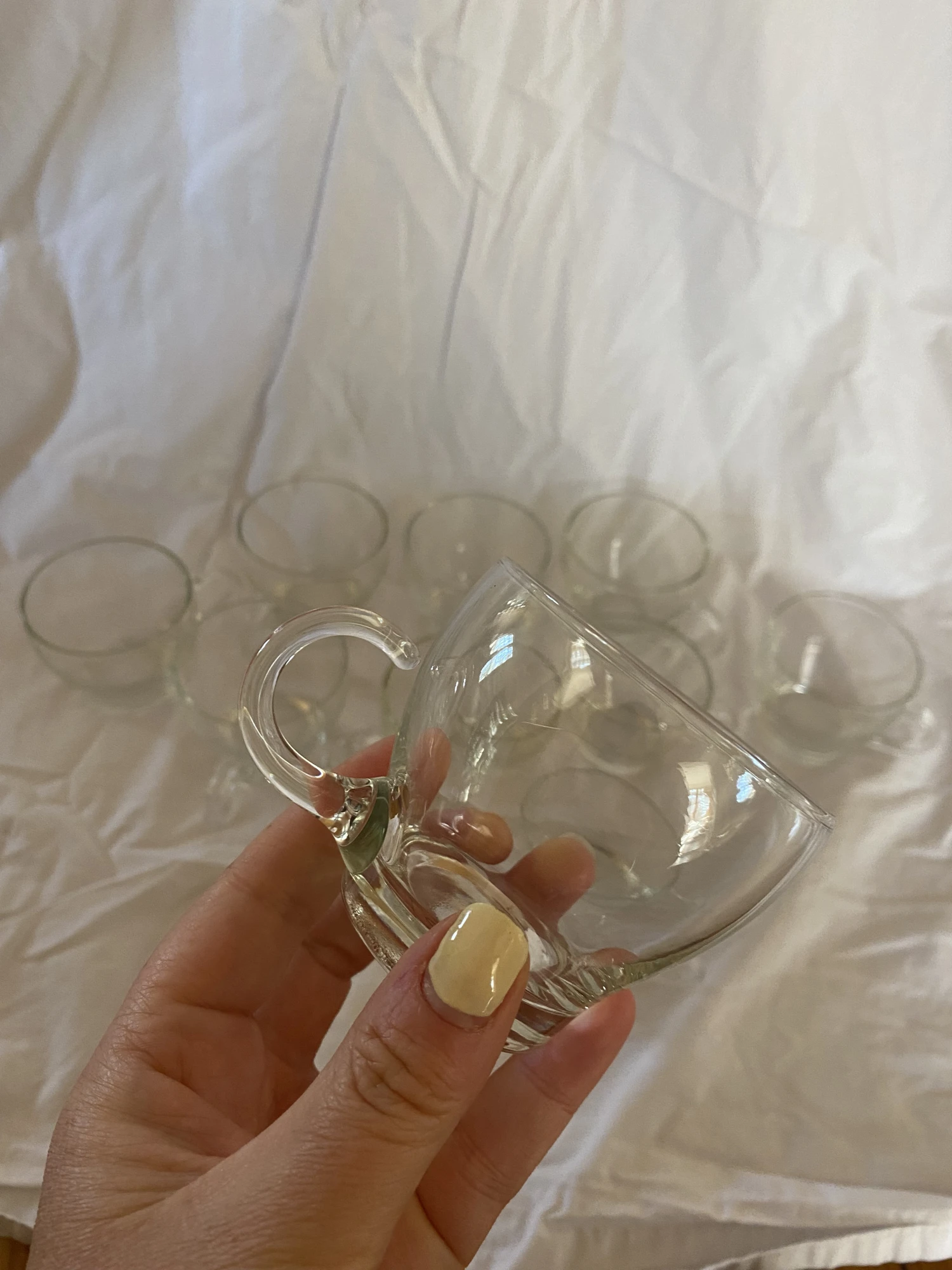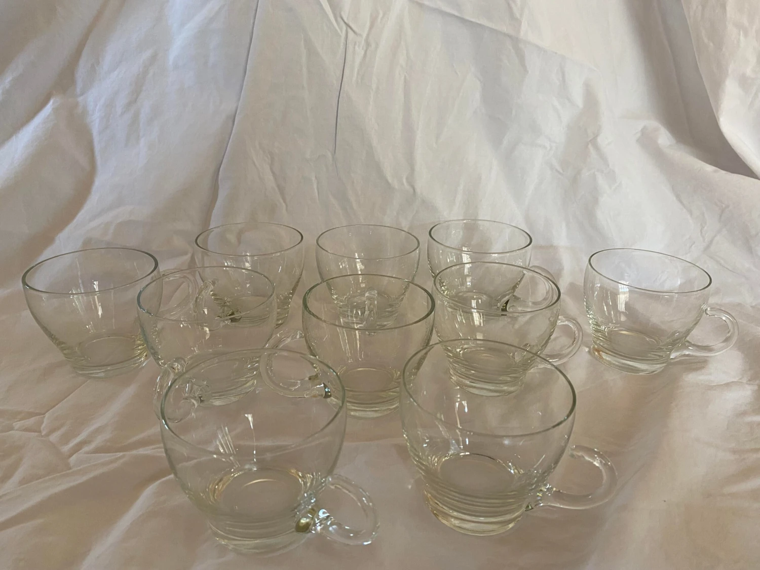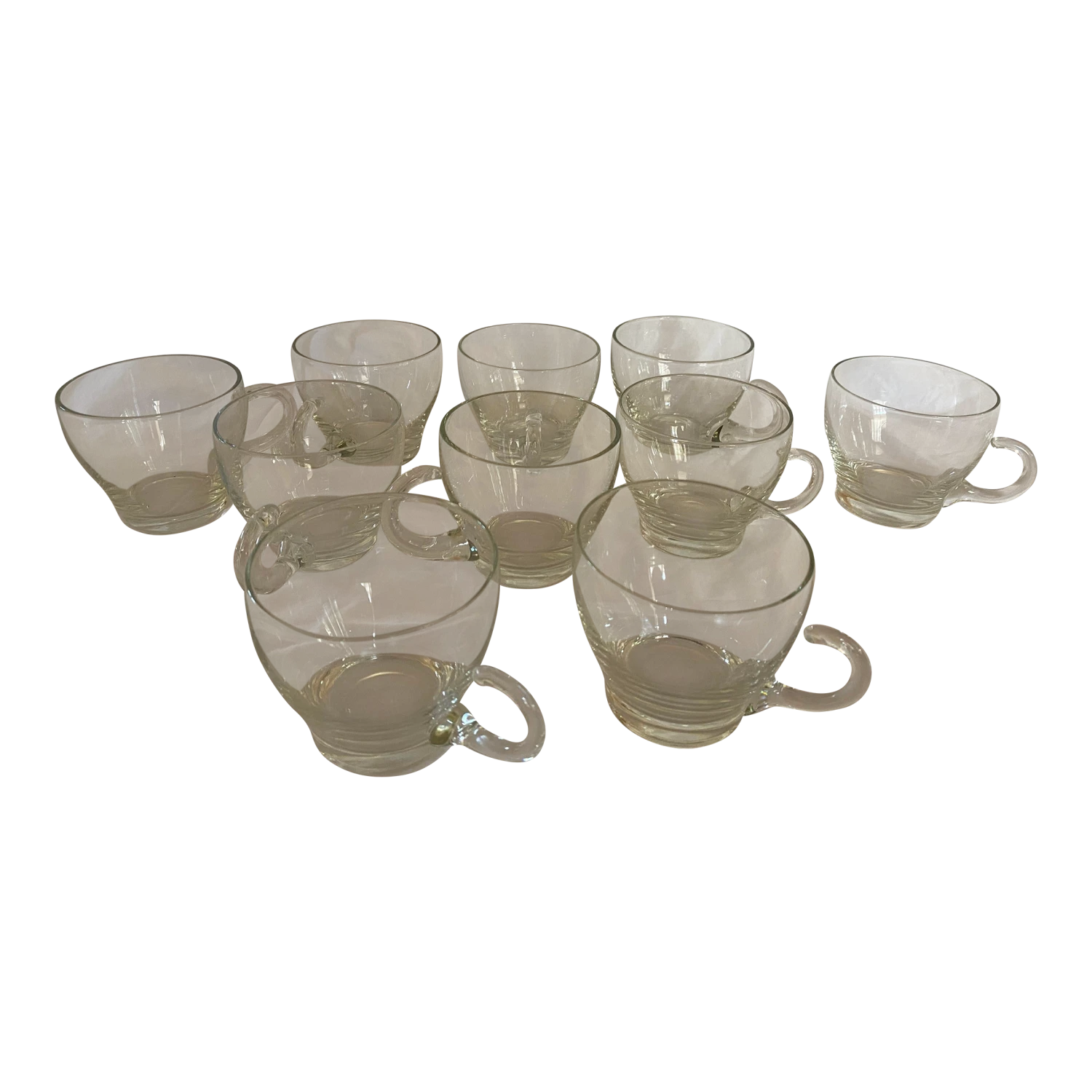 Set of 10 demitasse glass mugs. Feature a snake like curving handle. Very delicate and mid century. Great for espresso or punch.