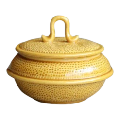 Mid Century Modern Original Vintage oven to table lidded ceramic casserole. Mustard yellow dimpled texture with a statement handle on …