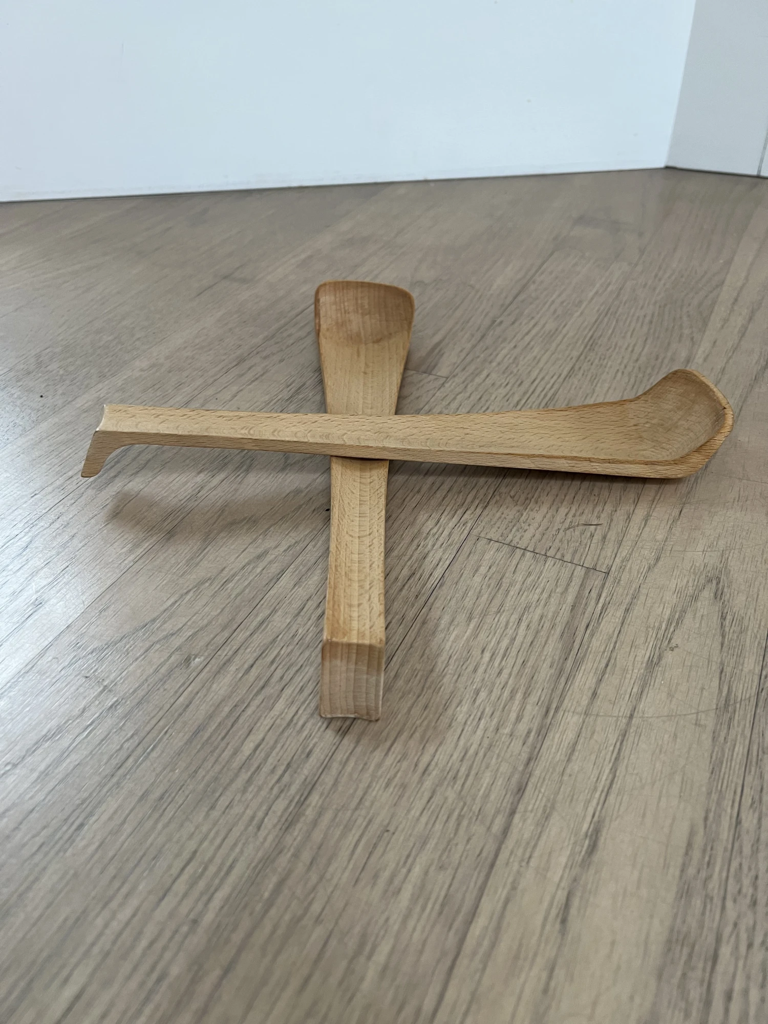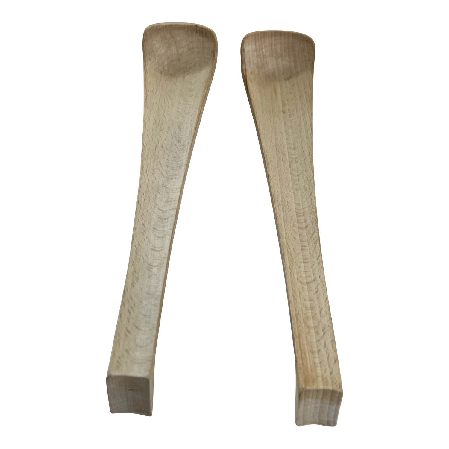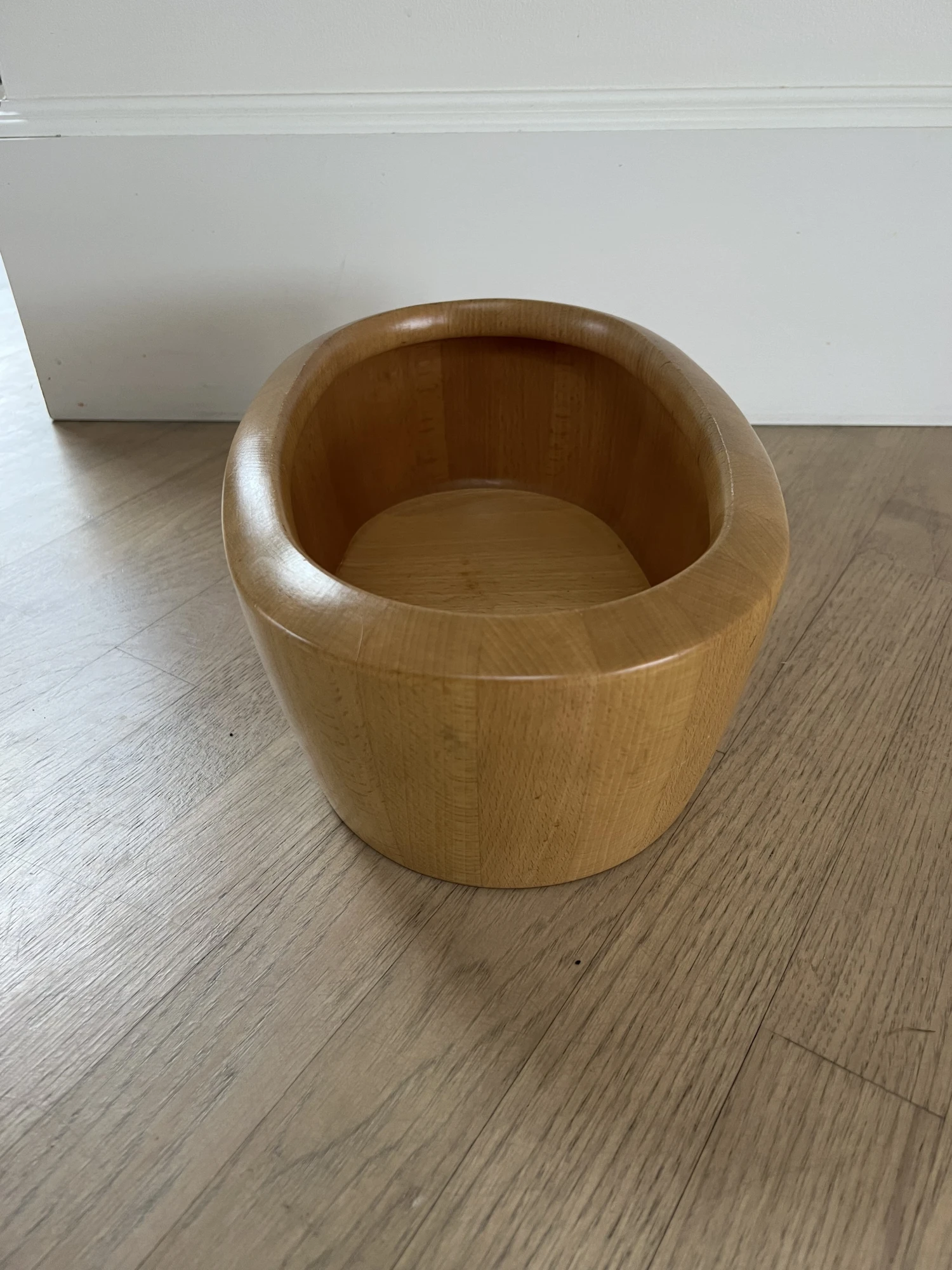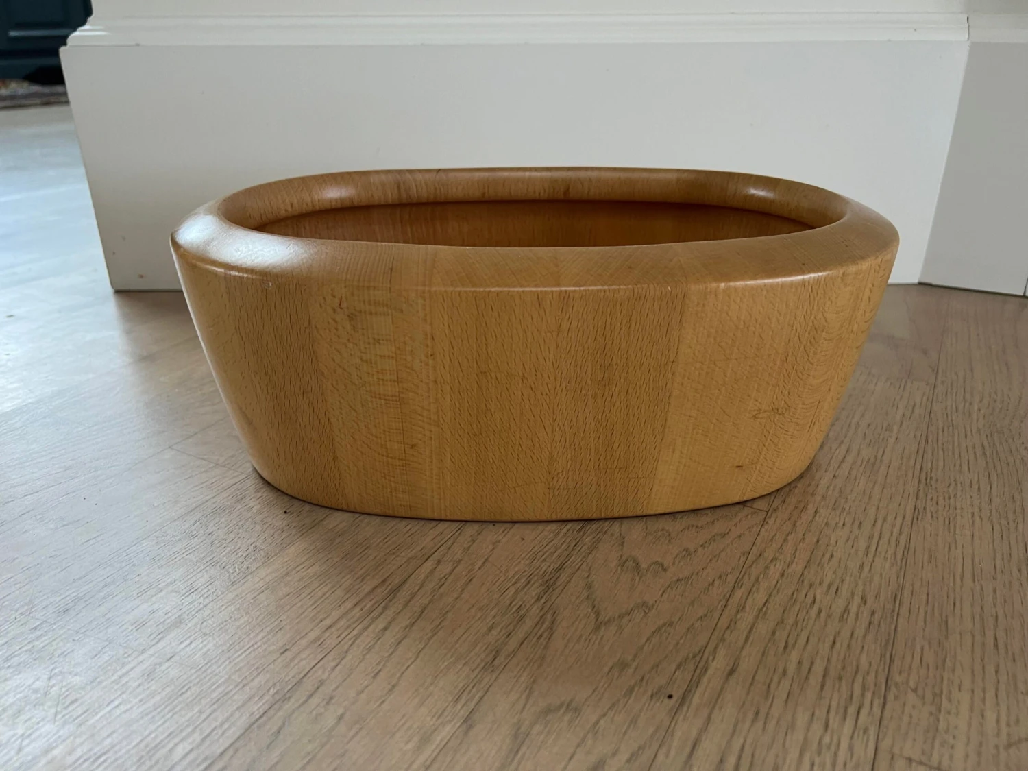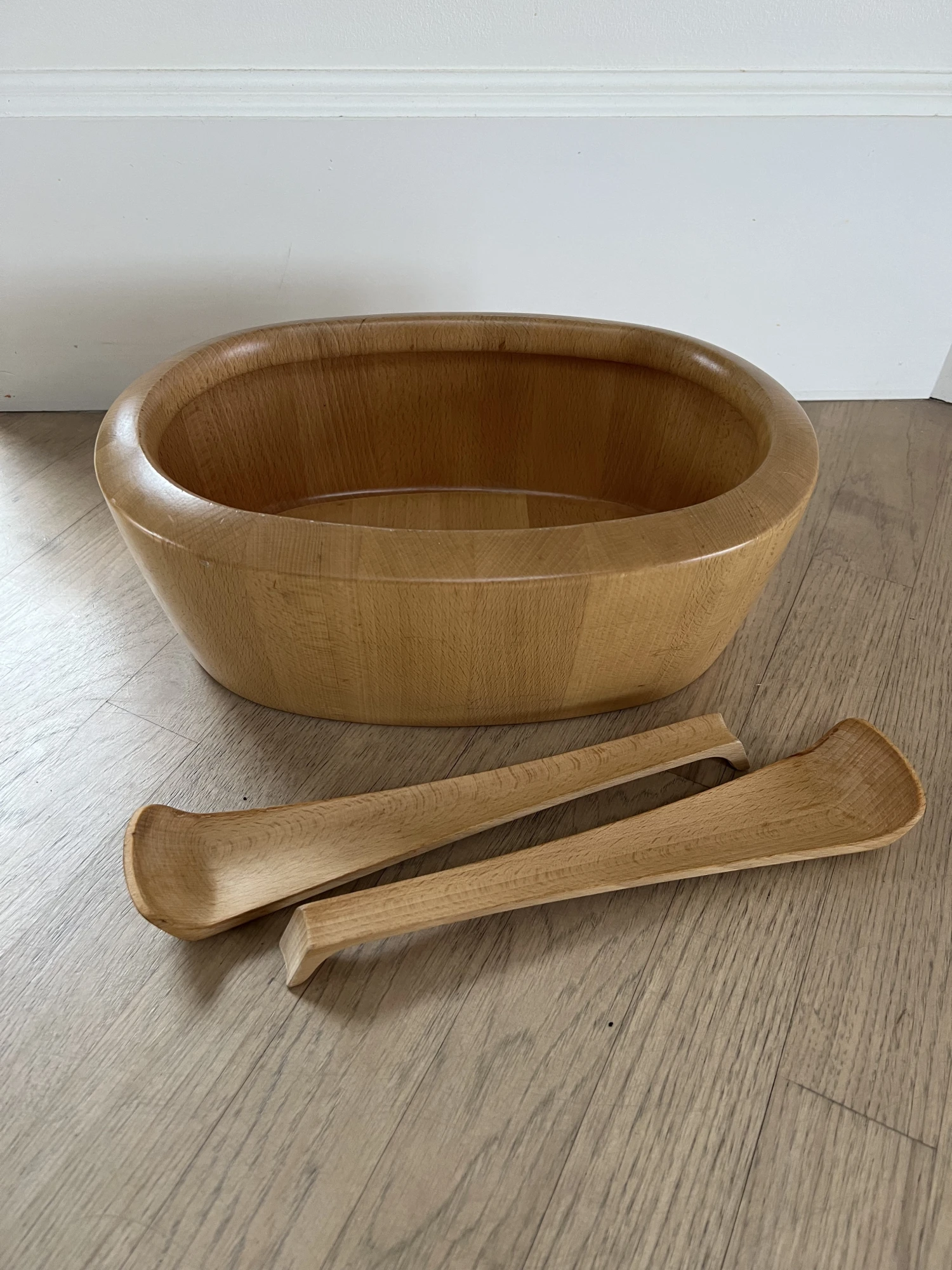 Is it bleached teak? Or quarter seen oak? Hard to tell! But we know this is a full serving set from Richard Nissen of Denmark, including an oblong salad bowl and two wooden spoons.