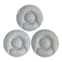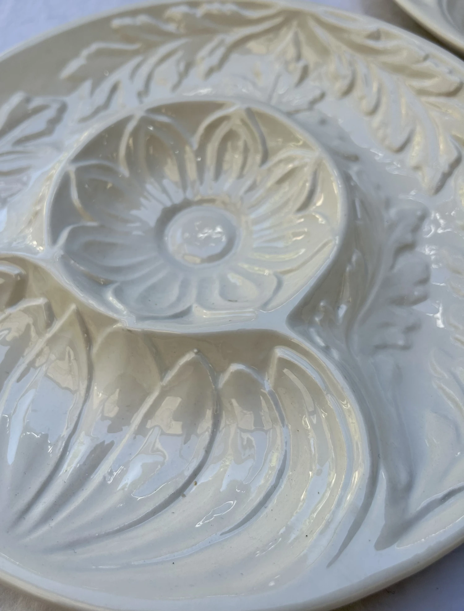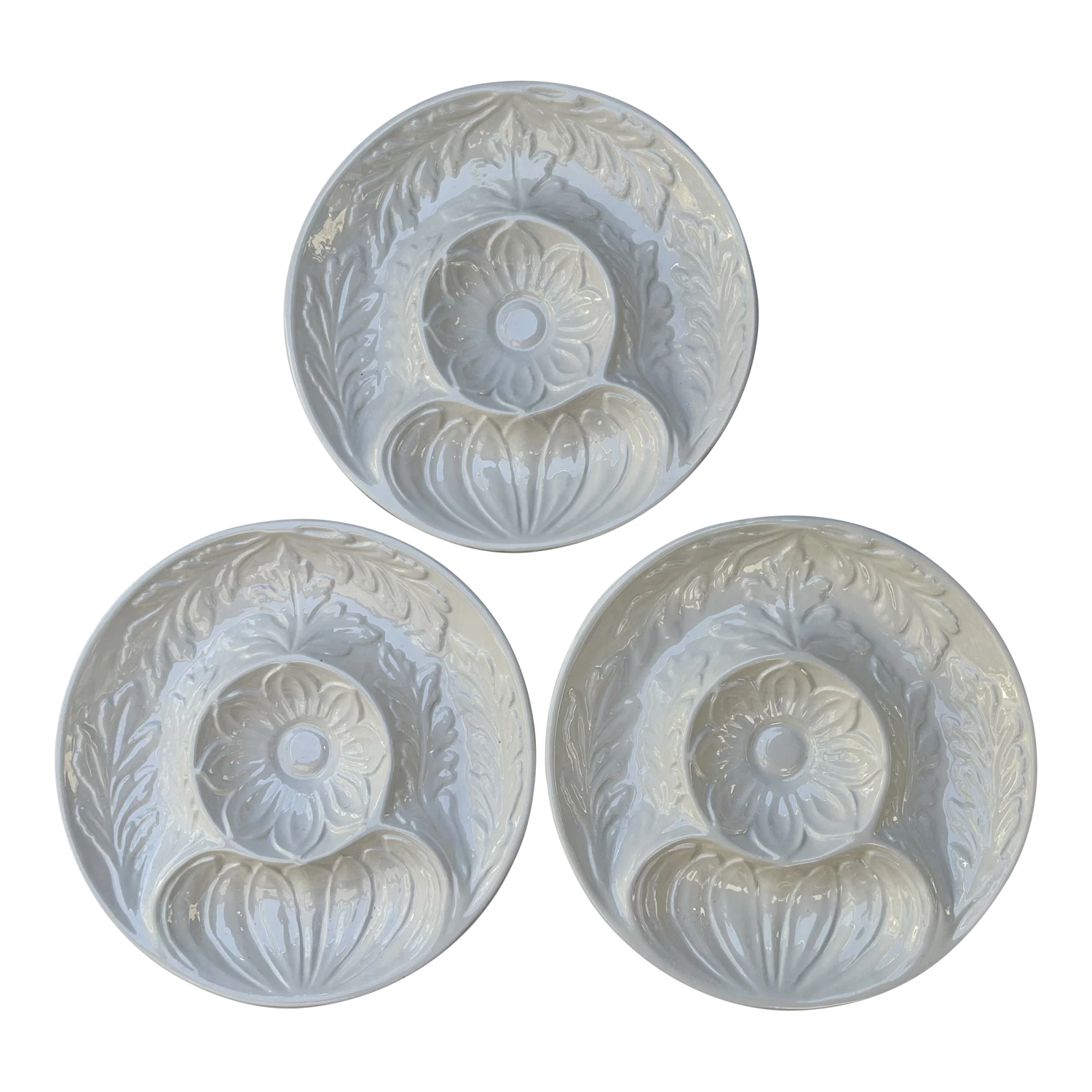 Three beautifully designed Majolica Style white artichoke plates are by Whittier Pottery. Makers Mark: 75 and #132 stamped on the …