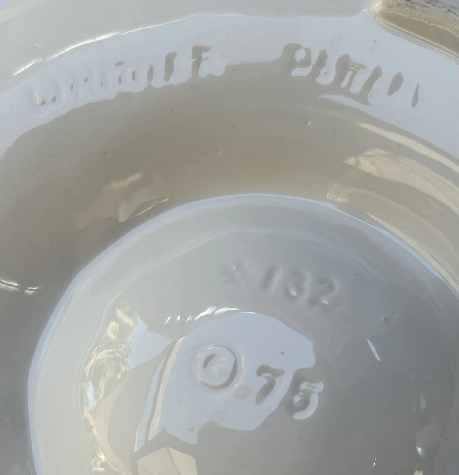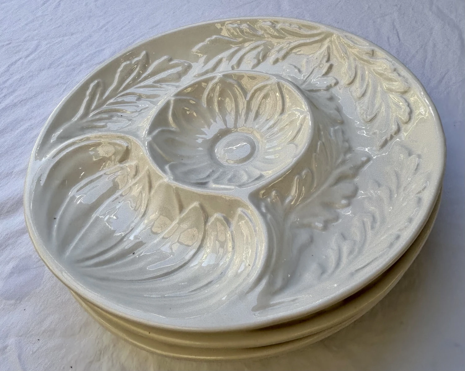 Three beautifully designed Majolica Style white artichoke plates are by Whittier Pottery. Makers Mark: 75 and #132 stamped on the bottom of each plate along with Wittier Pottery.