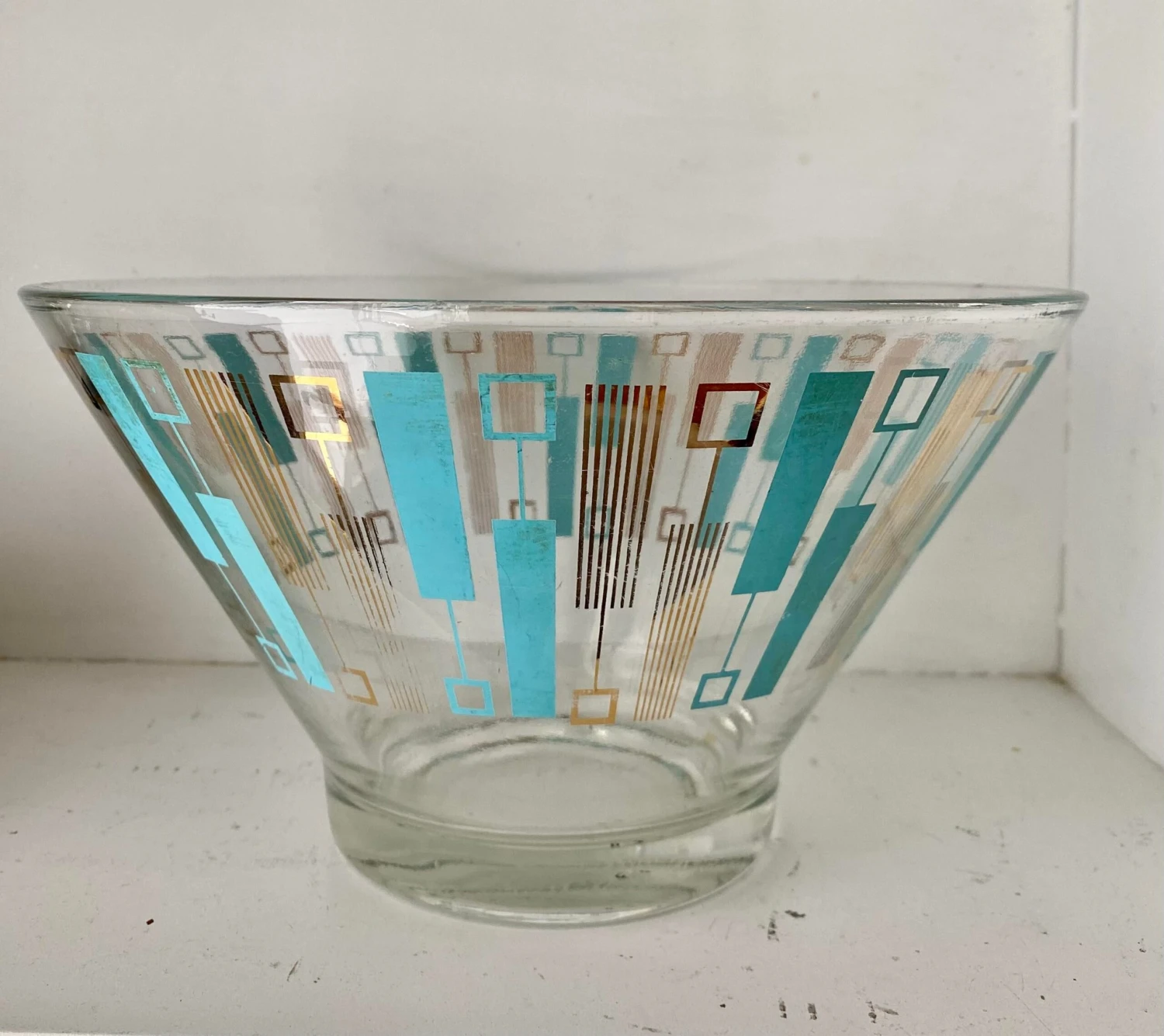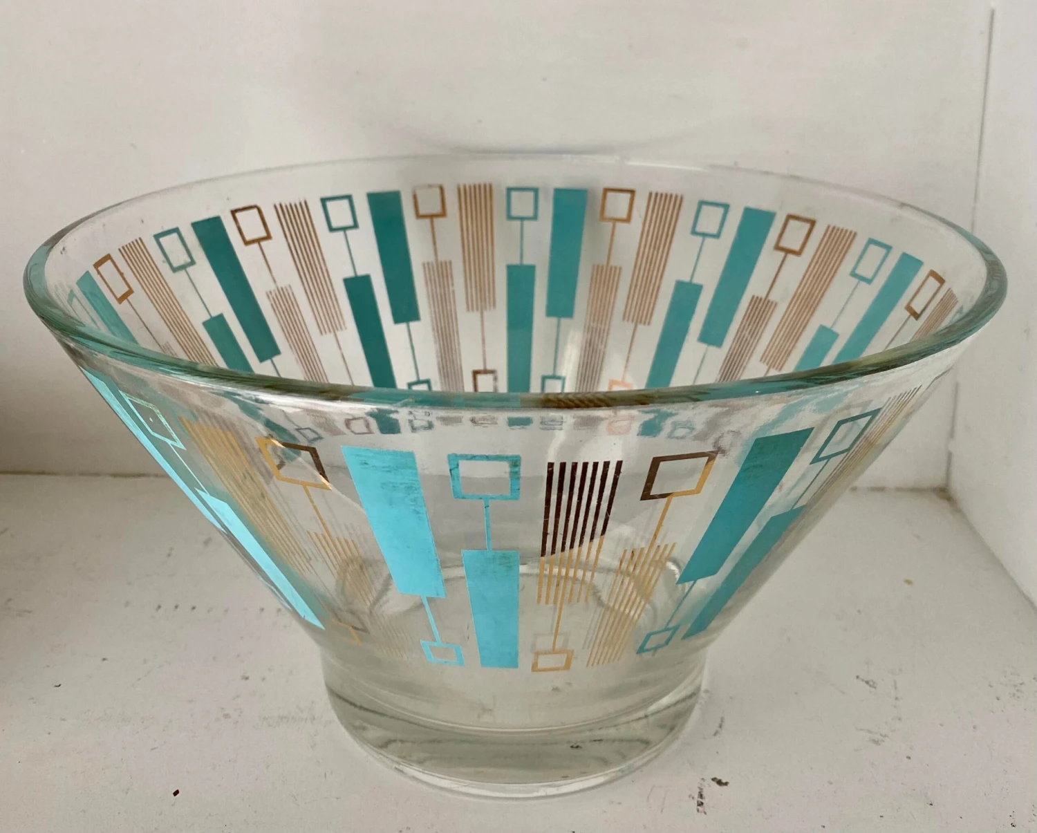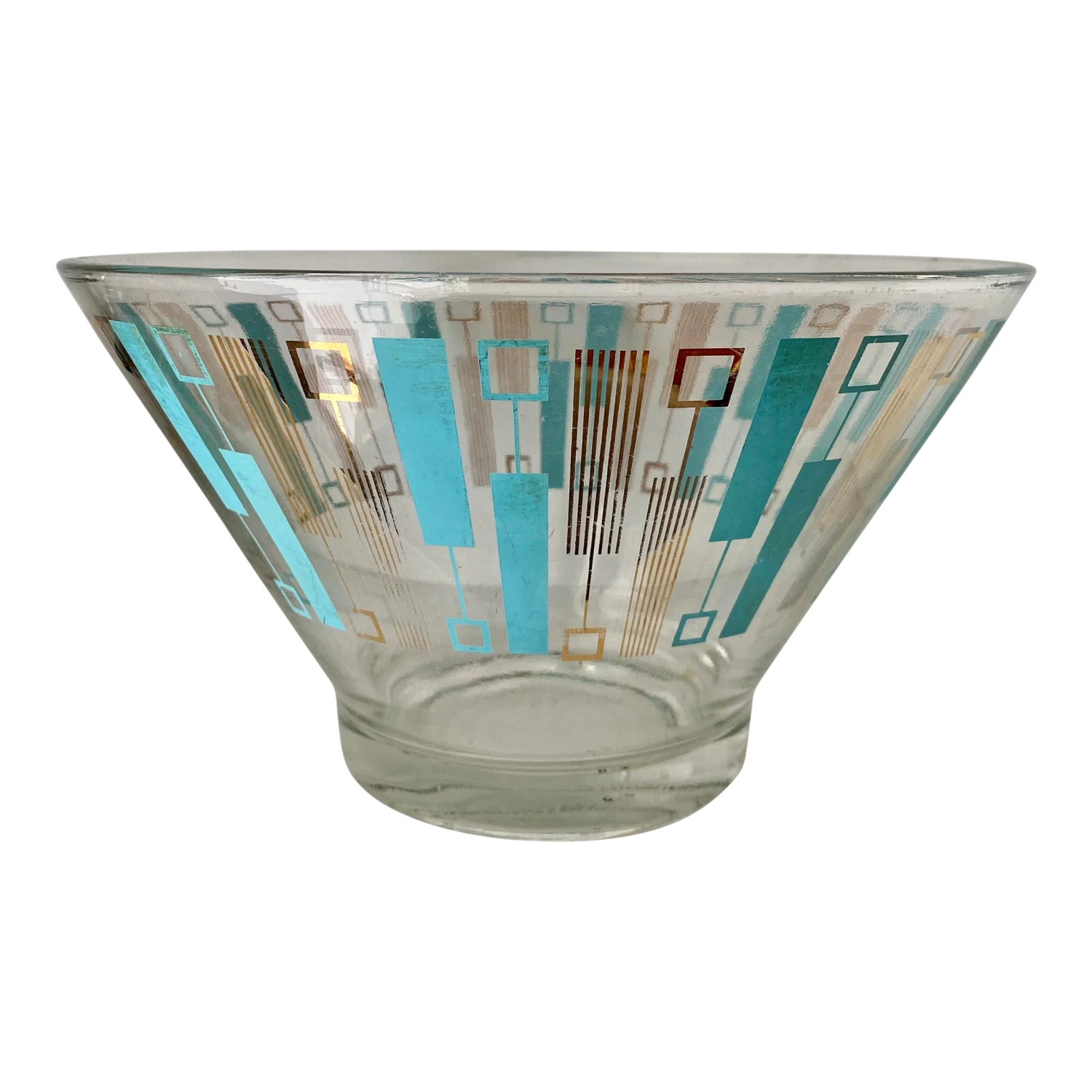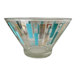 Vintage turquoise and gold abstract pattern Spacial glass era serving bowl.