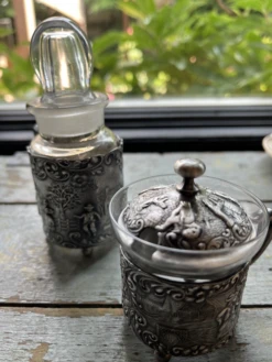 Glass Cruet Set-Early 20th Century Silverplate With Repoussé