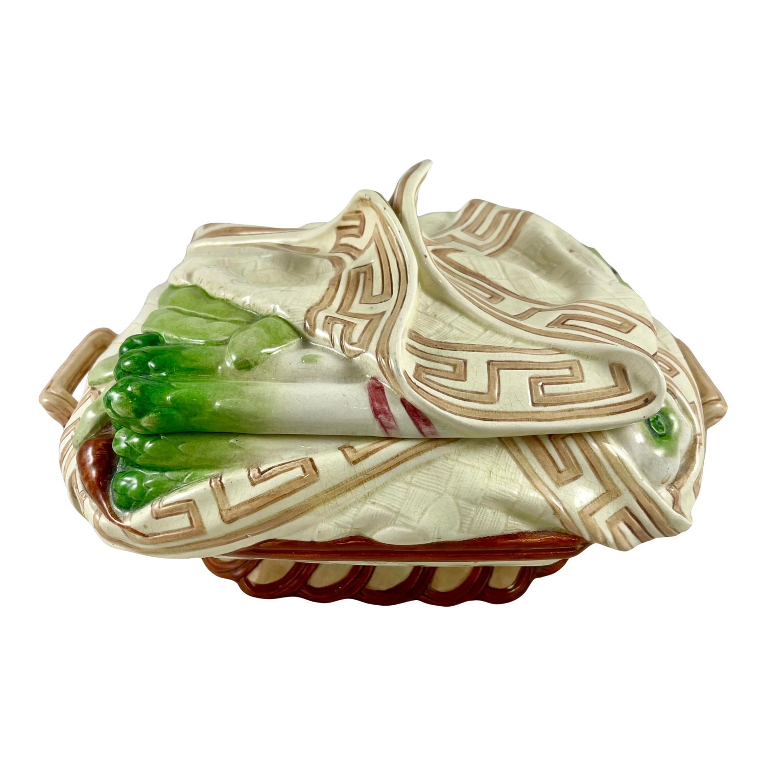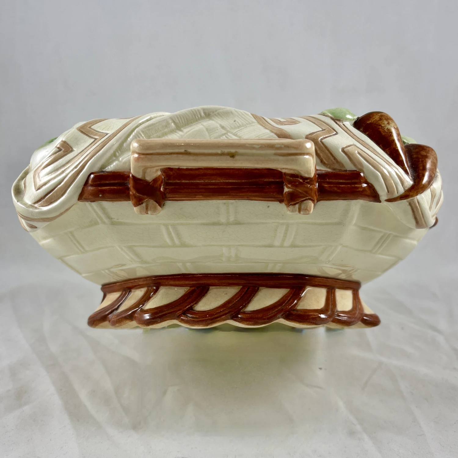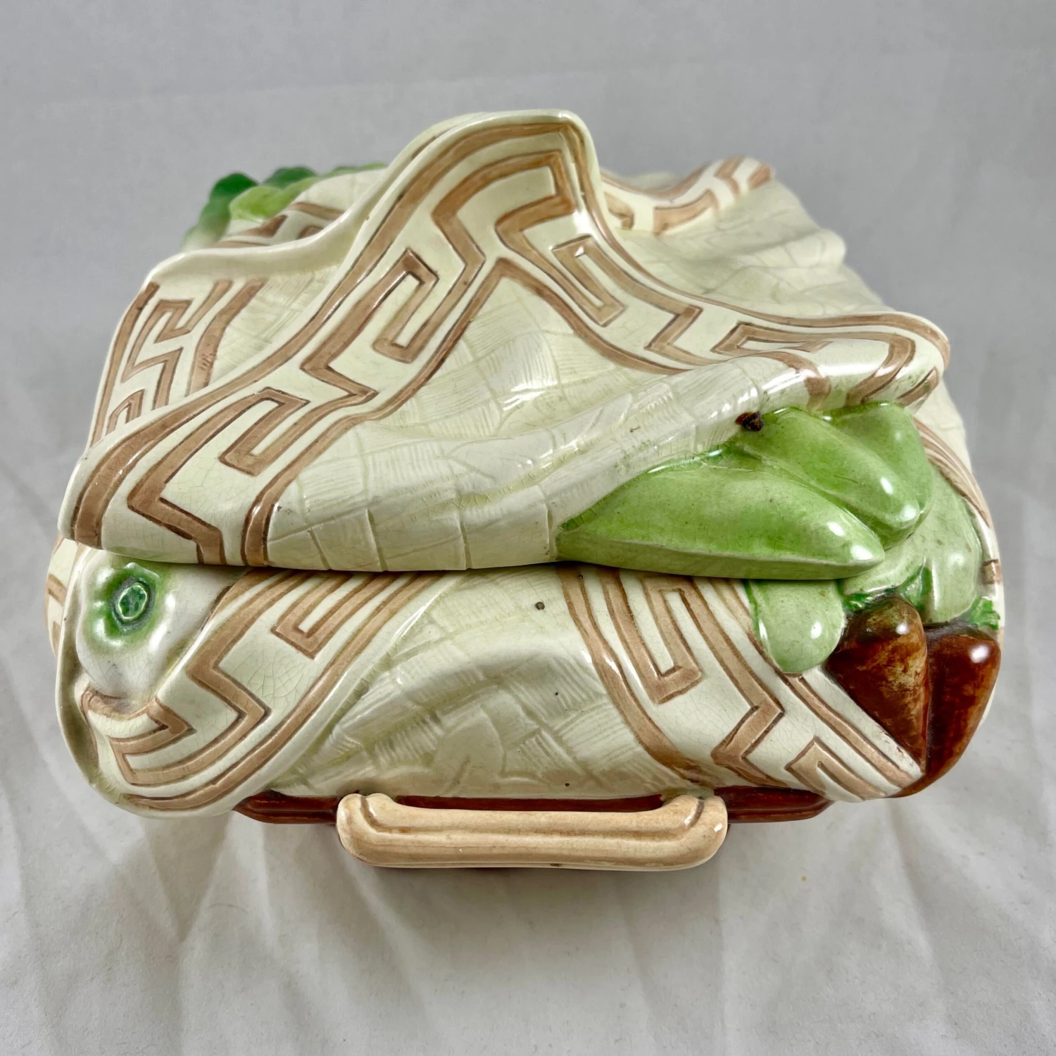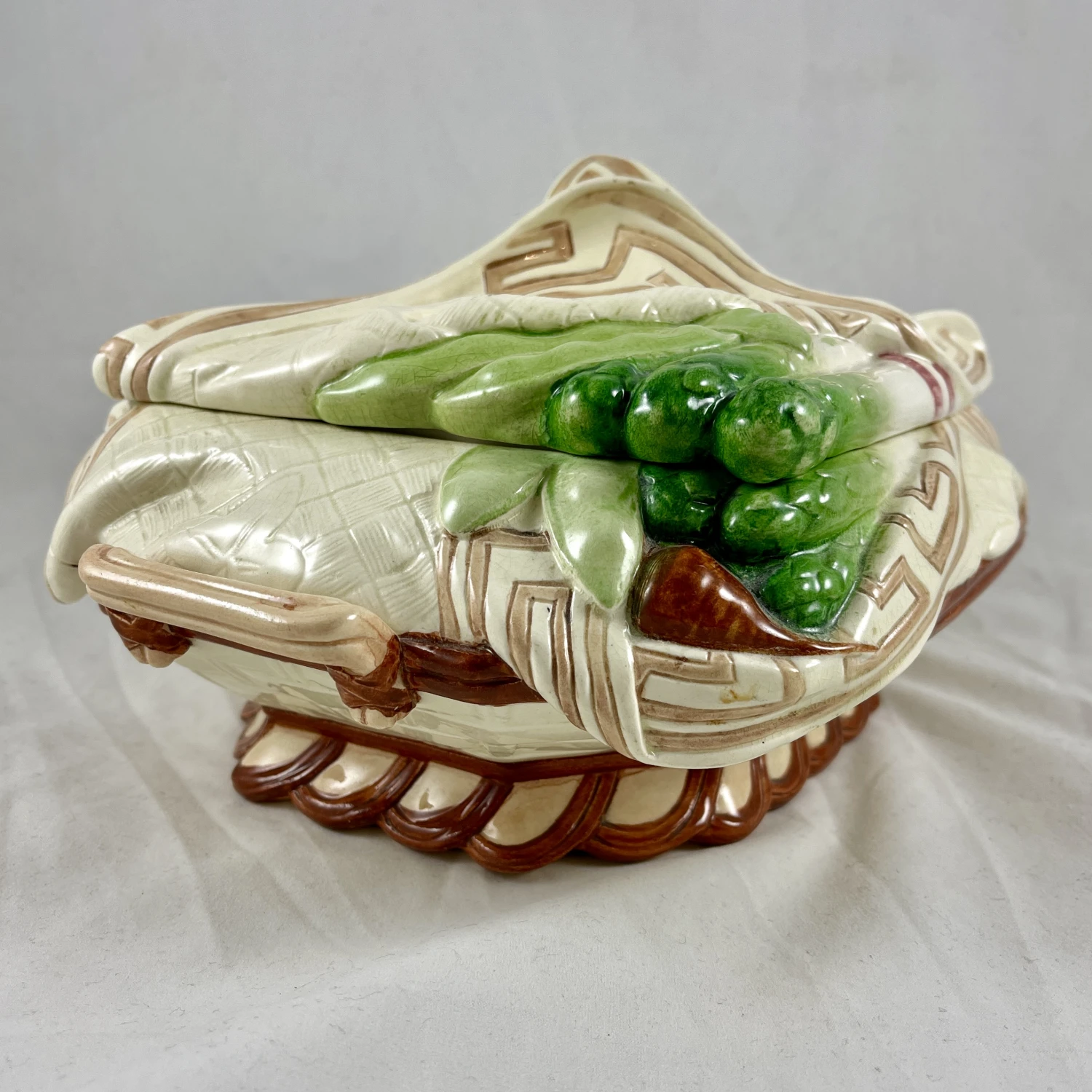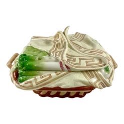 A basket and napkin form covered tureen modeled in the Trompe L’oeil style. The base is molded as a woven basket with two side handles. A ‘cloth’ napkin impressed with a floral and checkered pattern with a Greek key border, lines the basket form base. Peeking out from the napkin, at the corners of both the base and the lid are various vegetables including green asparagus spears, green podded peas, a white turnip top, and small brown carrots. The top handle of the lid is formed by two napkin peaks.