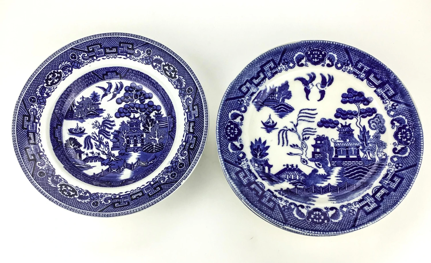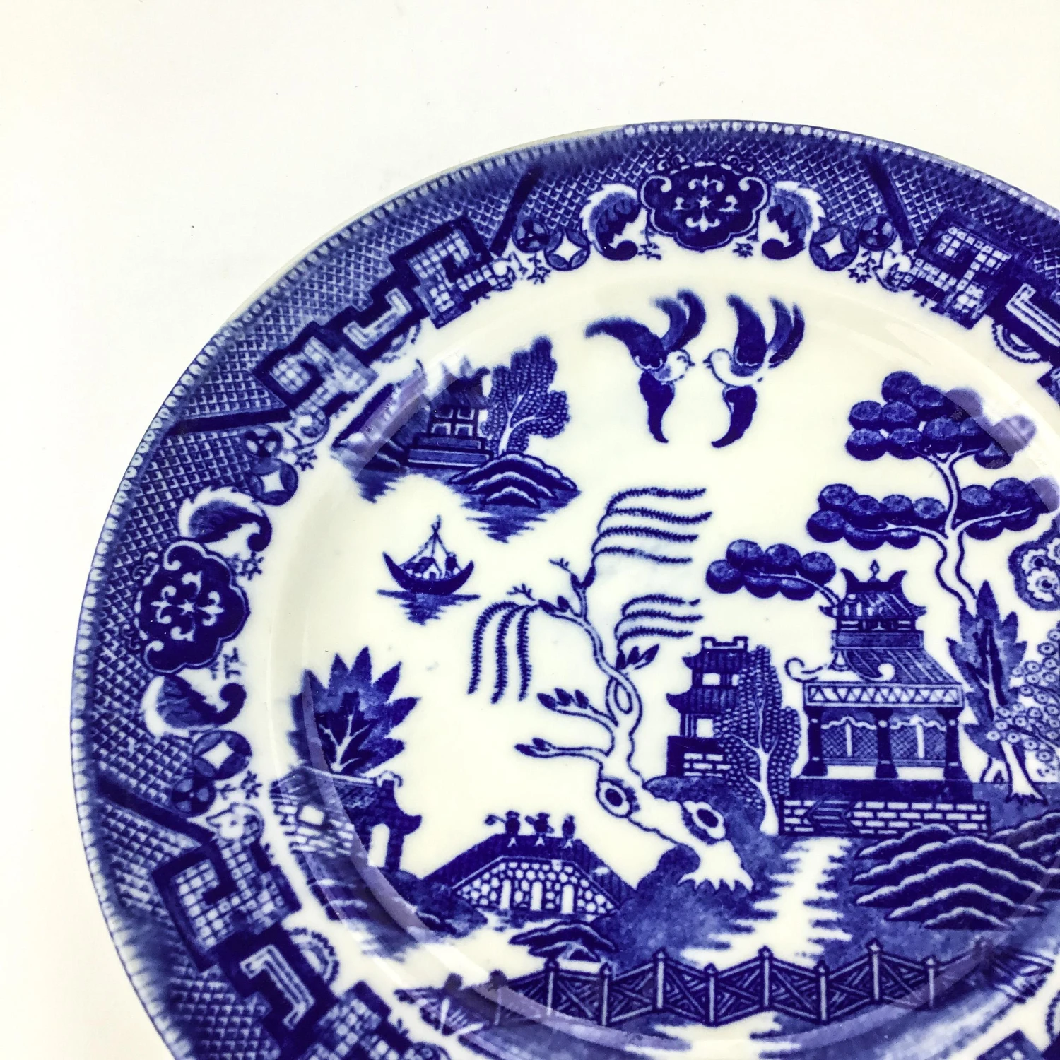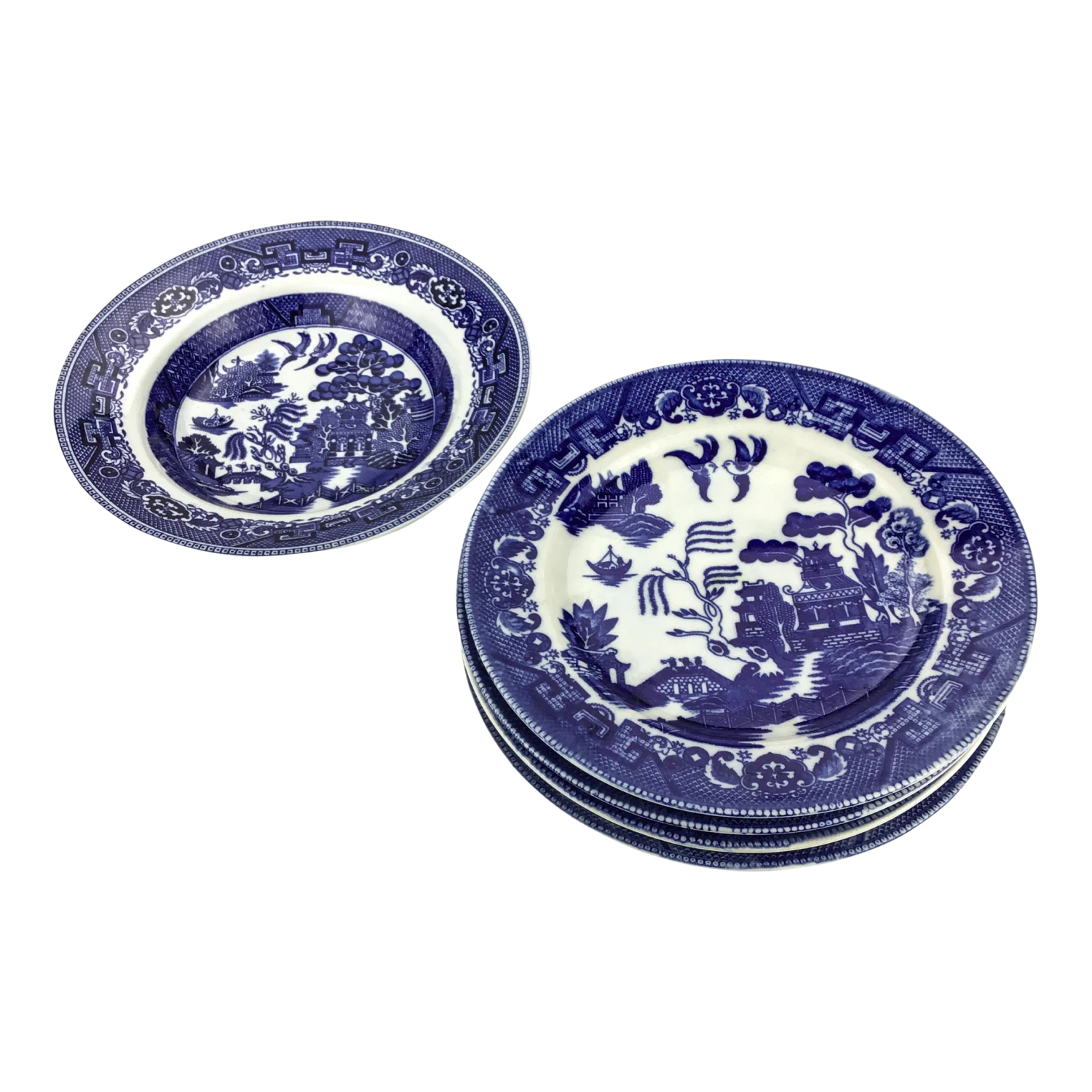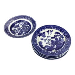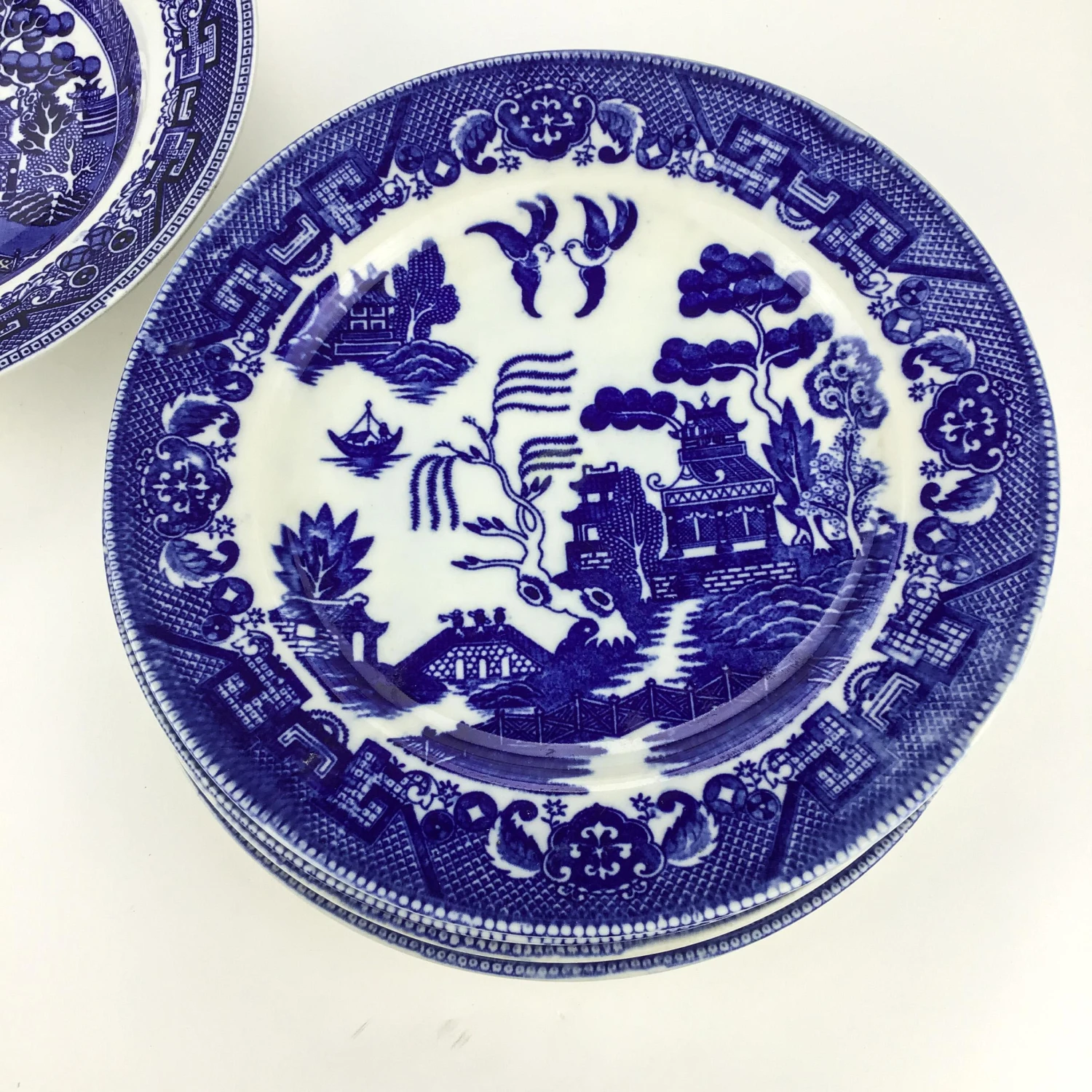 Add these cool bright plates and bowl to your existing collection for your entertaining. If you love Blue Willow, these dishes are to good to pass up. No crazing as you normally find on plates this age. Plates made in Japan by YS. Bowl made in England by BCM Nelson Ware.