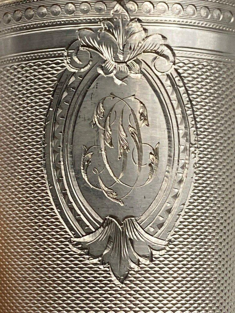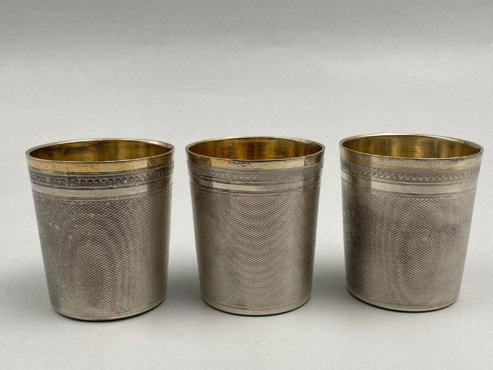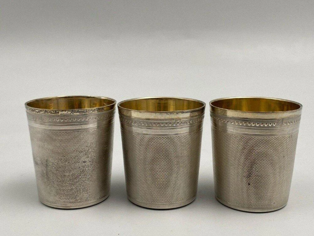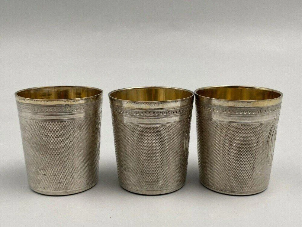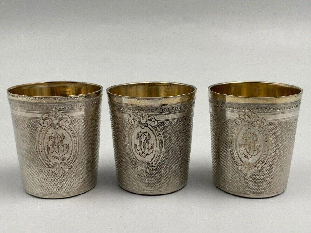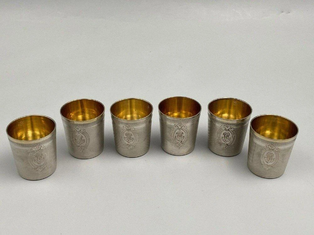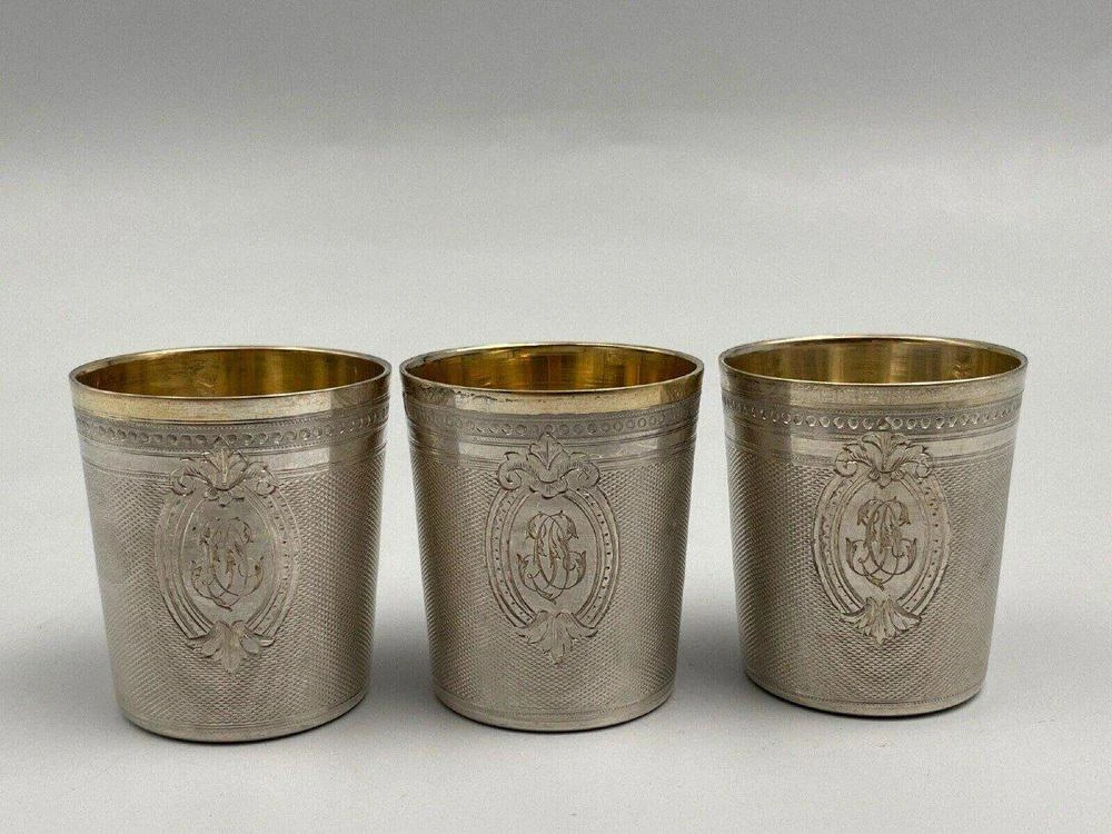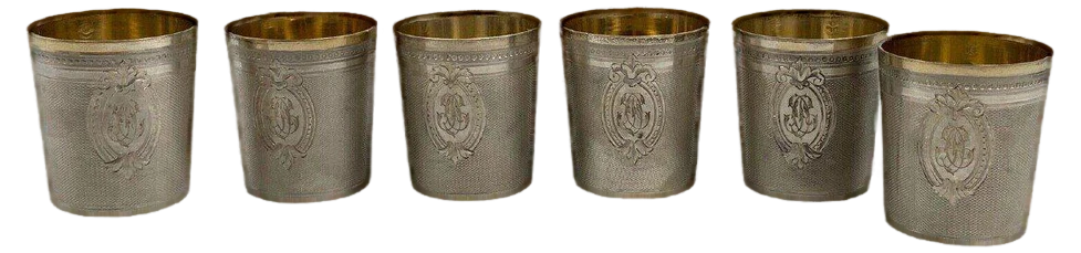 These liqueur cups bear the following hallmarks: Minerva and Bigorne. They are vermilion inside. They are late 19th century. They carry a monogram, they are guilloche. They weigh 124 grams each. For the state, we report friction and micro-scratches from use, small stains and slight bumps, nothing serious, these cups remain in a good state of conservation. Our many photos allow you to appreciate the quality of the objects. For the state thank you for detailing the photos. Feel free to zoom. The photos are an integral part of the description. Dimensions: Height: 4 cm Neck diameter: 3.5 cm Bottom diameter: 2.8 cm.