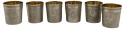 These liqueur cups bear the following hallmarks: Minerva and Bigorne. They are vermilion inside. They are late 19th century. They …