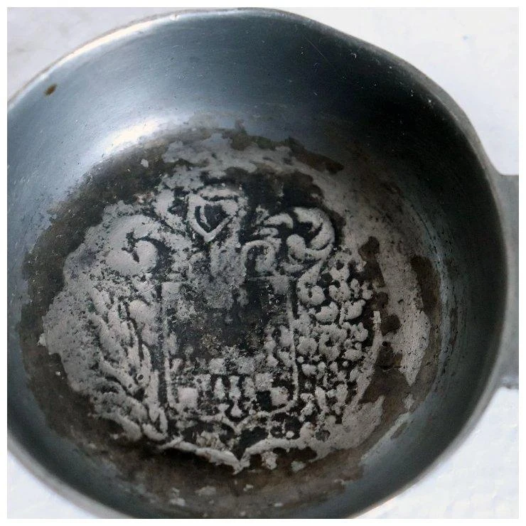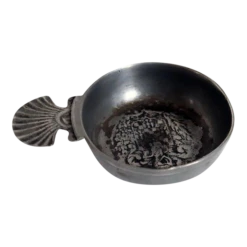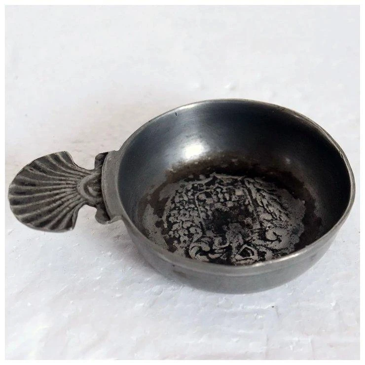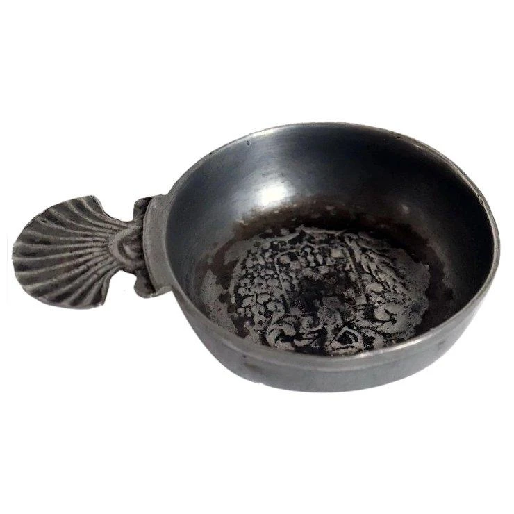 A vintage wine tasting cup with armorial in the bowl and a single shell form handle. This form of small, shallow, flat handle bowl was traditionally used as a wine tasting cup (tastevin) by a sommelier or a wine maker.