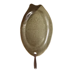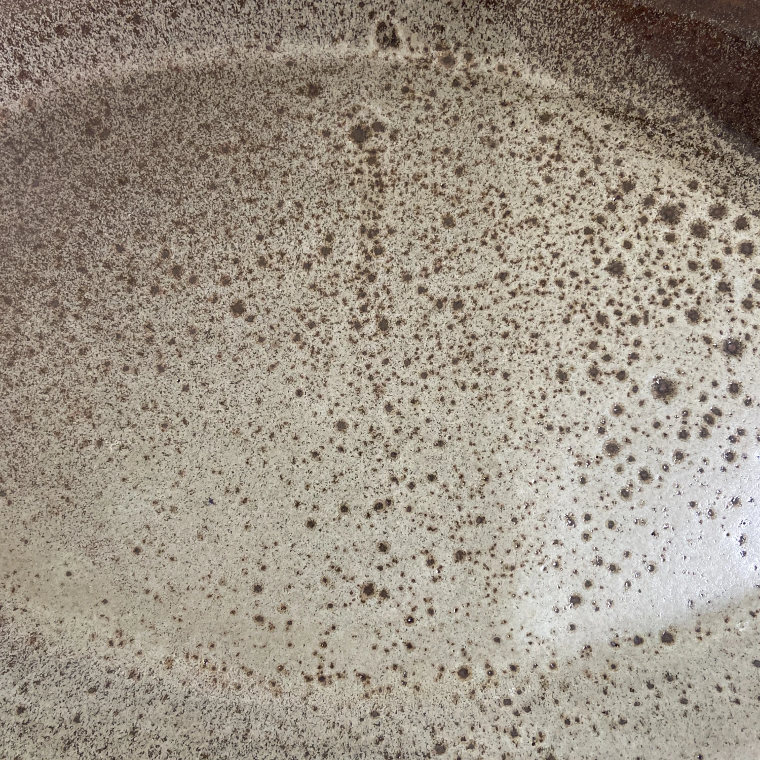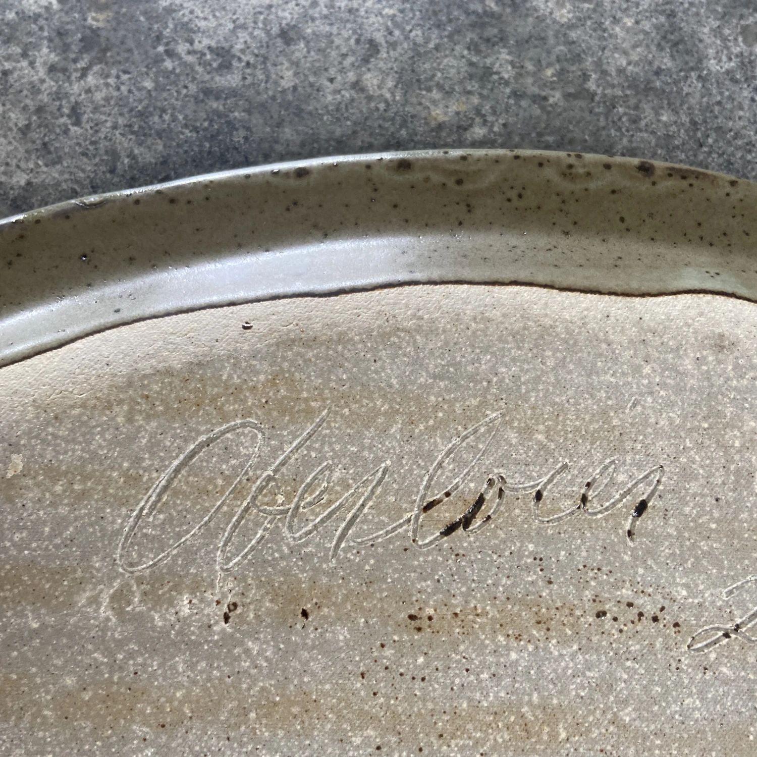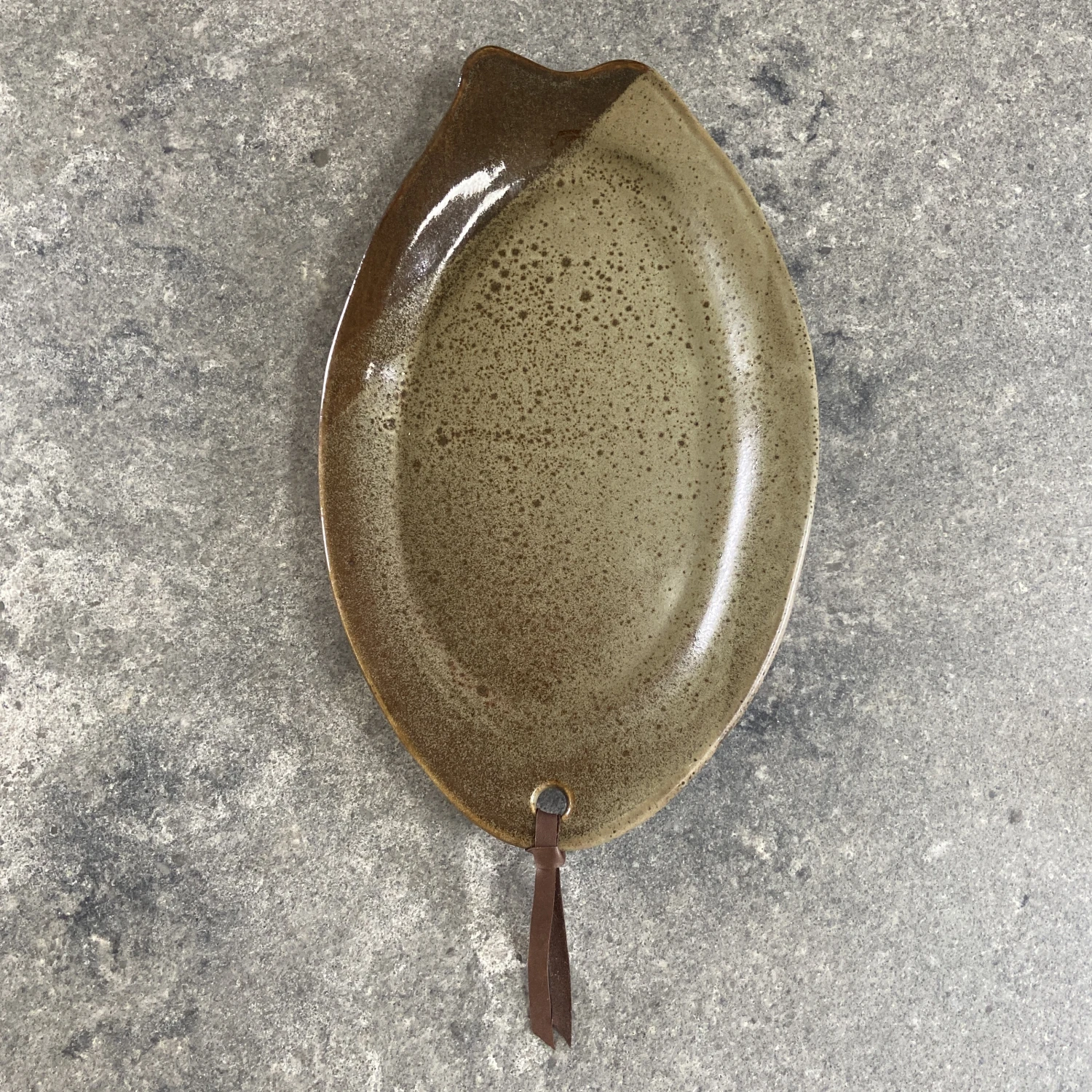 Gorgeous handmade clay platter in earthy neutral speckle glazes. Removable leather tab at end. Signed on bottom.