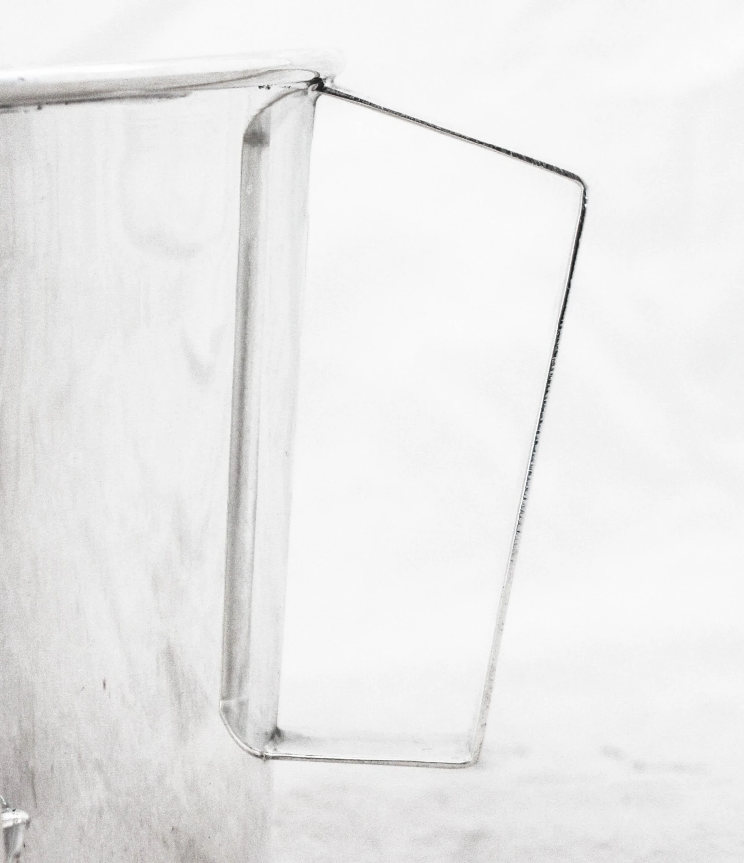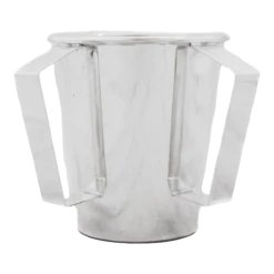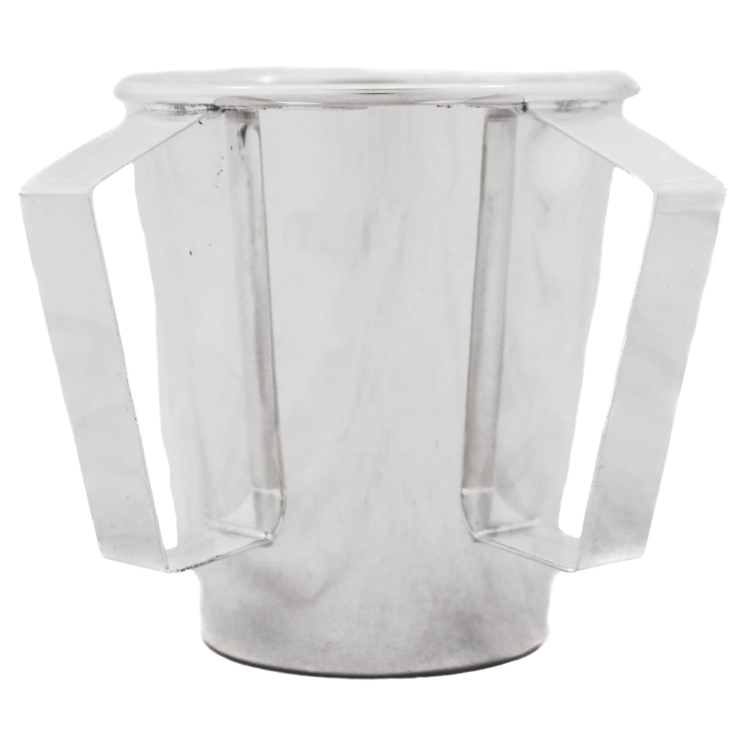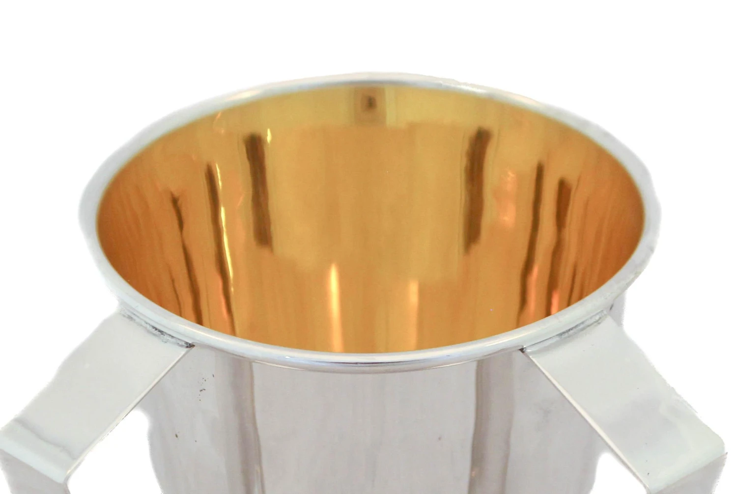 We are happy to offer you this sterling silver washing cup (n’tillat yadaiyim in Hebrew). It is used to wash the hands before eating bread and praying. This cup is uber-sleek and modern, it has that “hotel silver” look. The shape is contemporary with it angular handles and straight top. The inside is gold washed to protect it from water spots.