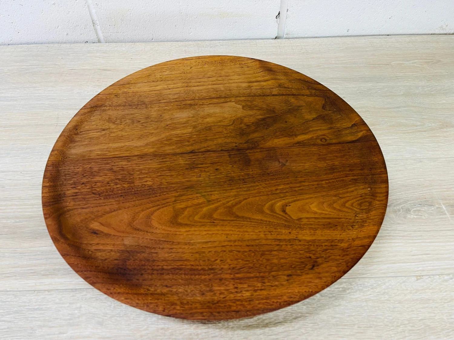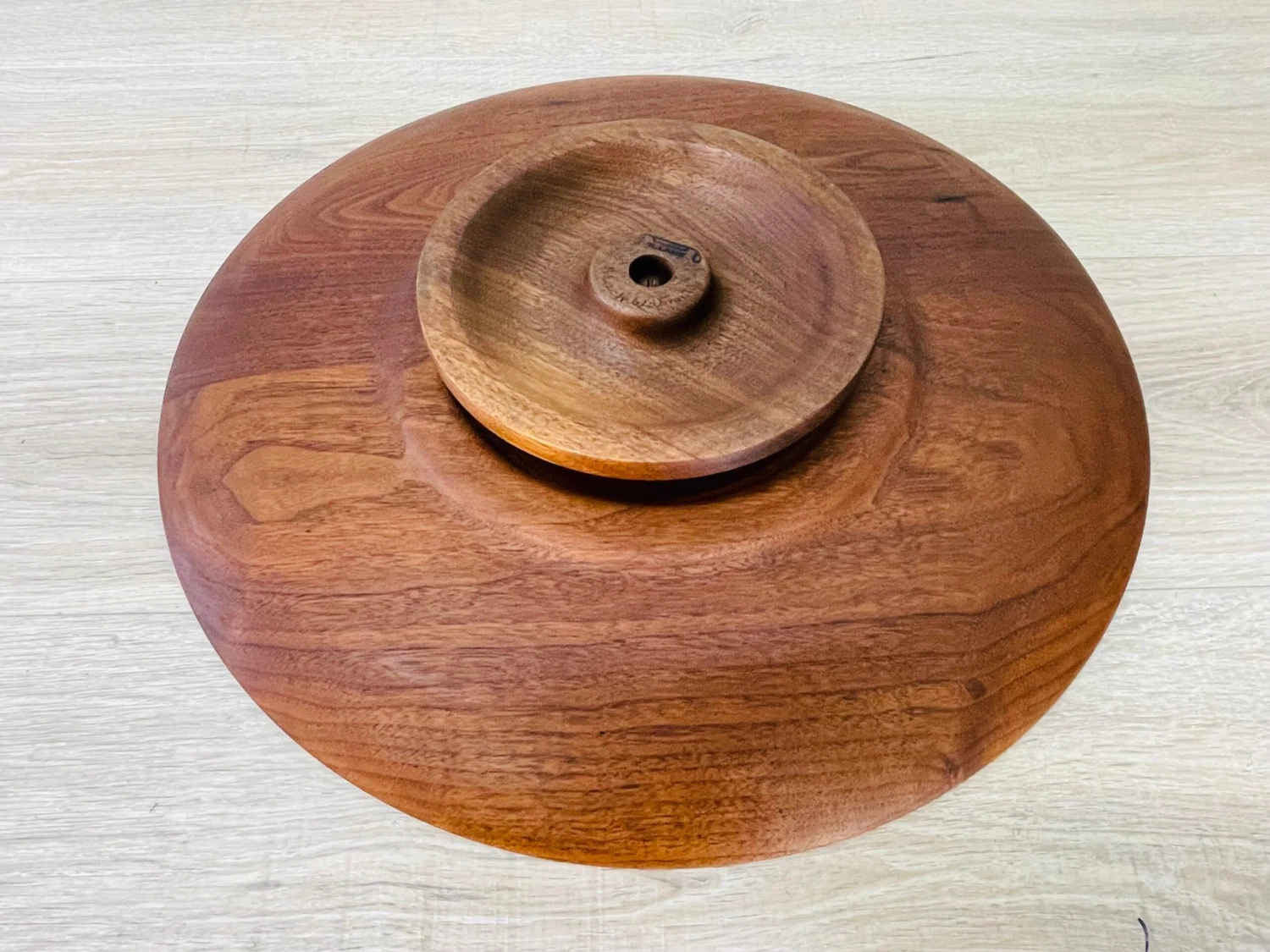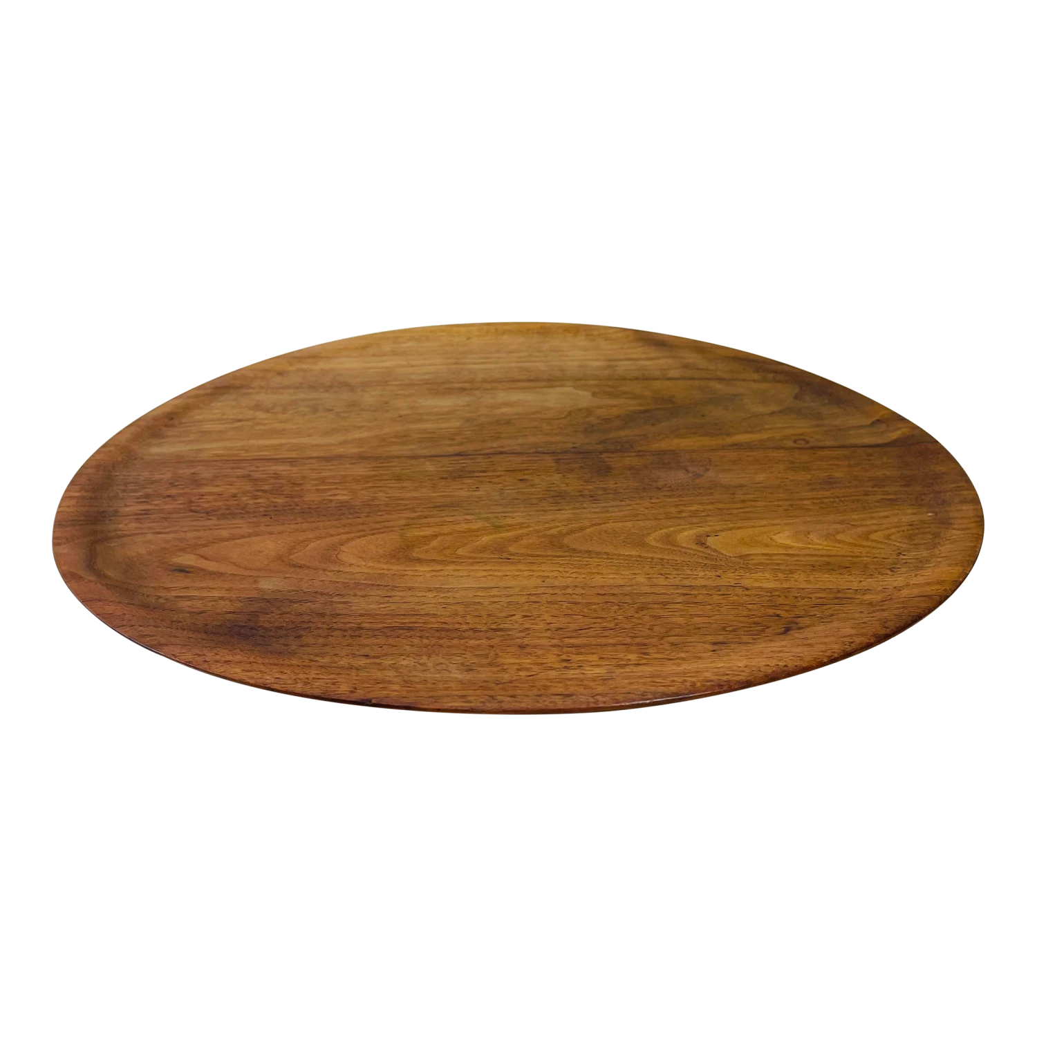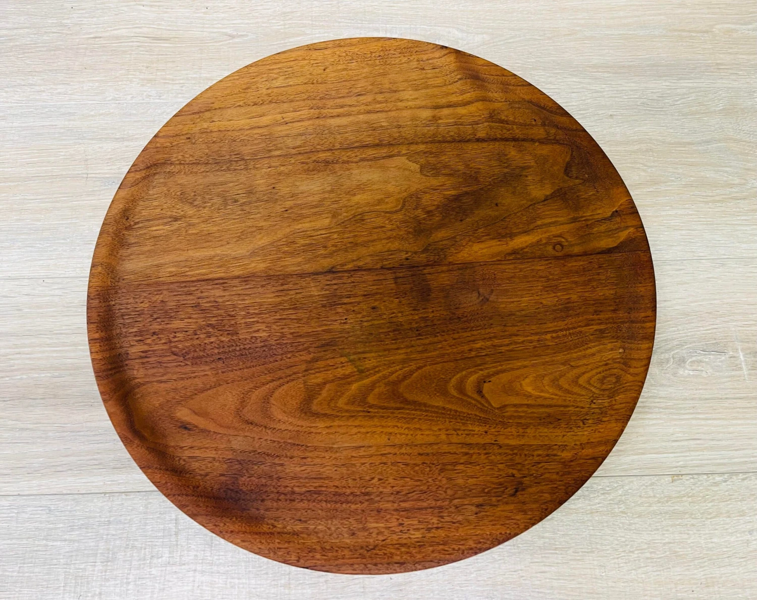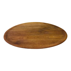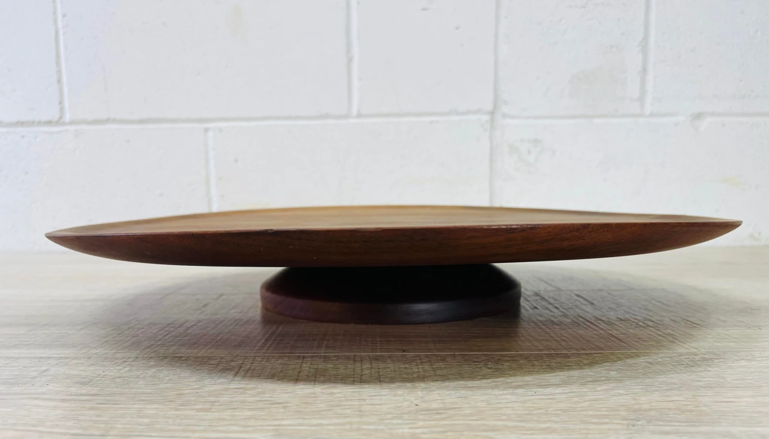 Vintage 1960s black walnut round swivel center serving plate. Newly refinished condition. Marked underneath.
