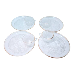 Eight piece plate and cup set made by Anchor Hocking in the 1960s. The set is sandwich Clear and desert …
