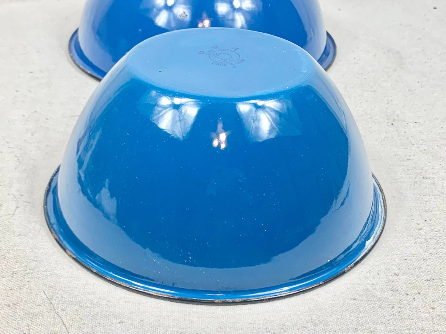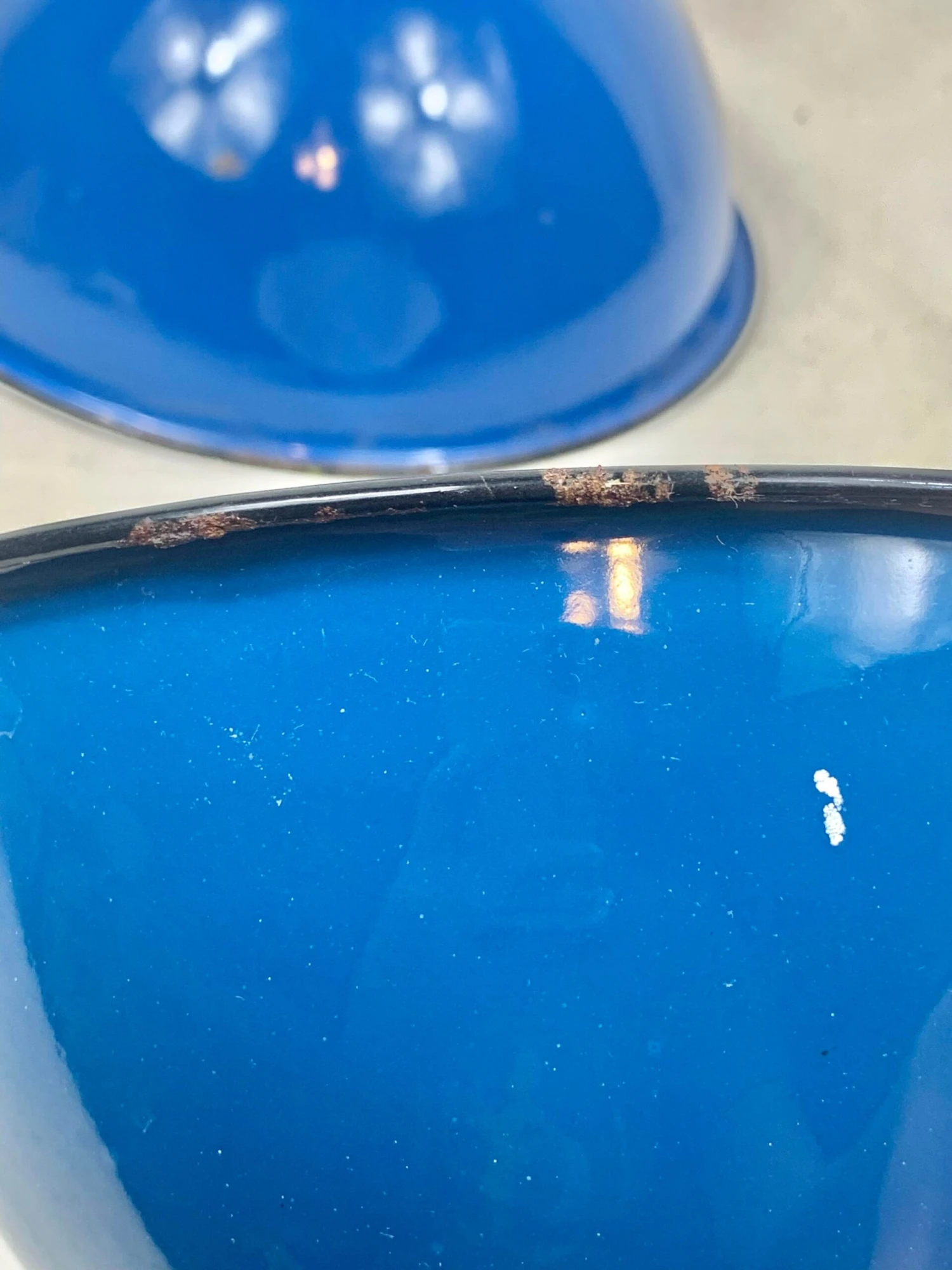 Vintage pair of enamel metal bowls. Both have blue sides with black rims. The inside is white. One is made …