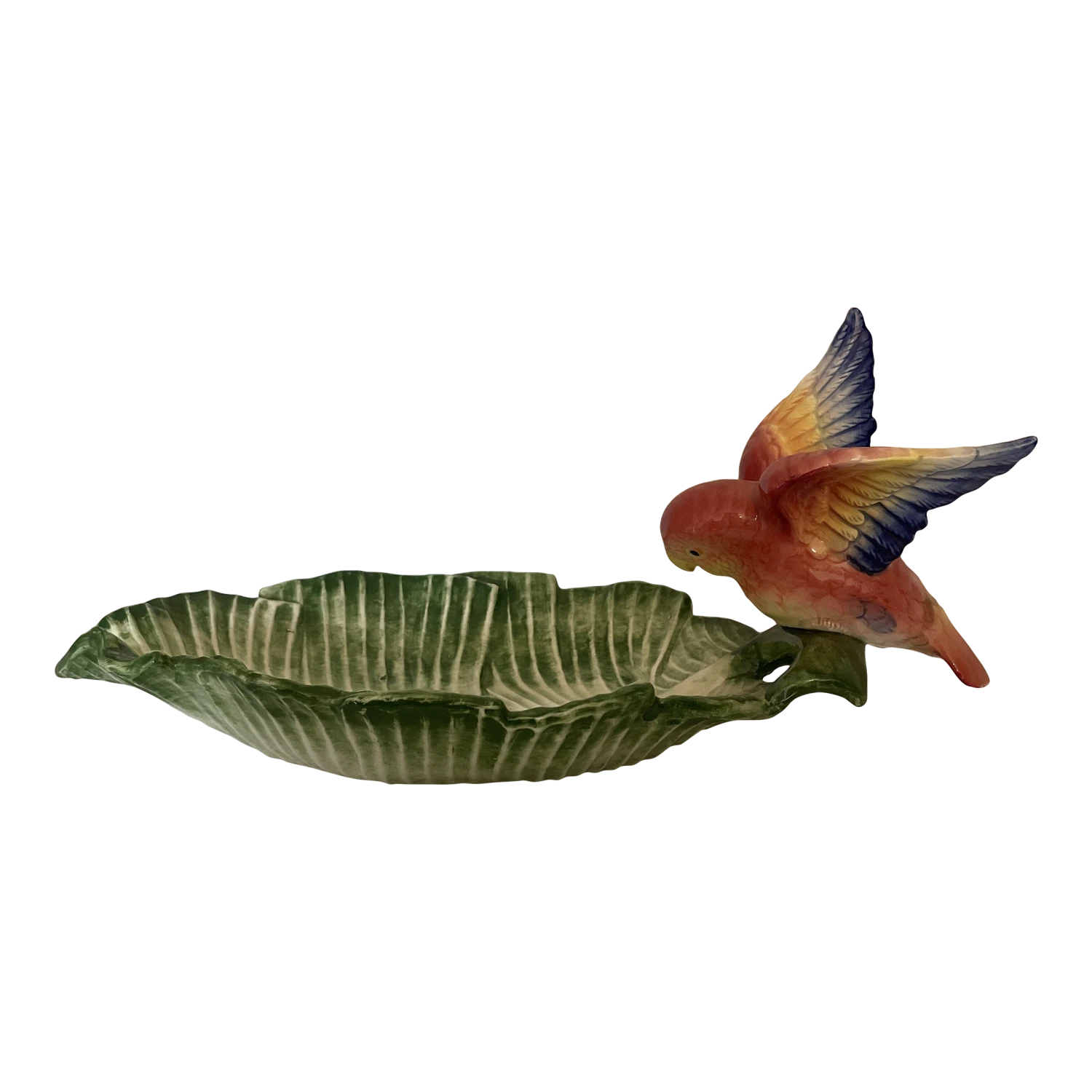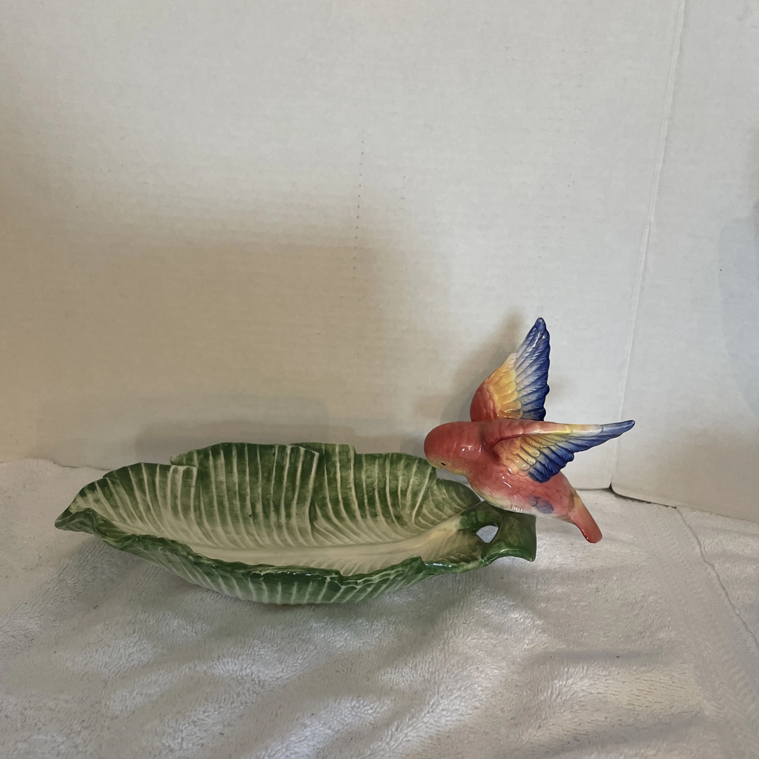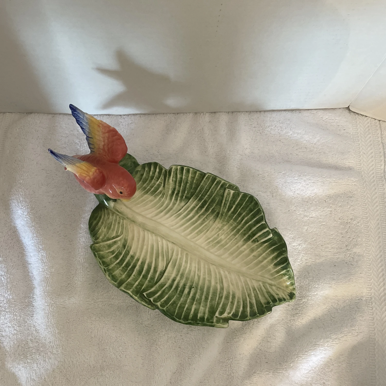 Charming vintage serving dish. Perfect for dining al fresco! The sweetest parakeet sitting on a large leaf.