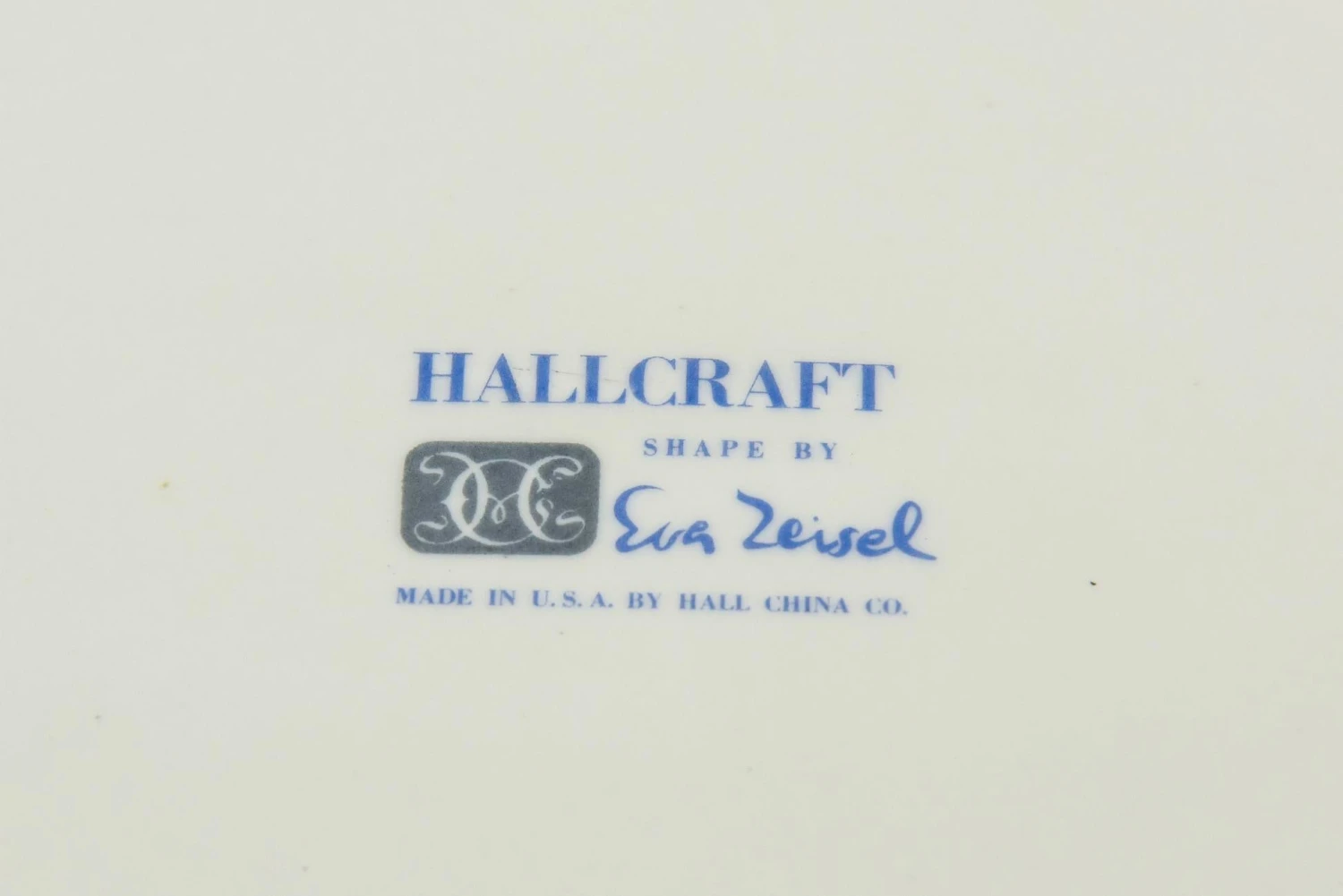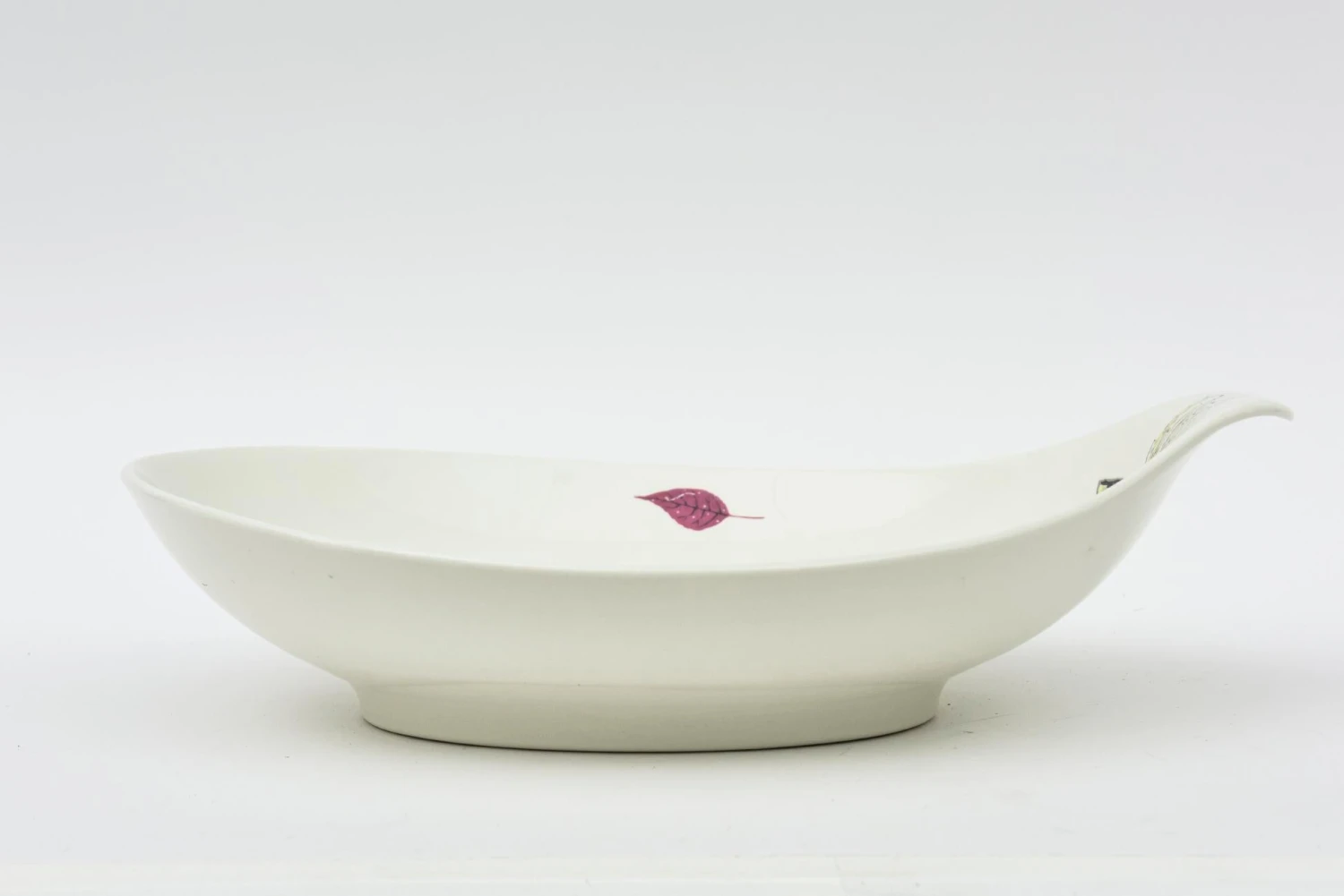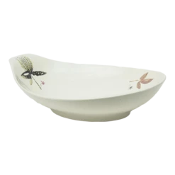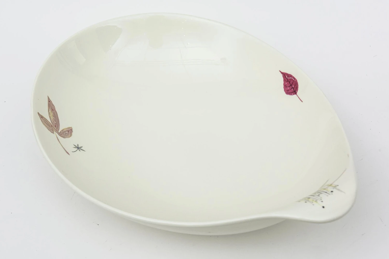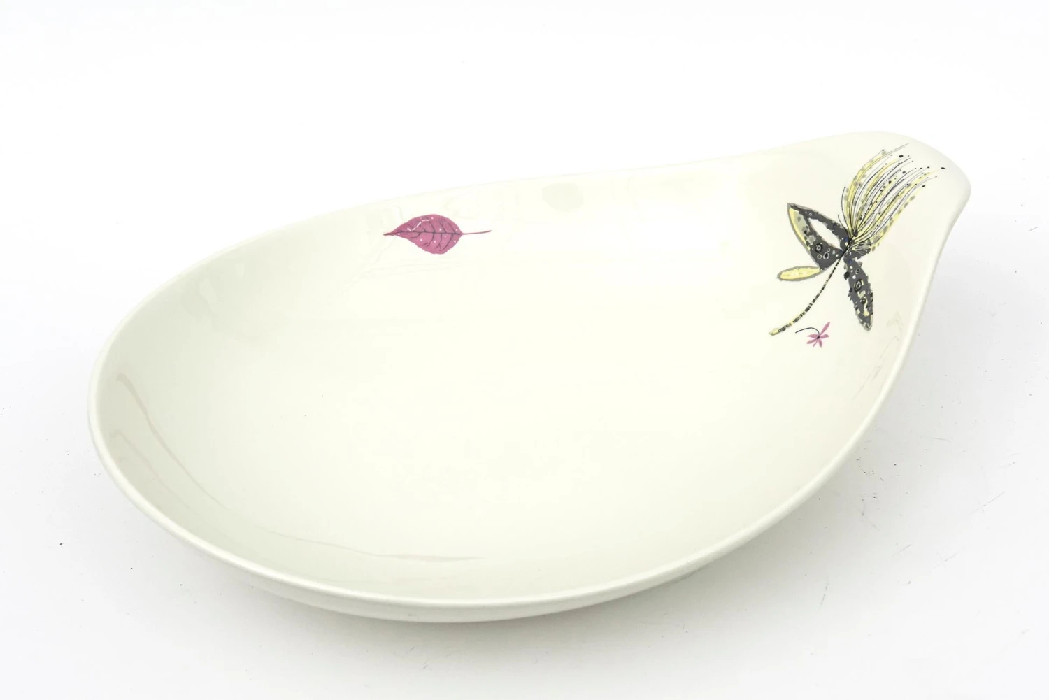 This large vintage ceramic bowl designed by Eva Zeisel for her Hallcraft collection in 1957 is a a teardrop shape. It was designed for the porcelain giant which was the Hall China Company. It remained in production until the end of the decade. It has the adornment of a butterfly, leaf and flower. Against the off white ceramic colors are pinky red, charcoal black, yellow, pink and tan. This is perfect for serving. It is a beautiful shape and delicately detailed. MId Century Modern.