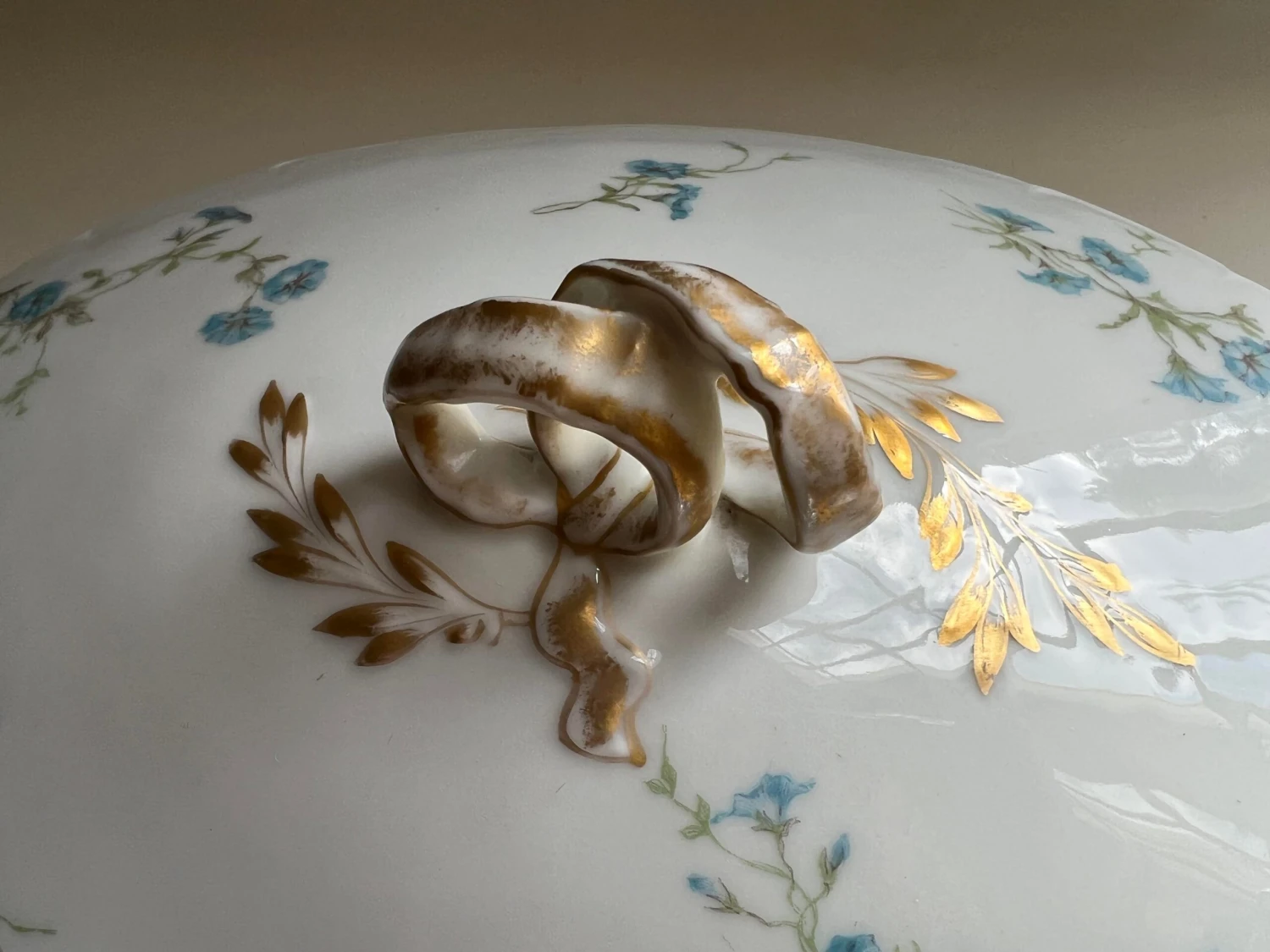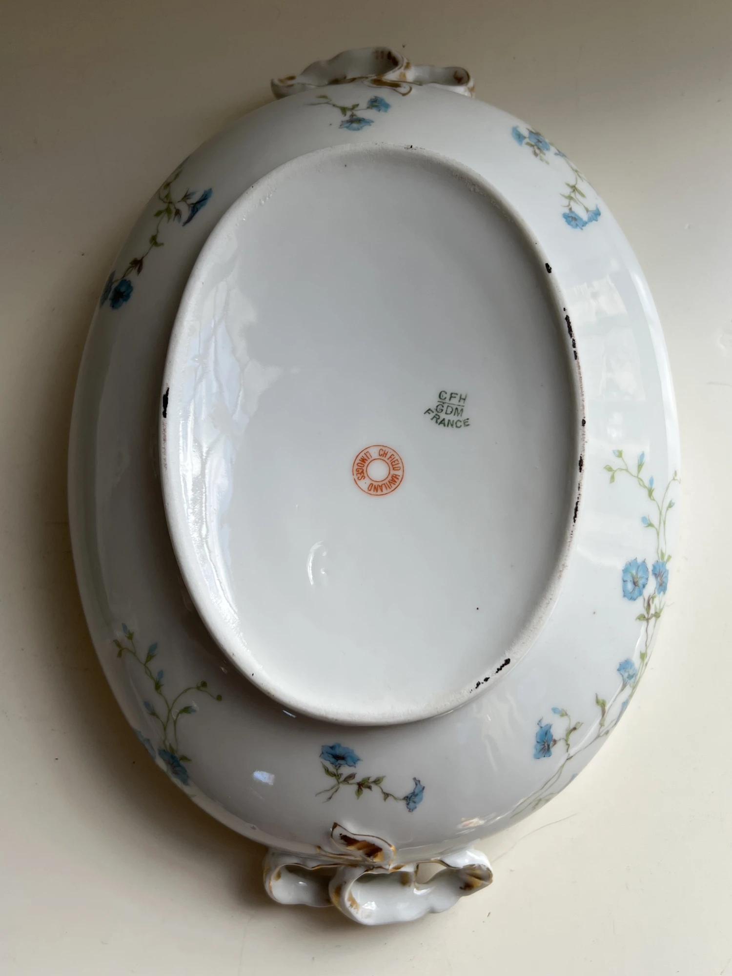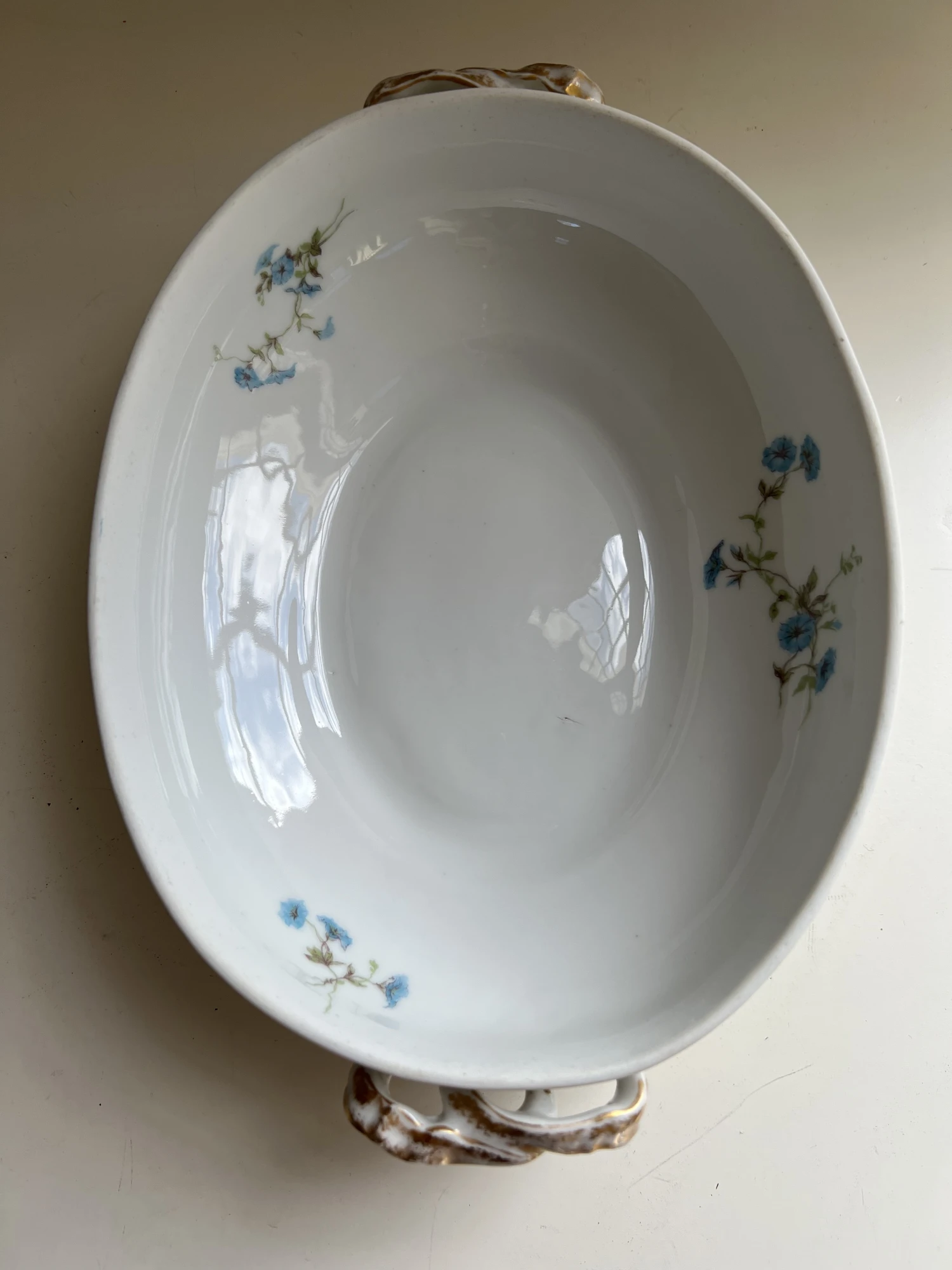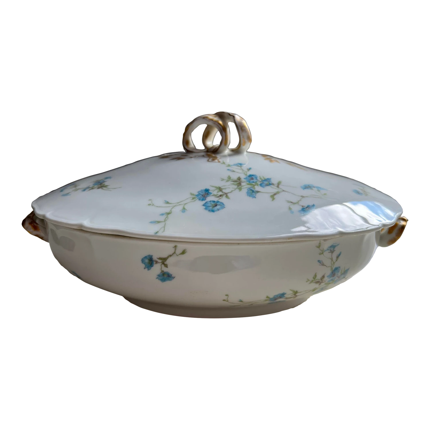 with lid. Features delicate blue floral pattern with gilt touches on handles. Measures 11” wide, 8” deep and 4.5” tall. Excellent condition with no chips, cracks or crazing, some manufacturing imperfections. See matching soup tureen also offered for sale.