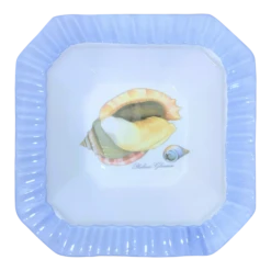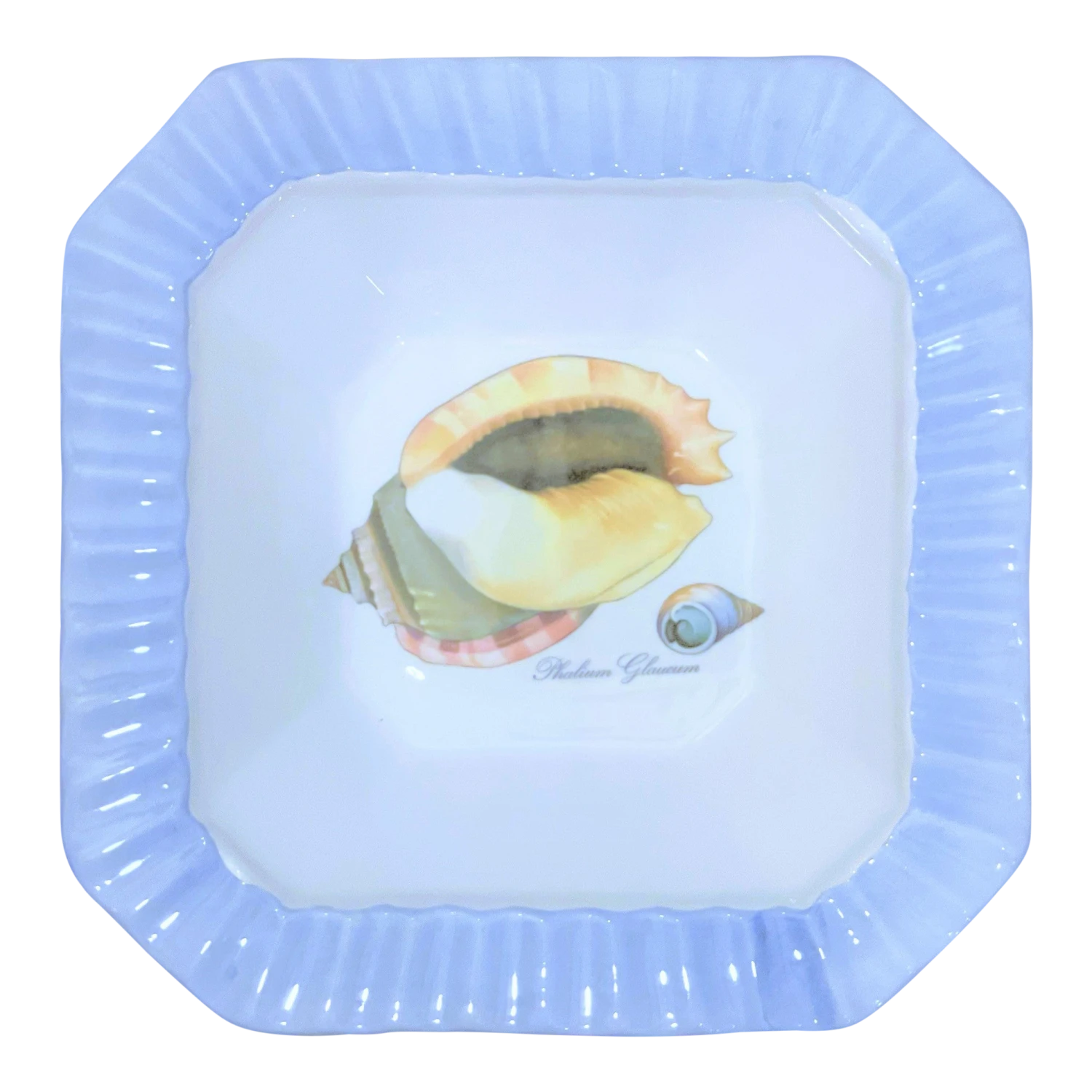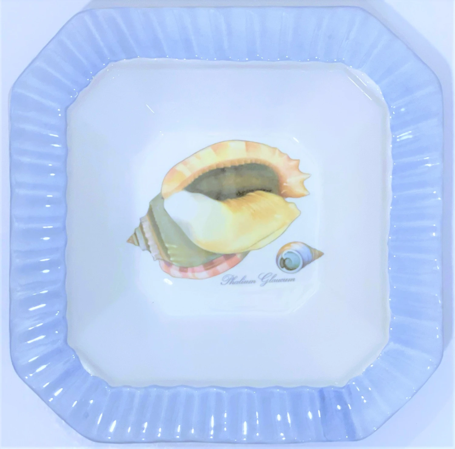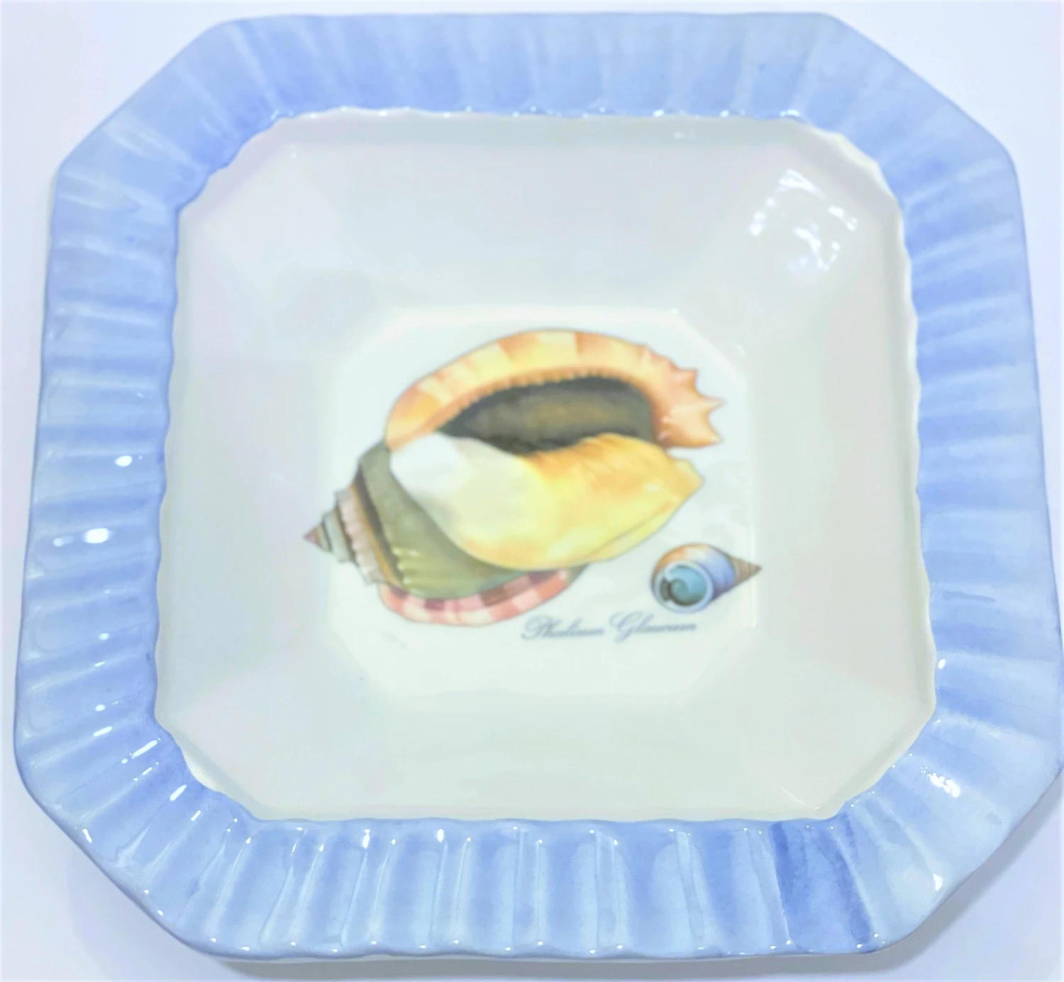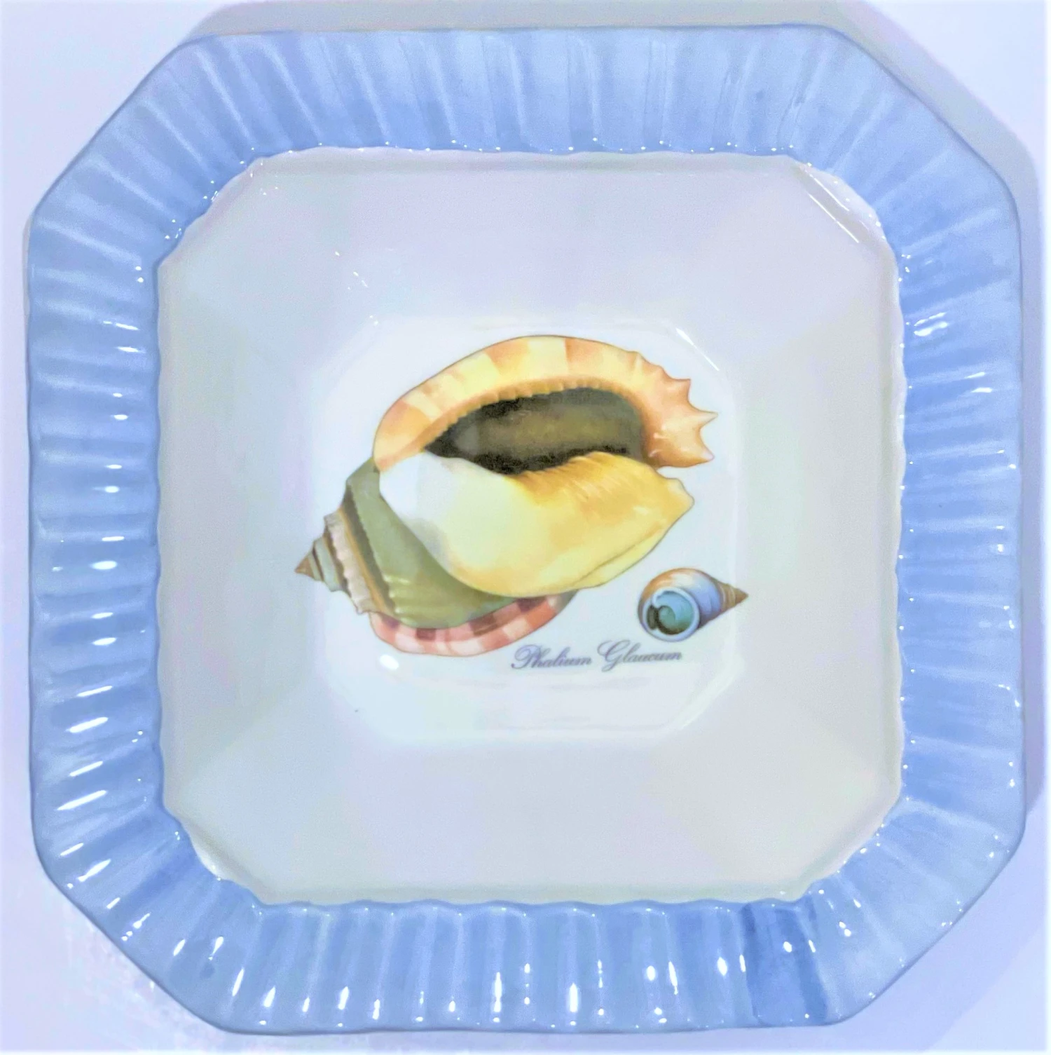 This is a beautiful Italian hand painted and glazed bowl in a coastal design of sea shell. The shell has the proper latin species name, “Phalium glaucum”. The bowl is produced by Due Torri Ceremichie The square shaped bowl has a creamy cornflower blue scalloped border with a white ground. This bowl is about 9.5 inches wide and 3.5 inches high. We have a matching bowl that will be listed as well that coordinates well with this. Perfect for summer entertaining.