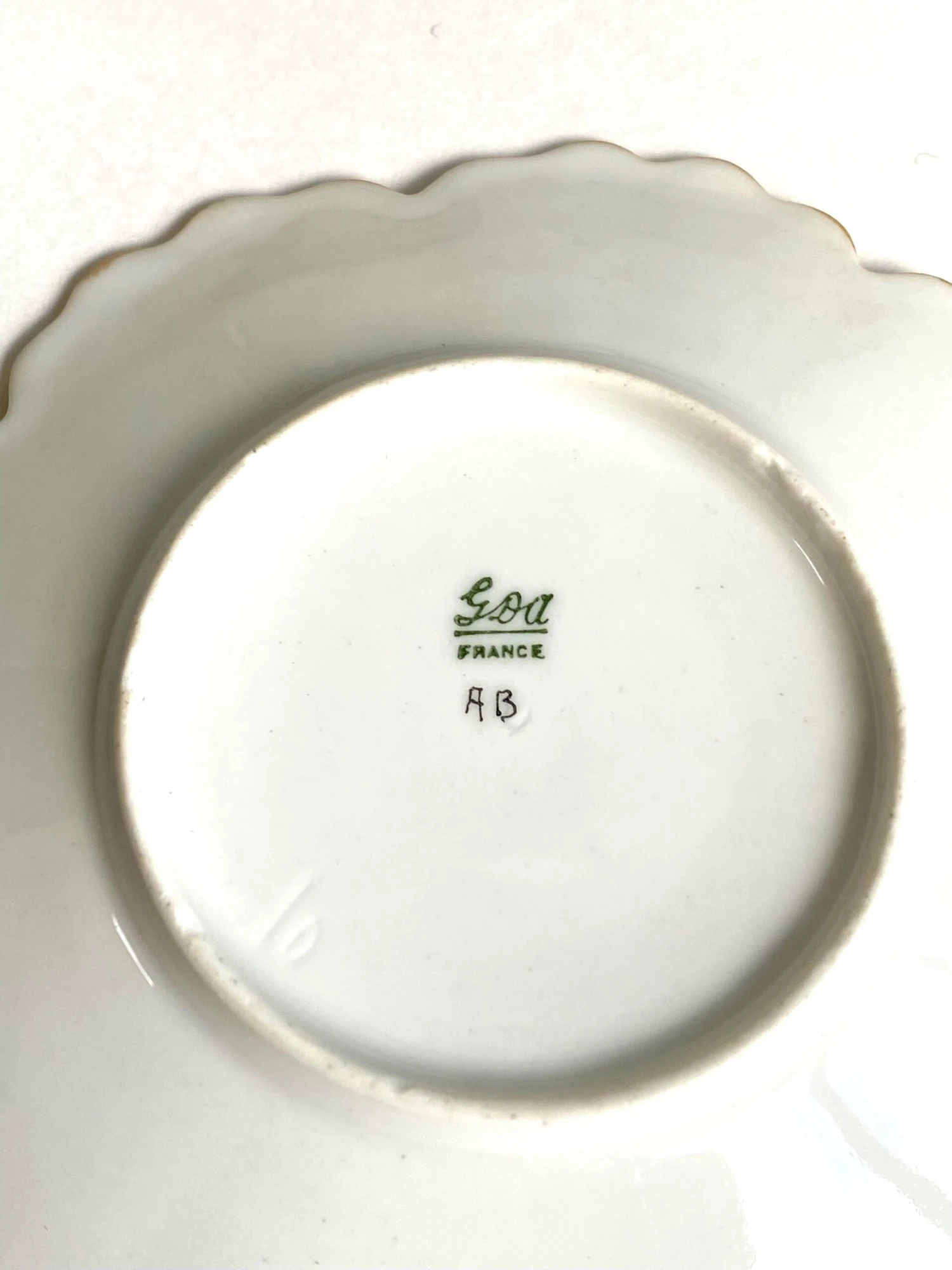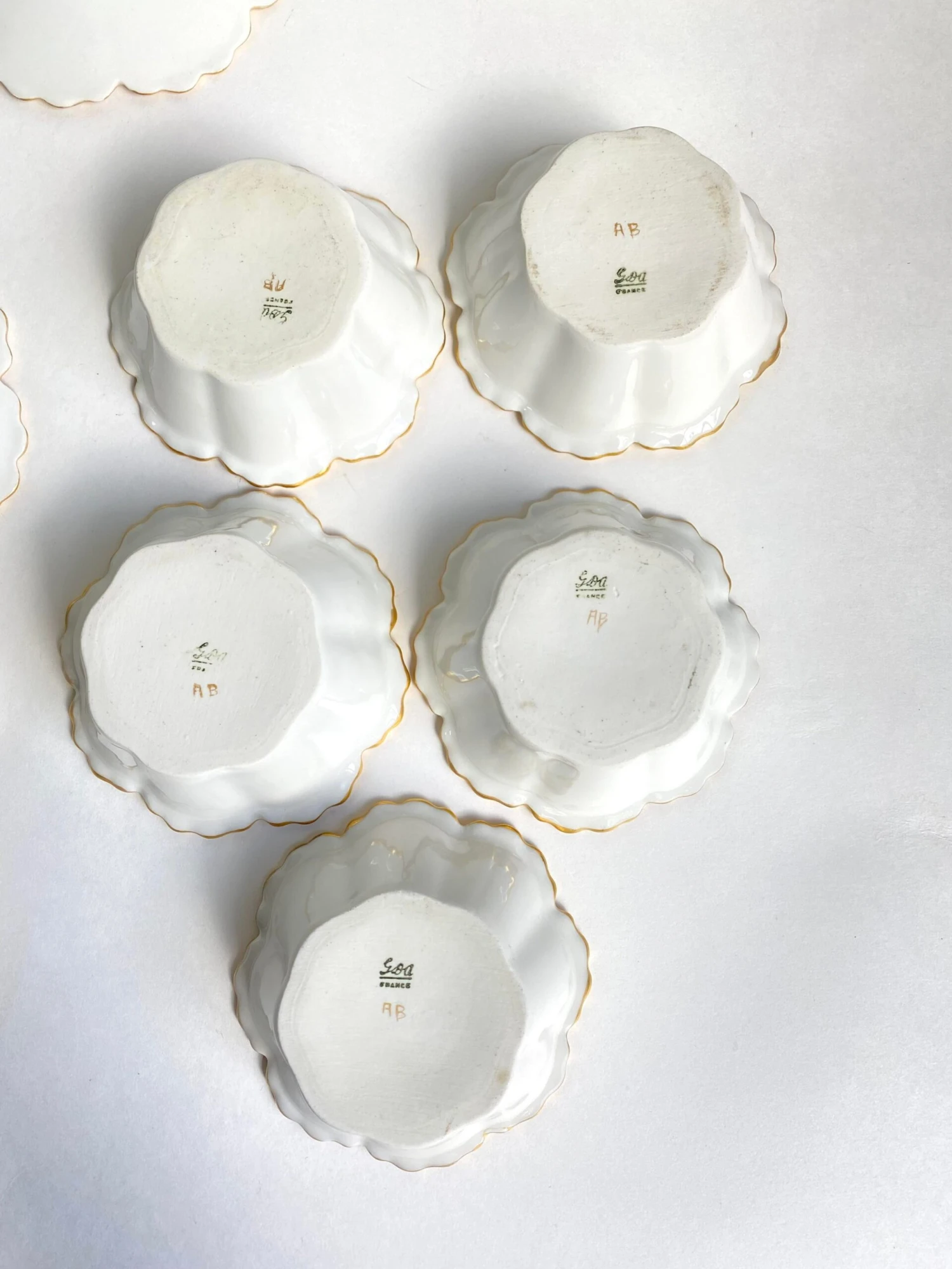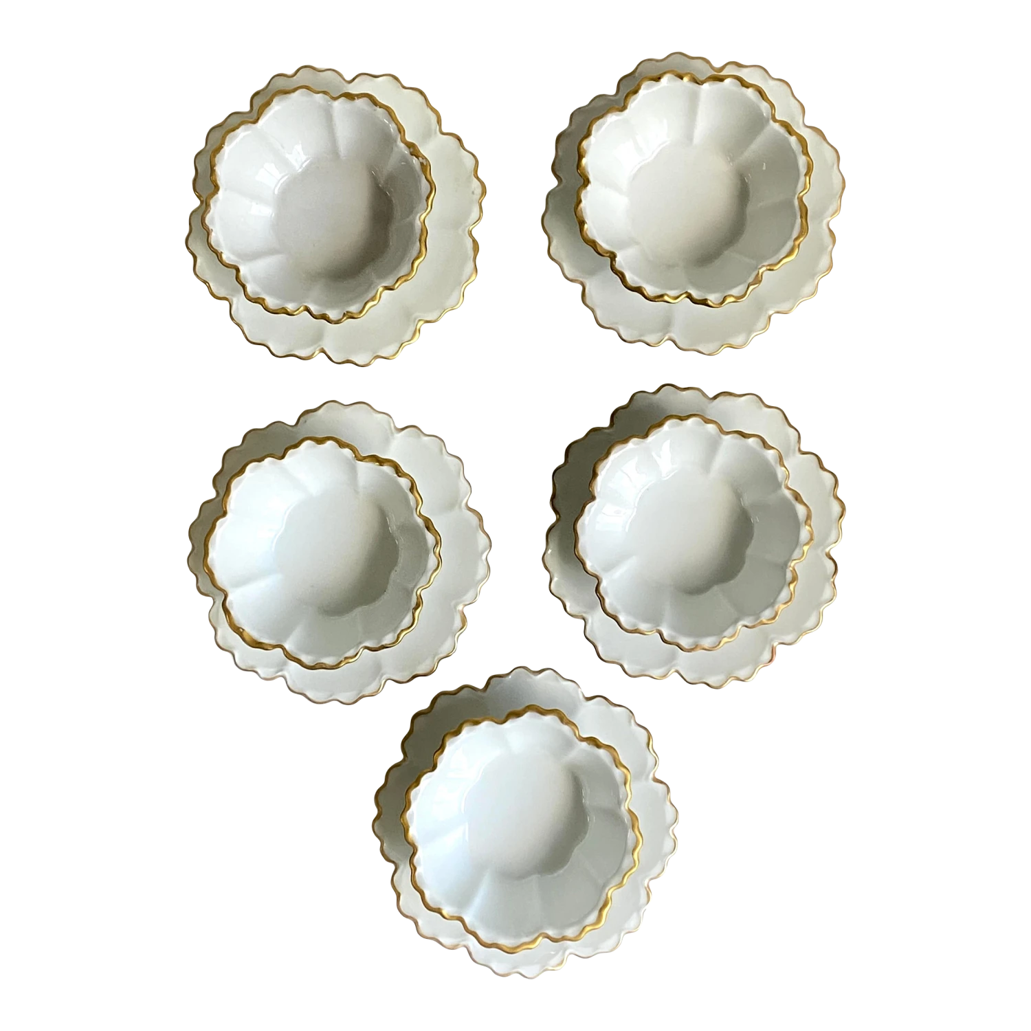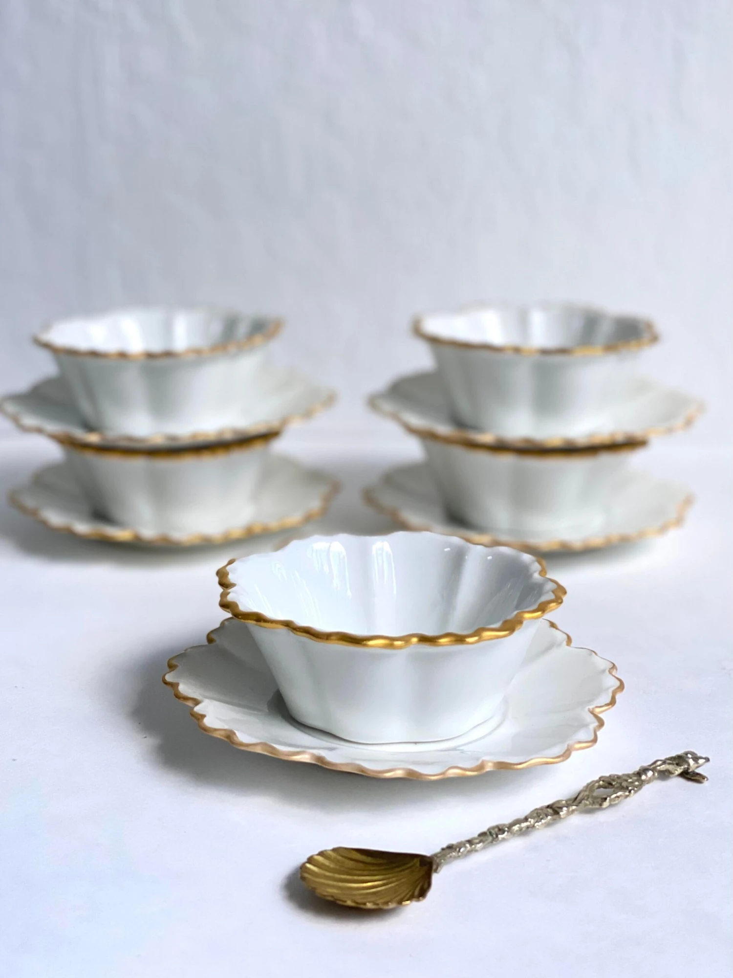 Beautiful set of dessert cups with saucers in a delightful will add a sense of luxury to even the most simple fare. White porcelain with gold details reminiscent of daffodils pair well with many patterns. Includes one extra saucer to make 11 pieces in all.