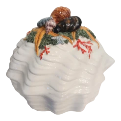 The tureen is stamped made in Italy on the bottom. It features a clam shell shaped bowl with a stunning lid. The lid is adorned with clam shells, oysters and coral design. It’s very Fitz and Floyd style.