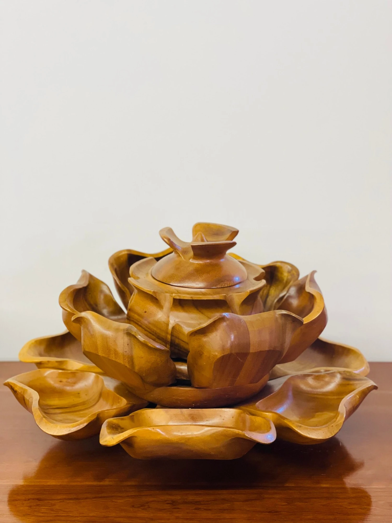 Like new, never used. Gorgeous Polynesian Monkey Pod Serving Set. Perfect conversation piece! Includes 12 bowls and the centerpiece (3 pcs). Measures 12” tall x 20.5” in diameter when set up. Pick up in Radcliff or can ship.