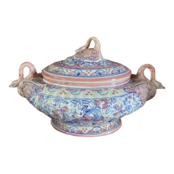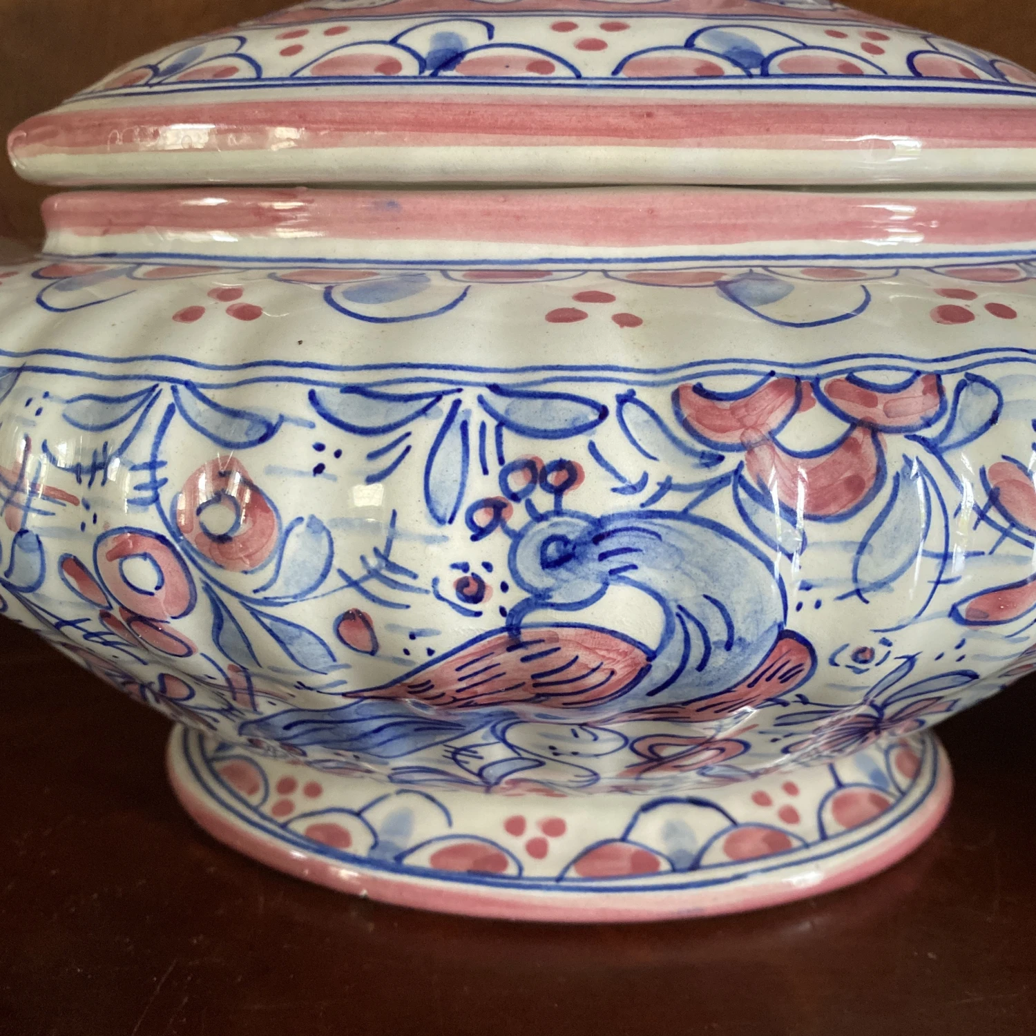 Listing is for a vintage Portuguese ceramic tureen. Pink is the stand out color that offsets blue and white traditional animal and floral hand painted art. Please note the serious chip to rim, but the piece still has tremendous display appeal.