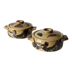 This is a pair of vintage studio pottery covered dishes. Beautiful hand-painted floral design with raised pattern decorate the serving …