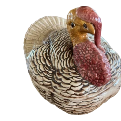 Beautiful ceramic turkey from 1968. Very detailed with gold accents on his tail feathers. Lovely red wattle on his hangs across his face giving him quite a distinctive look. Two pieces include a bowl and lid.