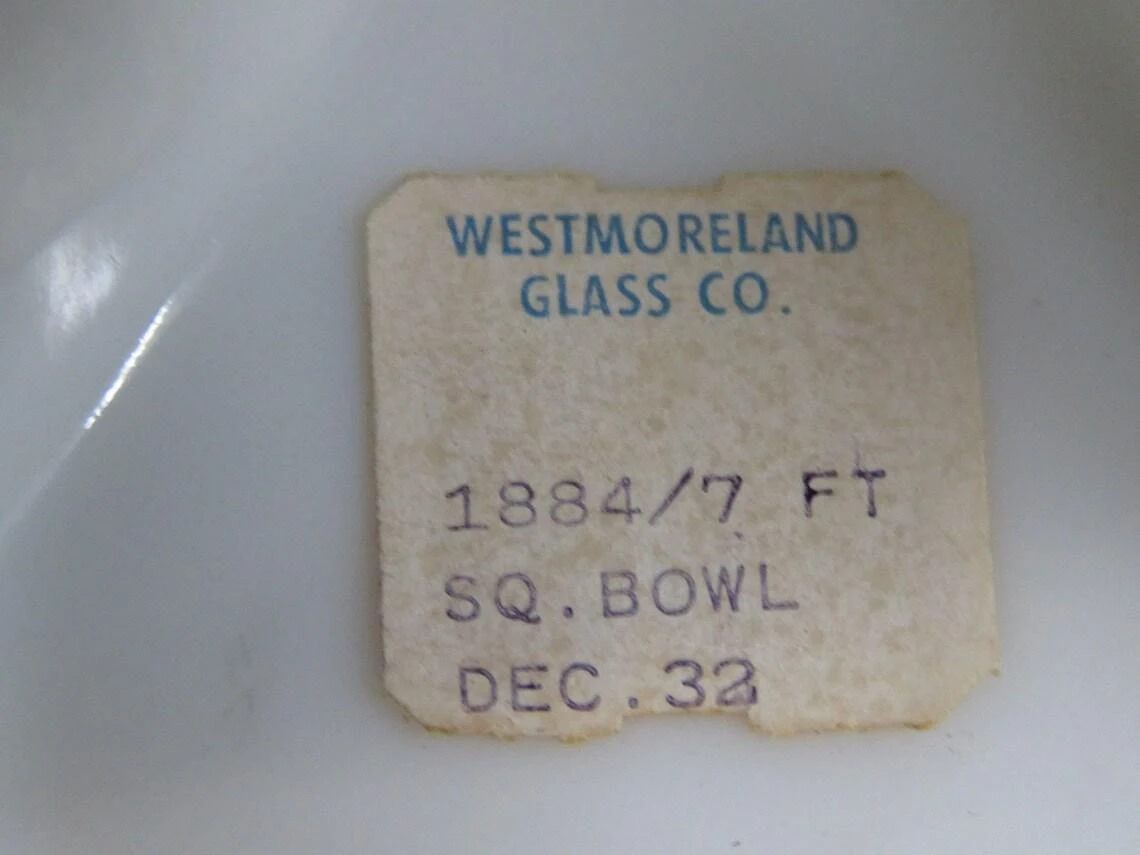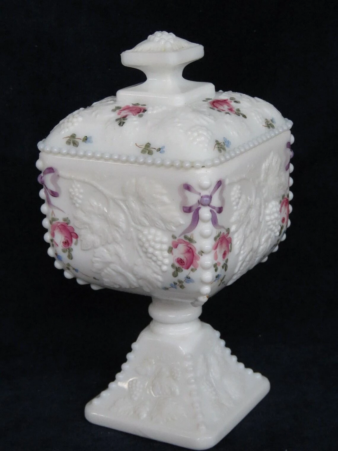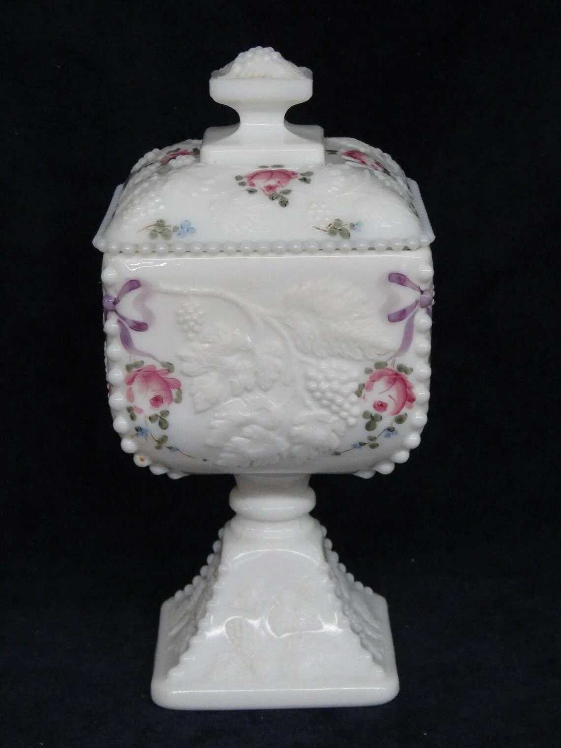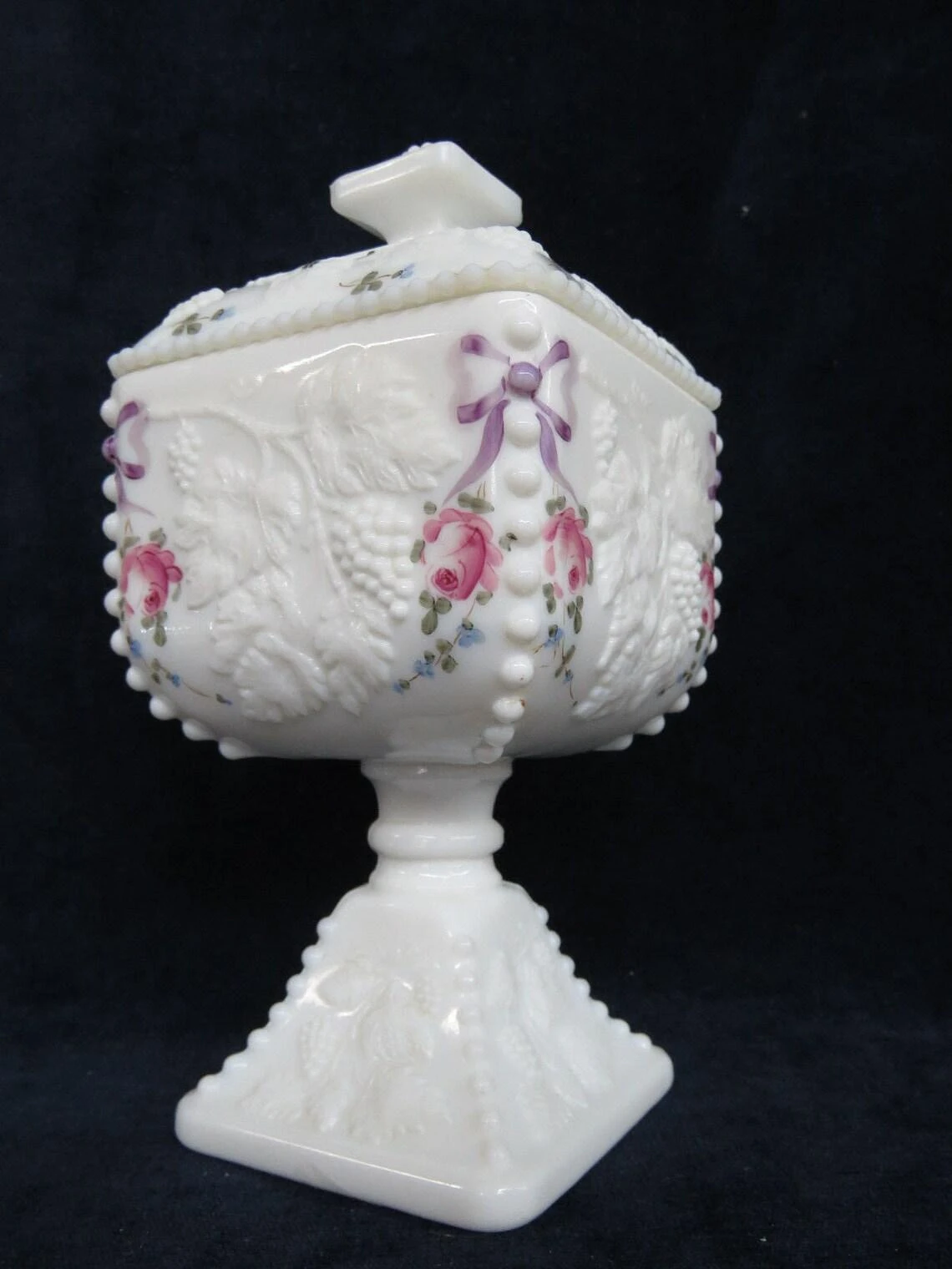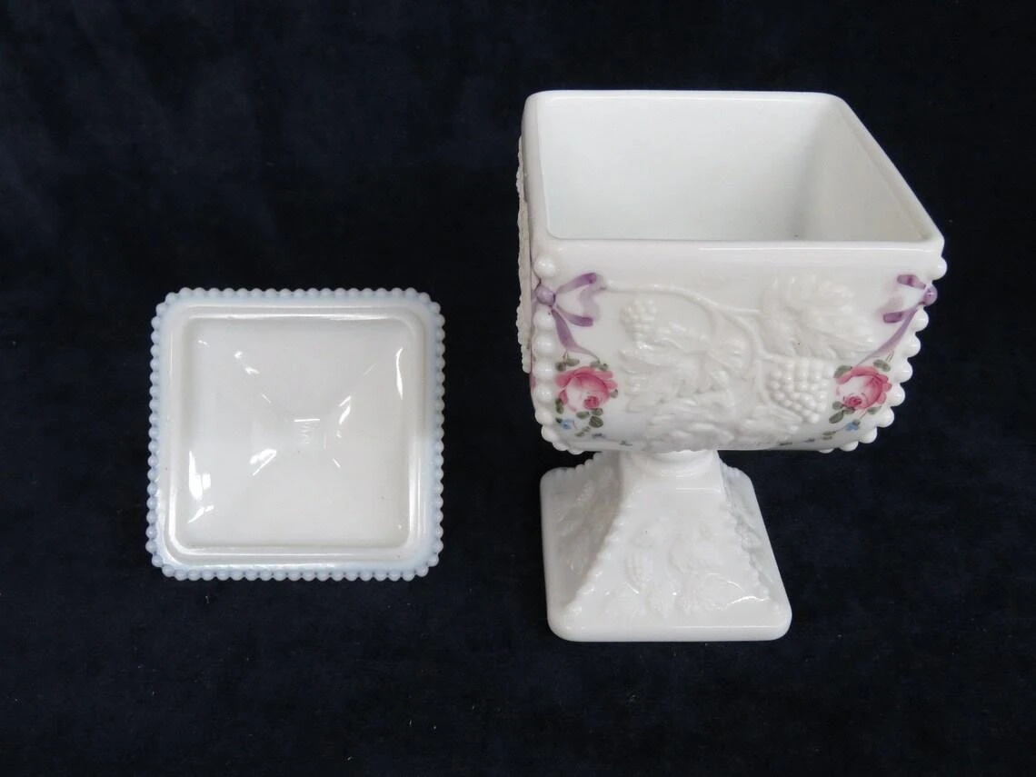 This highly elegant Candy Dish is made out of milk glass, and is in good condition. This beautiful Candy Dish was made by Westmoreland in their famous Beaded Edge design; it features a classic square, pedestal silhouette, lovely patterns of grapes and leaves embossed on the candy dish, and gorgeous painted flowers and ribbons decorating the piece. This piece has a sticker on the bottom that reads: “Westmoreland Glass Co. / 1884/7 Ft / Sq. Bowl / Dec. 32”, see pictures. Please see photos of the measurements for size/scale.