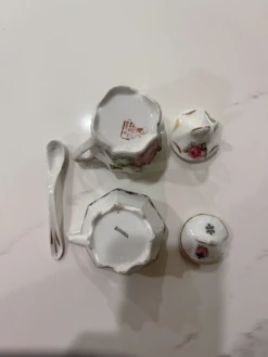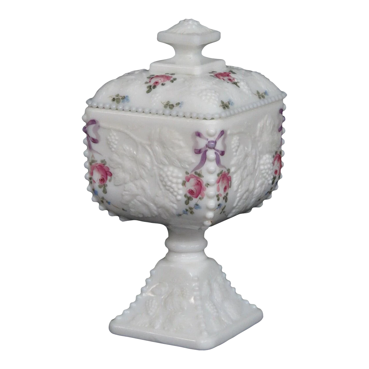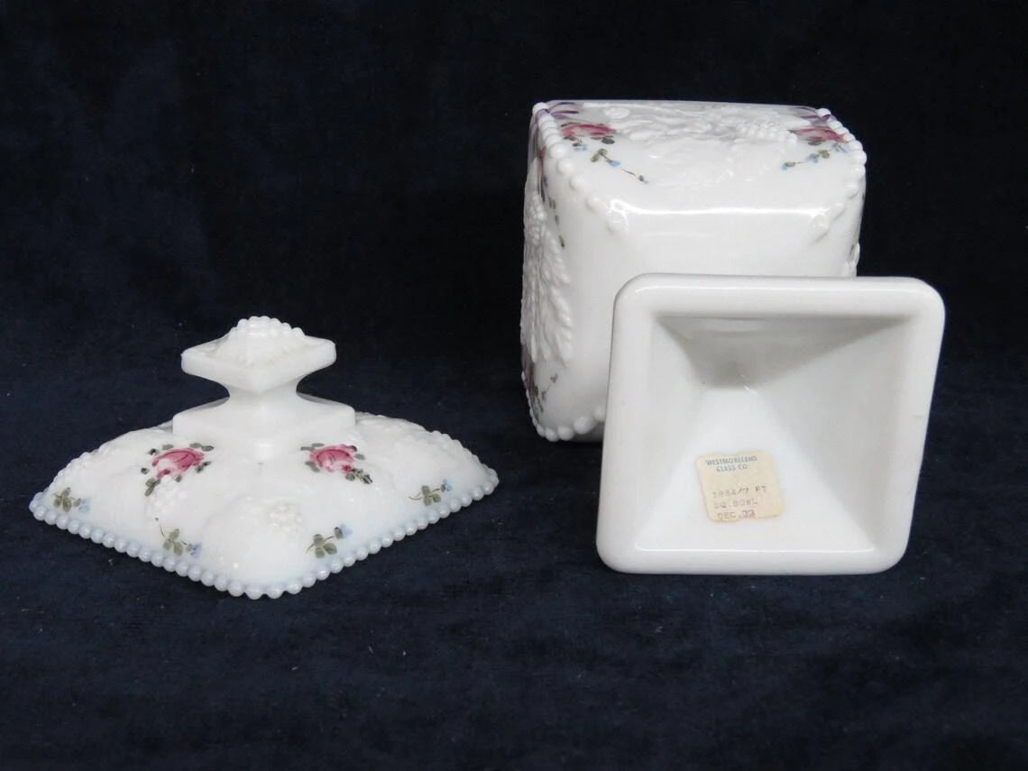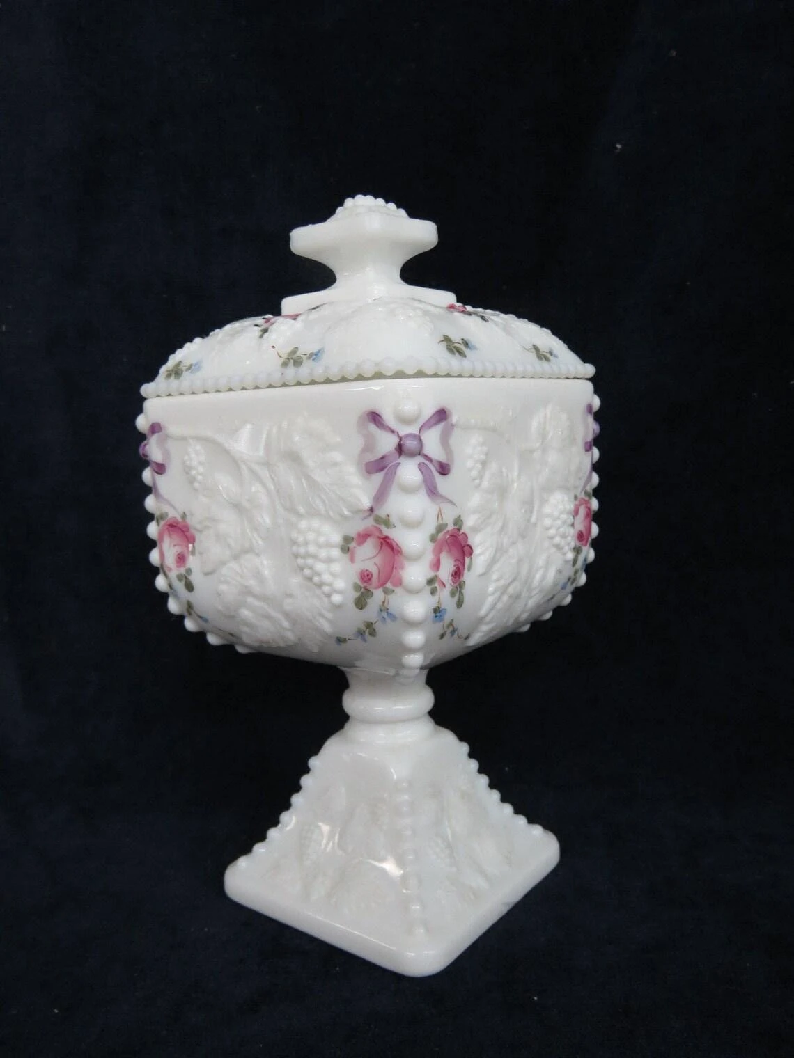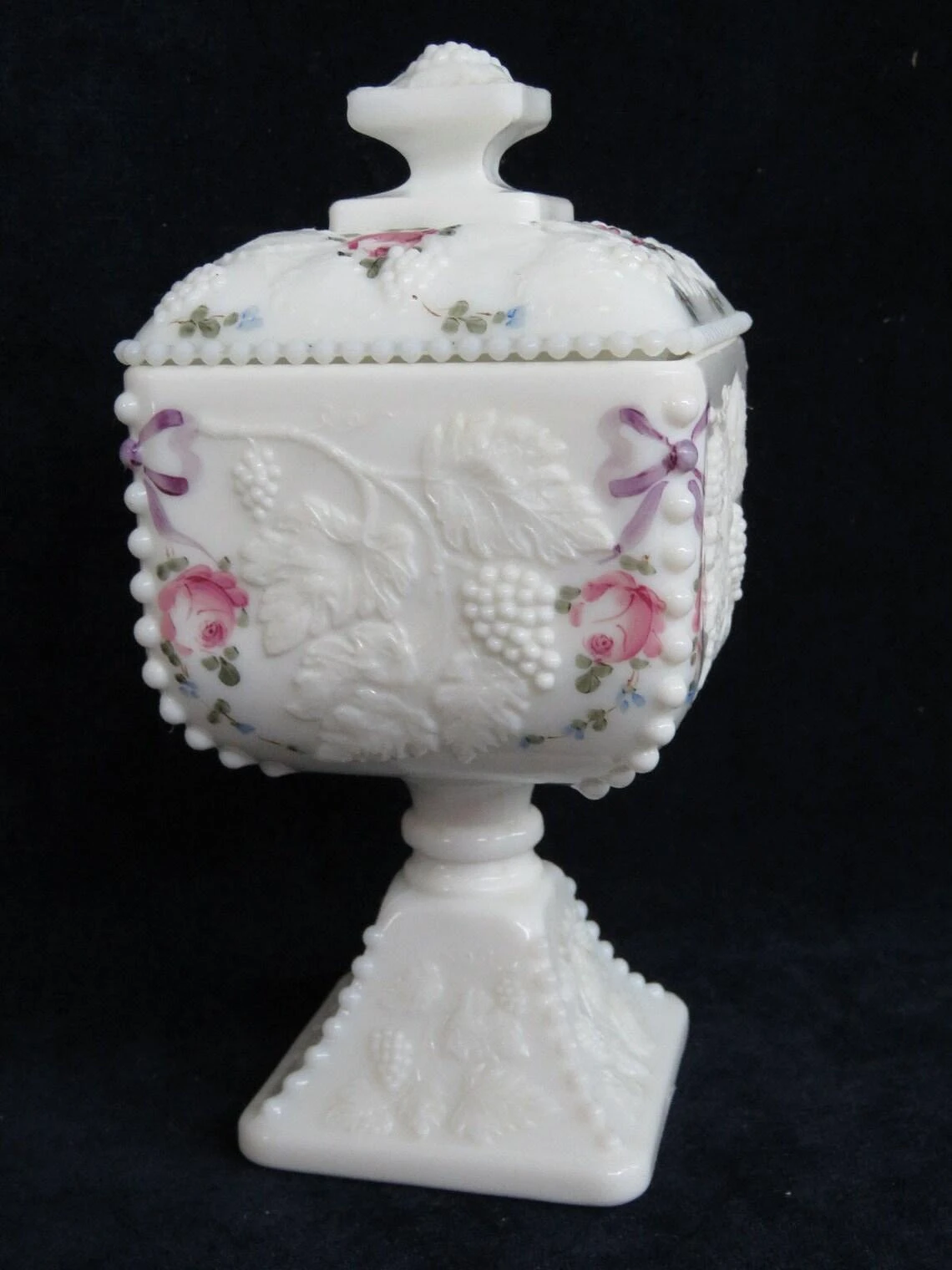 This highly elegant Candy Dish is made out of milk glass, and is in good condition. This beautiful Candy Dish was made by Westmoreland in their famous Beaded Edge design; it features a classic square, pedestal silhouette, lovely patterns of grapes and leaves embossed on the candy dish, and gorgeous painted flowers and ribbons decorating the piece. This piece has a sticker on the bottom that reads: “Westmoreland Glass Co. / 1884/7 Ft / Sq. Bowl / Dec. 32”, see pictures. Please see photos of the measurements for size/scale.